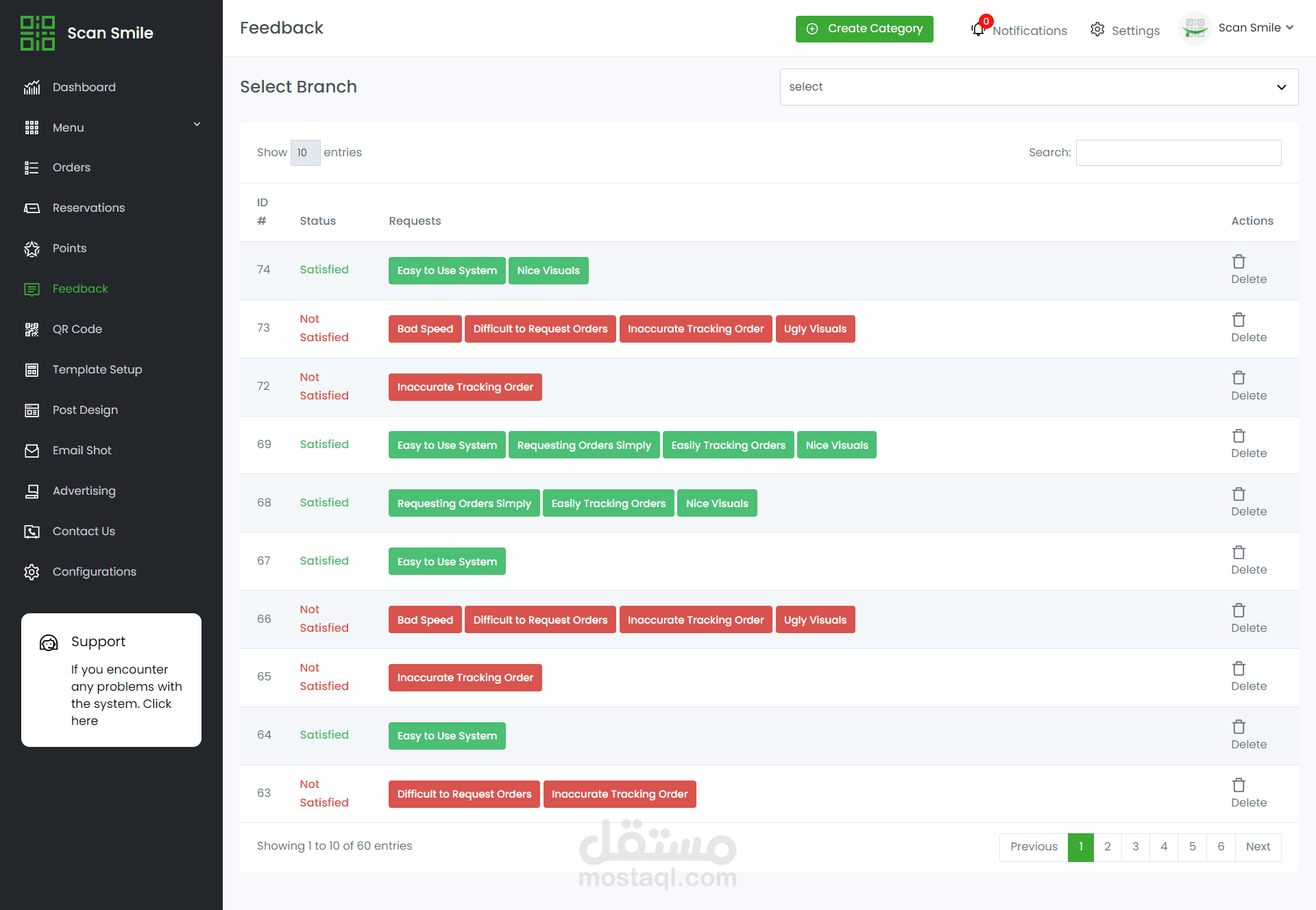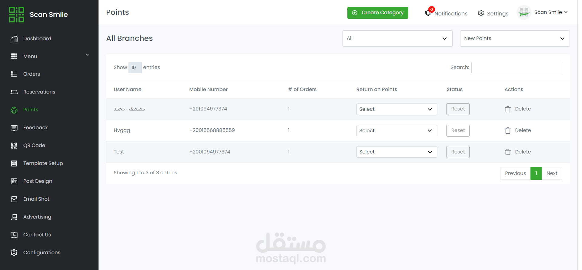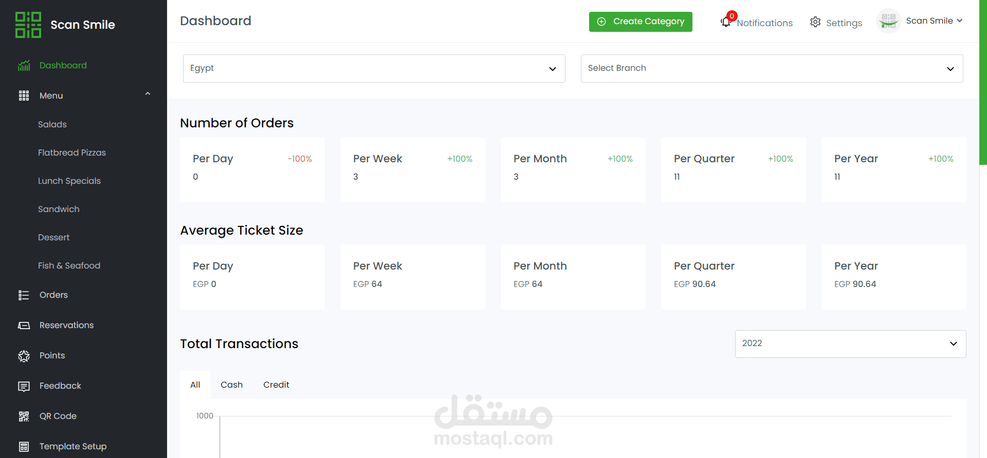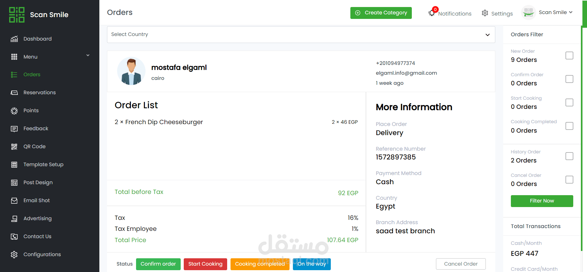 1- Dashboard to display the statistics of the restaurant in terms of branch and country and display all statistics such as the number of orders, the number of funds, and so on