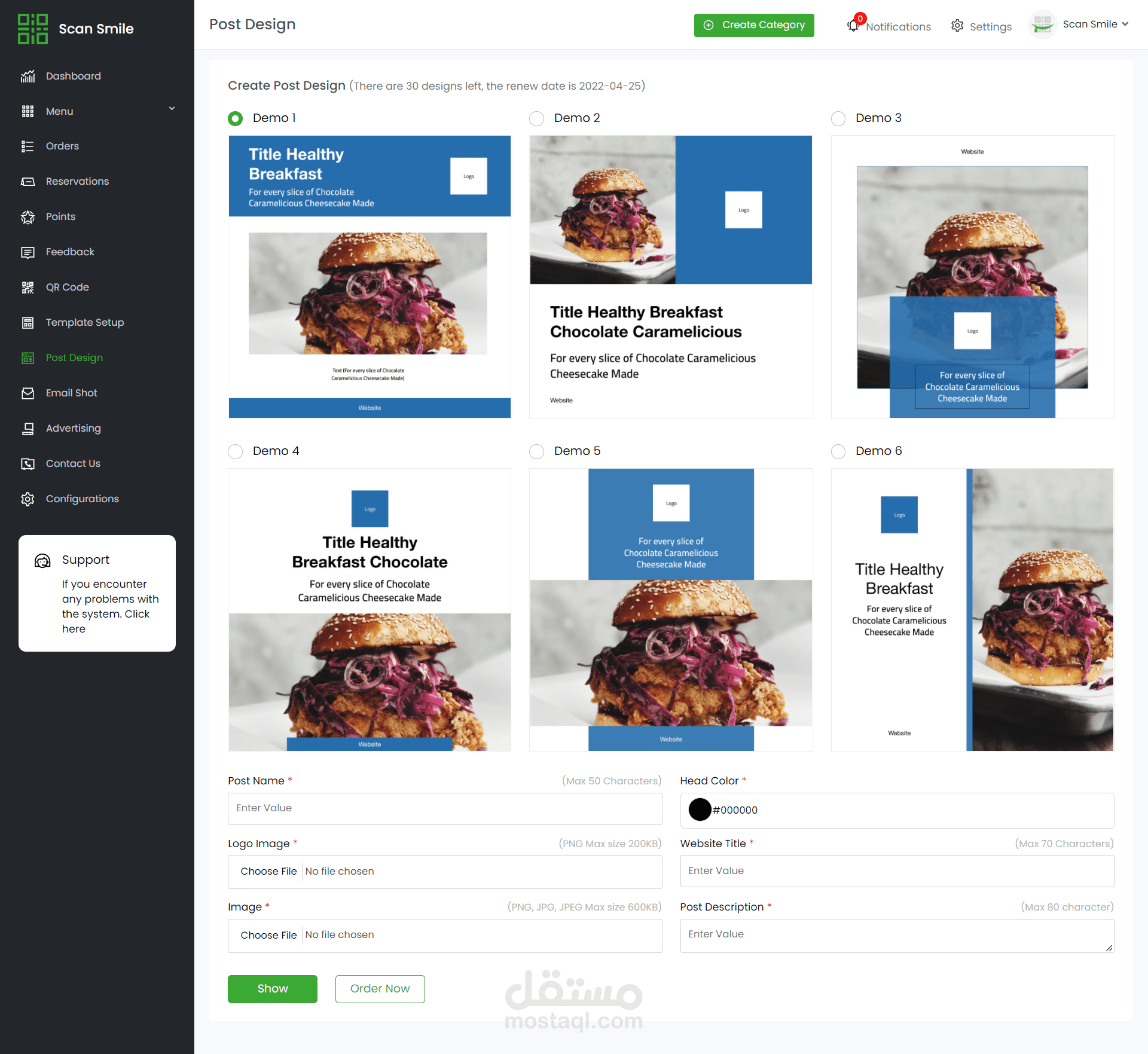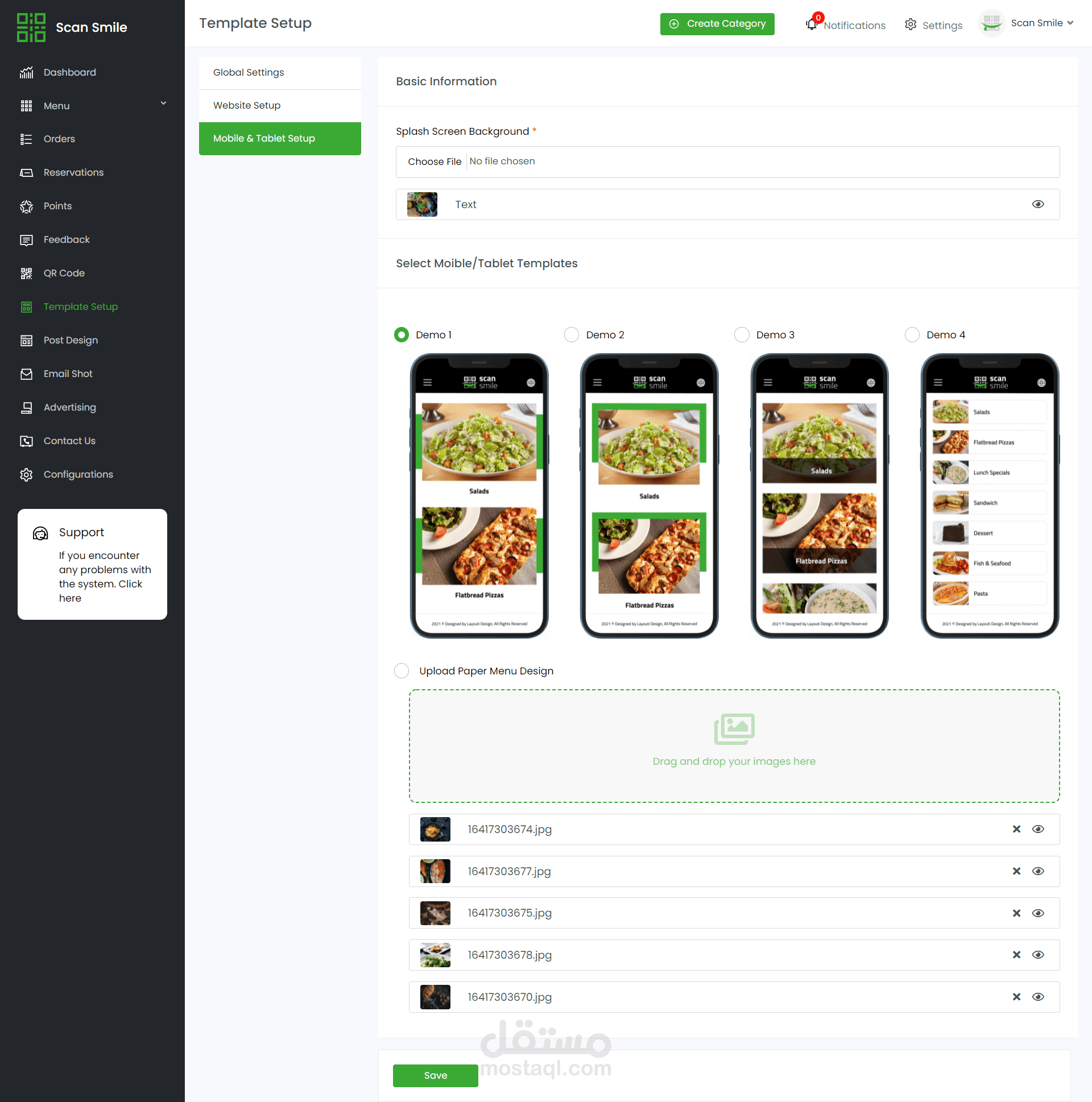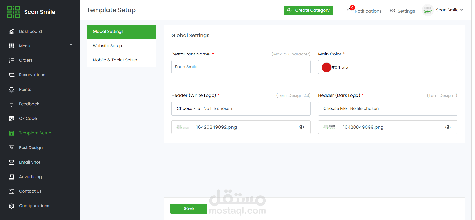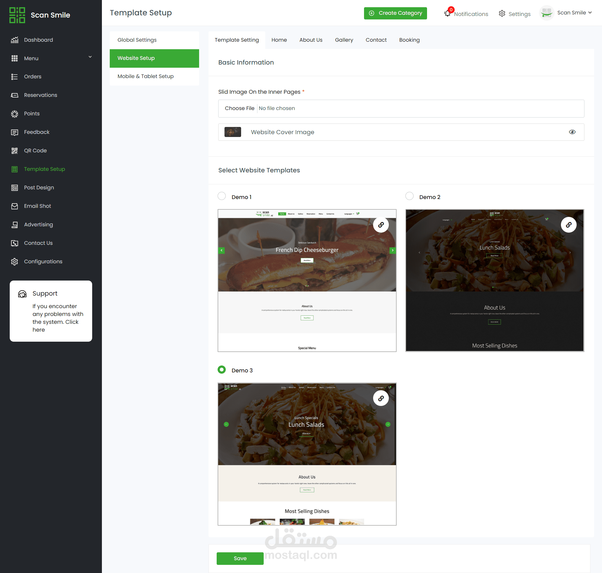 9- Website Setup: There is more than one theme for the restaurant, one of them is chosen and the settings are completed