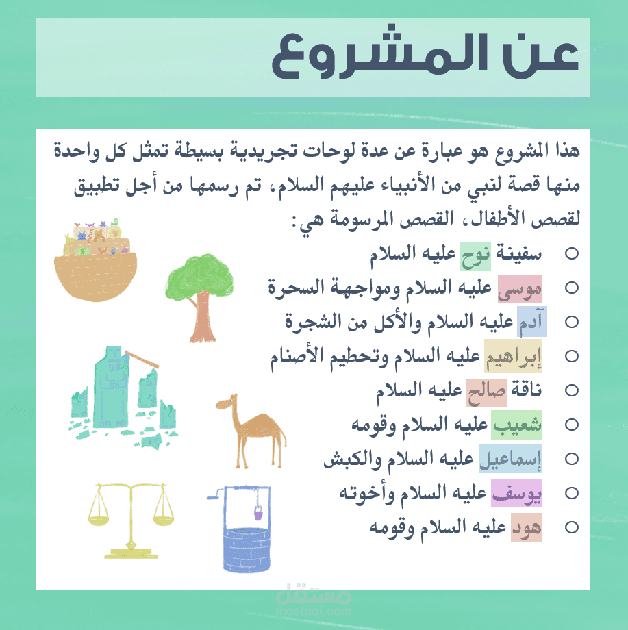هذا المشروع هو عبارة عن عدة لوحات تجريدية بسيطة تمثل كل واحدة منها قصة لنبي من الأنبياء عليهم السلام، تم رسمها من أجل تطبيق لقصص الأطفال.