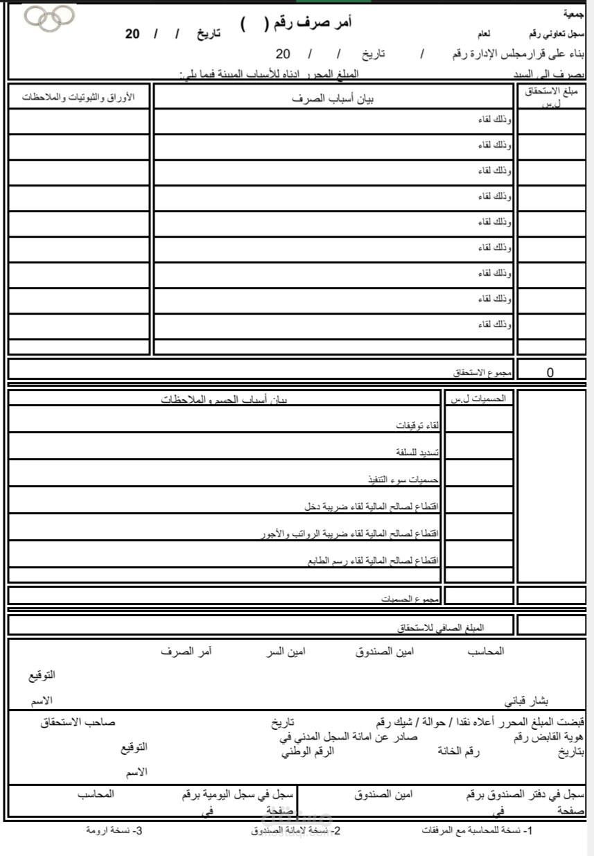 نموذج مؤتمت لأمر صرف يقوم بحساب المبالغ المستحقة للصرف واقتطاع ما يترتب عليها من ضرائب وتوقيفات واحتساب الصافي الواجب تسديده ومعلومات صاحب الاستحقاق وبموجب قرار من مجلس الإدارة إضافة إلى ميزة التفقيط الآلي وملحق معه جدول يقوم بتجميع جميع أوامر الصرف في الملف في جدولية احترافية