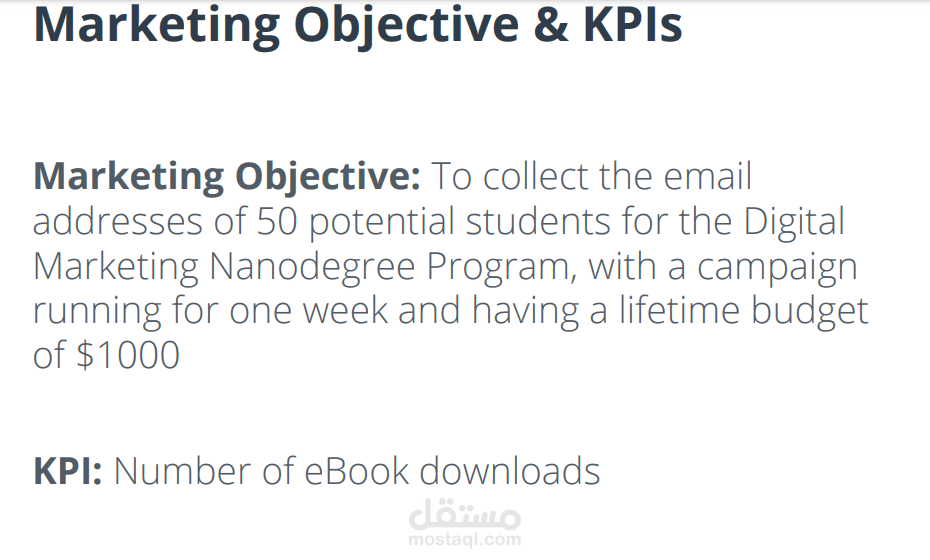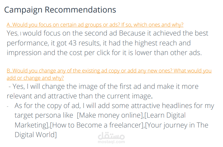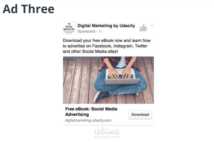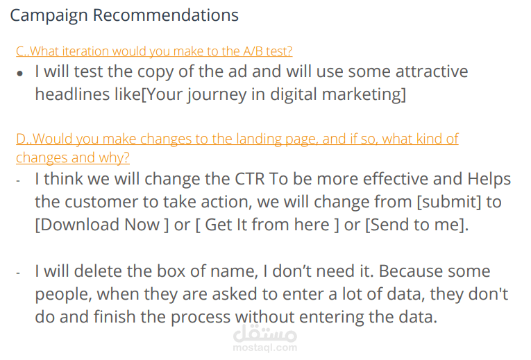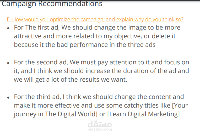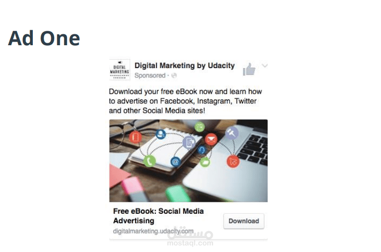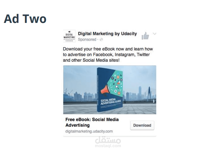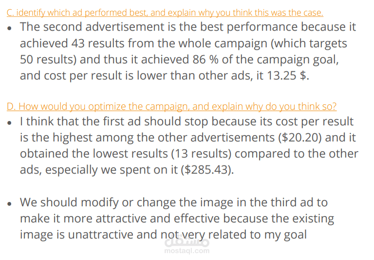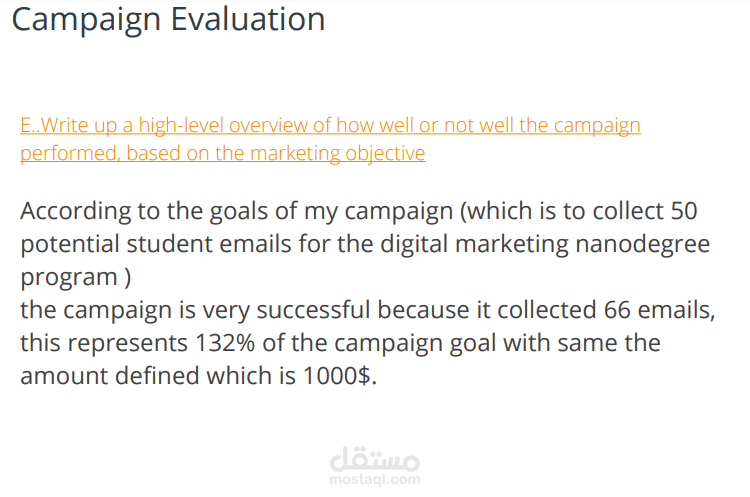 في هذا المشروع قمت بتقييم حملة إعلانية لشركه يوداستي باللغة الإنجليزية تم انشائها علي الفيسبوك علي هيئة 3 إعلانات متشابهة وتم عمل اختبار A/B علي الصور , قمت باقتراح بعض التعديلات علي الصور المستخدمة والمحتوي المكتوب ليتناسب مع الجمهور المستهدف والتعديل علي صفحة الهبوط لتكون اكثر سهولة للعلاء المحتملين, وبالفعل نجحت التعديلات علي الحملة وحققت الأهداف المطلوبة.