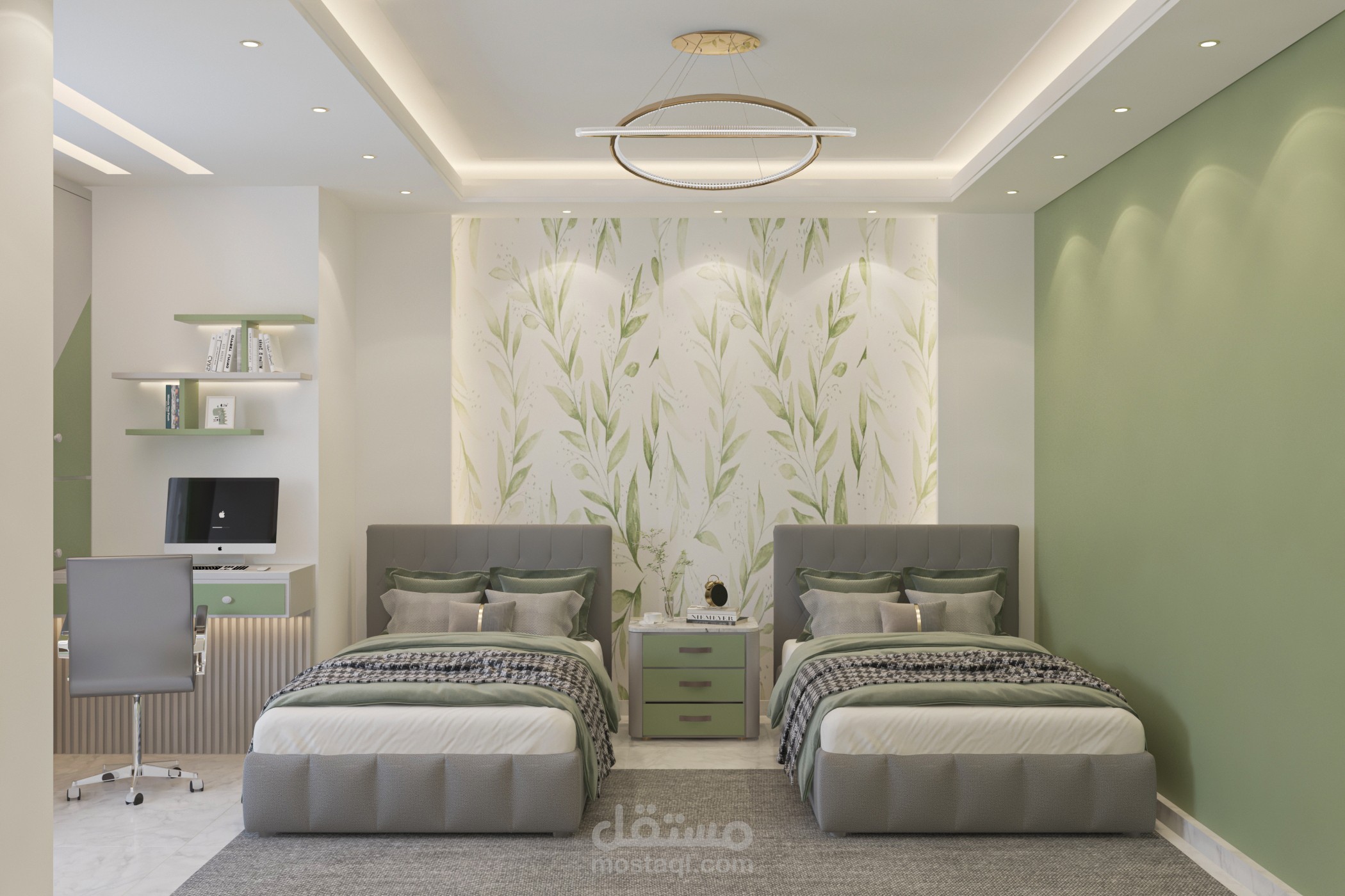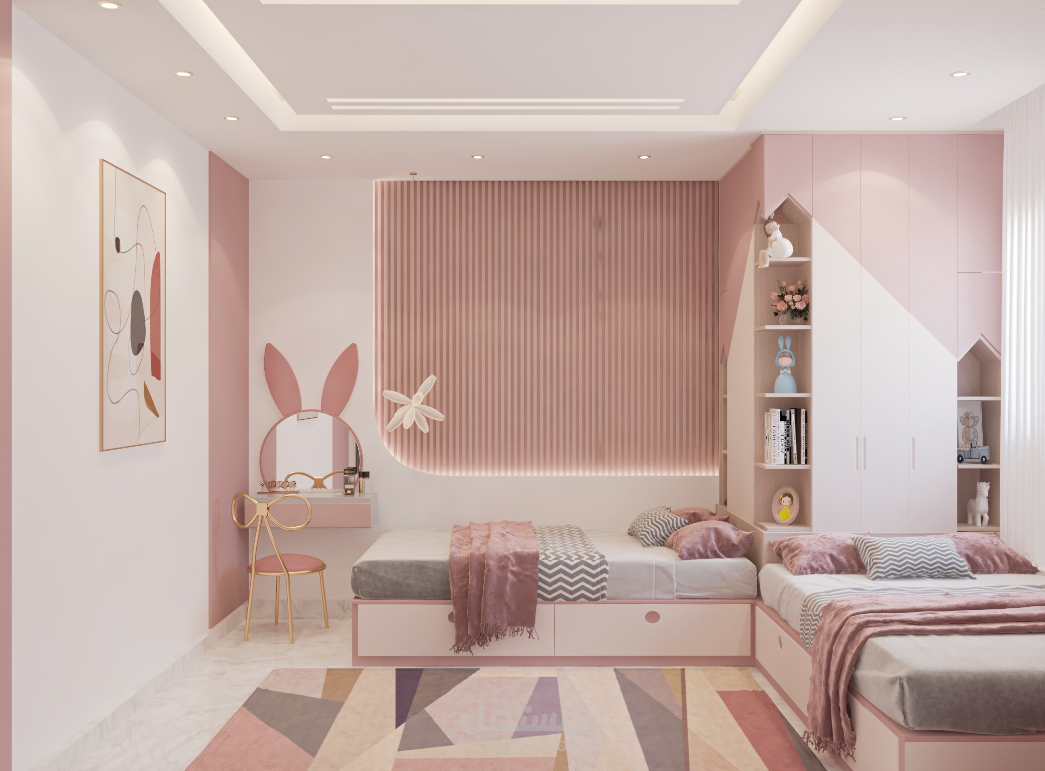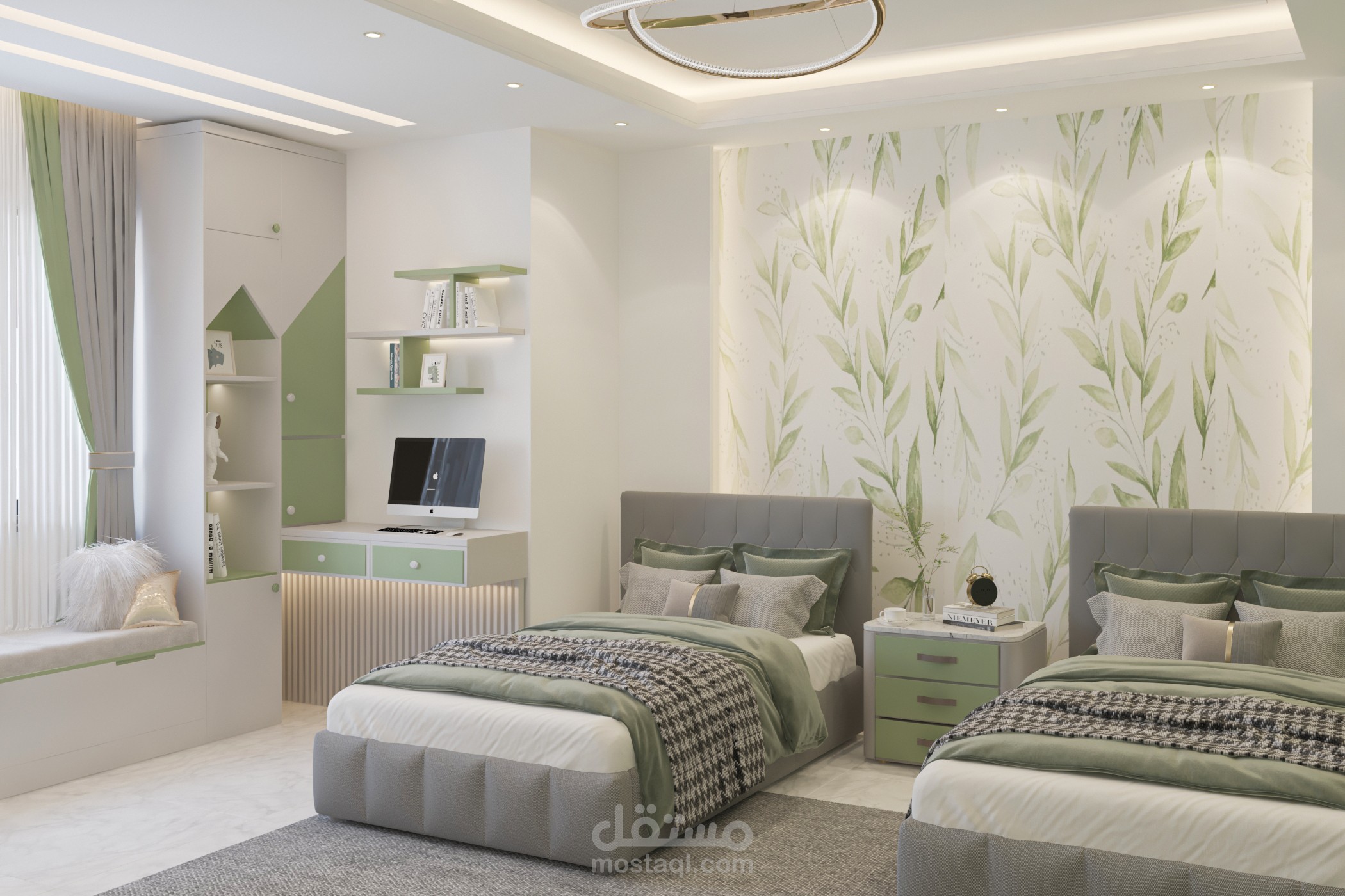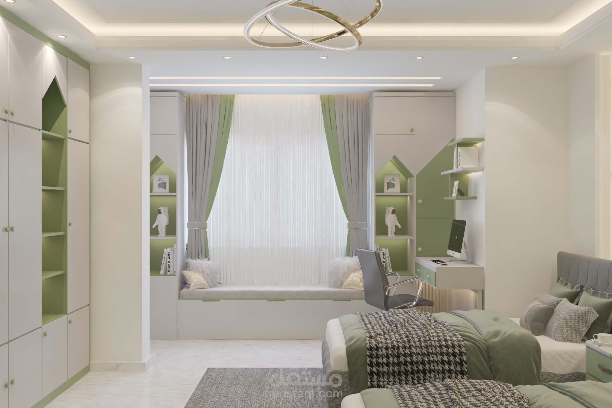 تصميم غرفة أولاد تم تخصيص جزء للمكاتب مع توزيع الإضاءة بشكل منظم وغرفه لبنتين وغرفة ماستر بألوان هادئة ومتناسقه من ضمن تصميمات شقة مساحتها 160م2