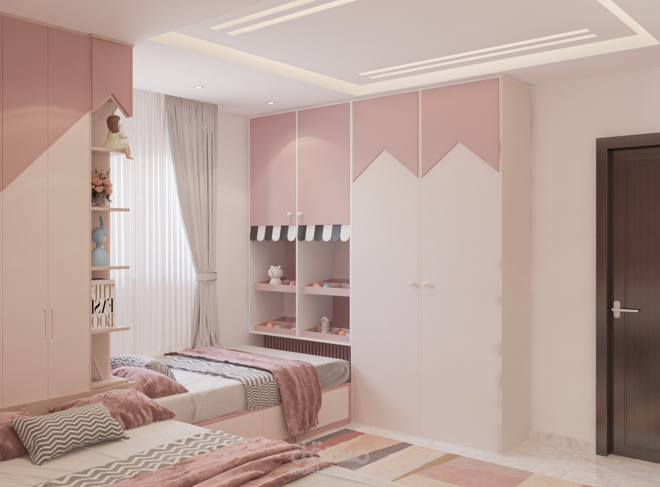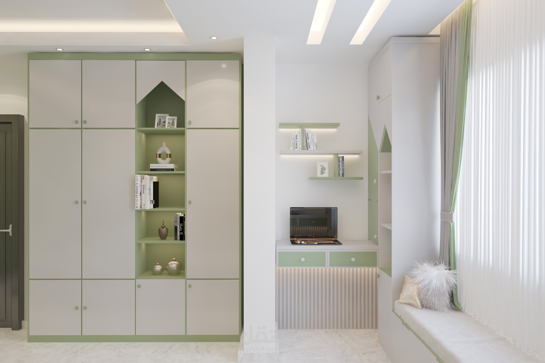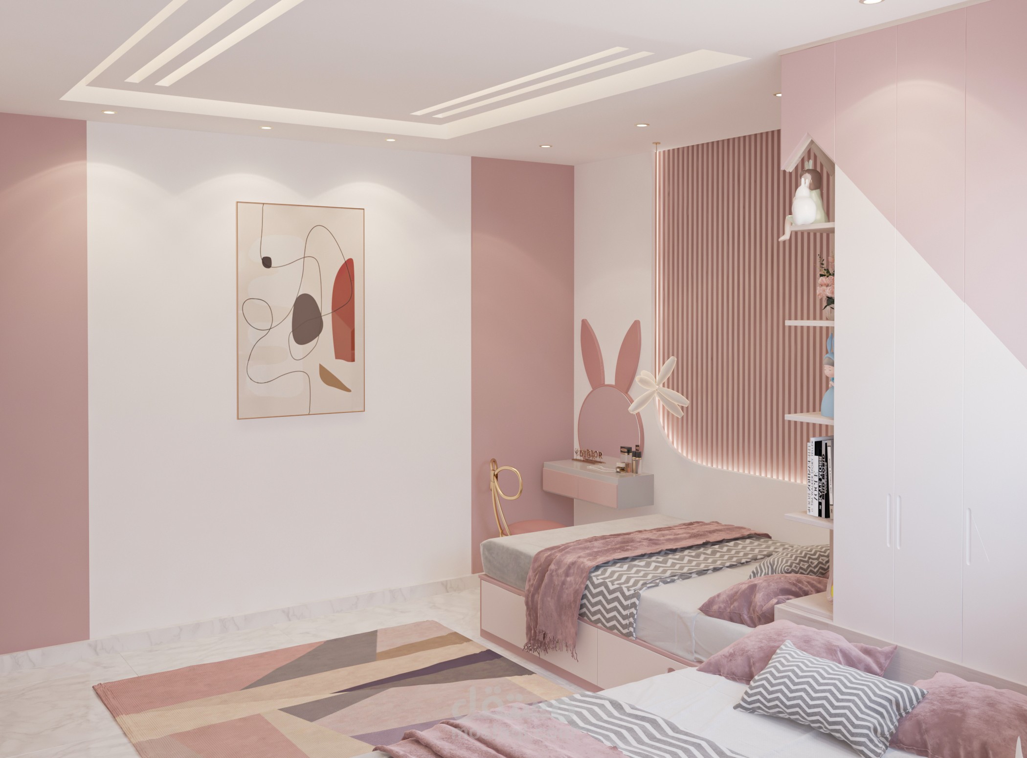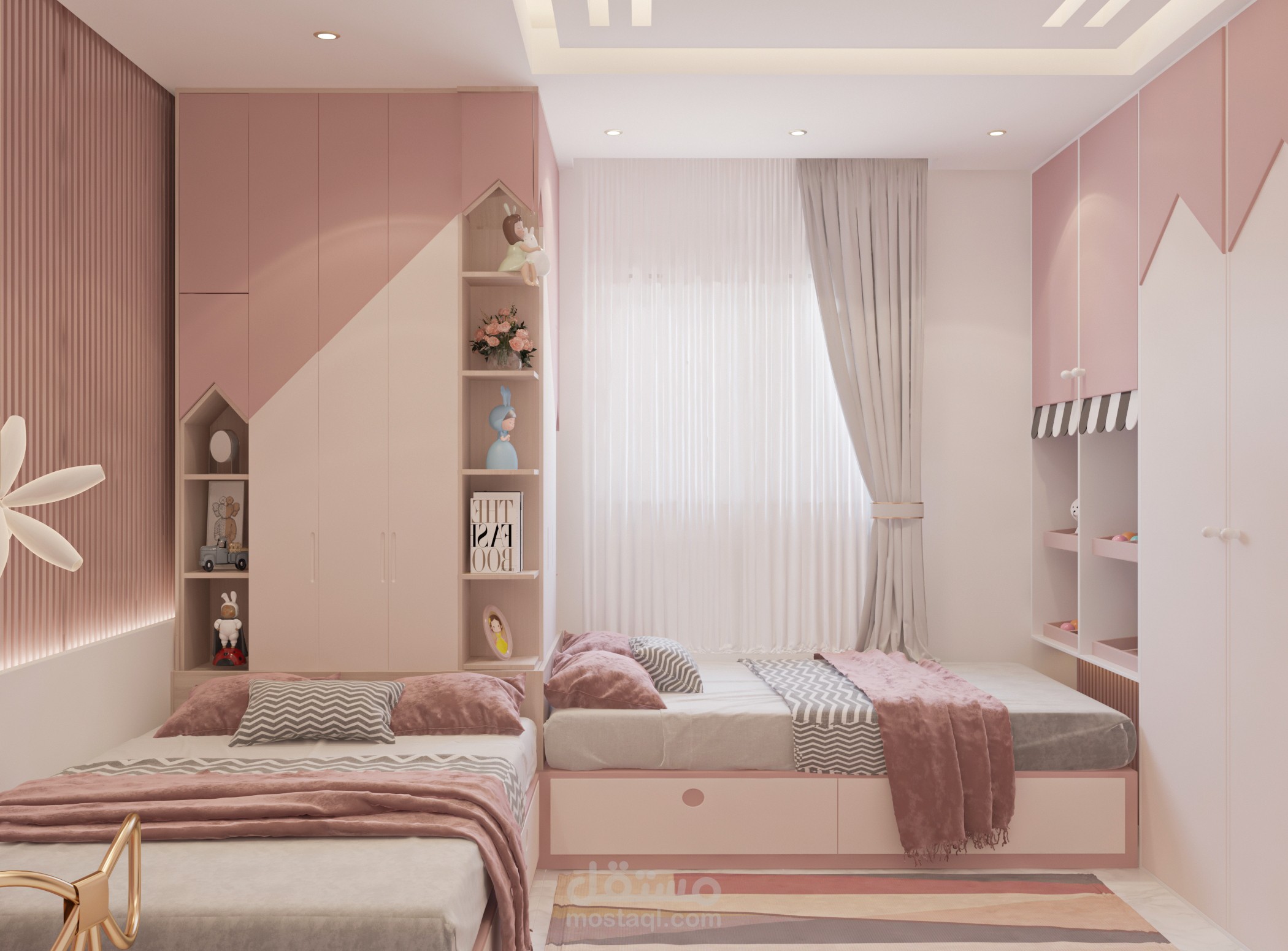 تصميم غرفة أولاد تم تخصيص جزء للمكاتب مع توزيع الإضاءة بشكل منظم وغرفه لبنتين وغرفة ماستر بألوان هادئة ومتناسقه من ضمن تصميمات شقة مساحتها 160م2
