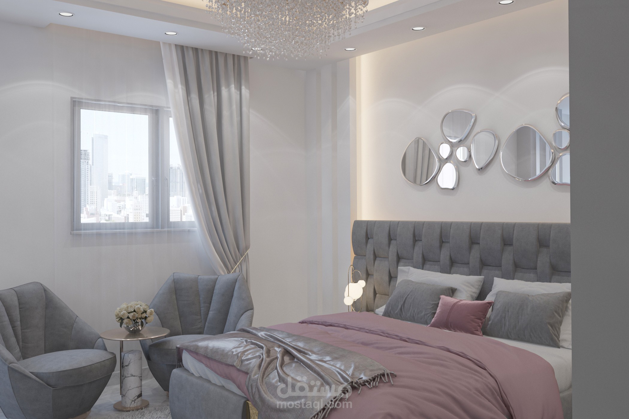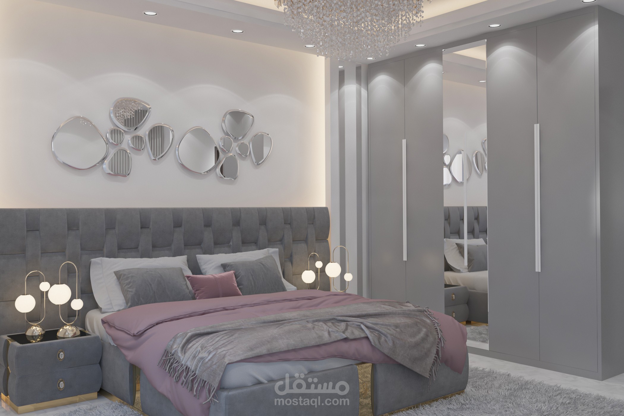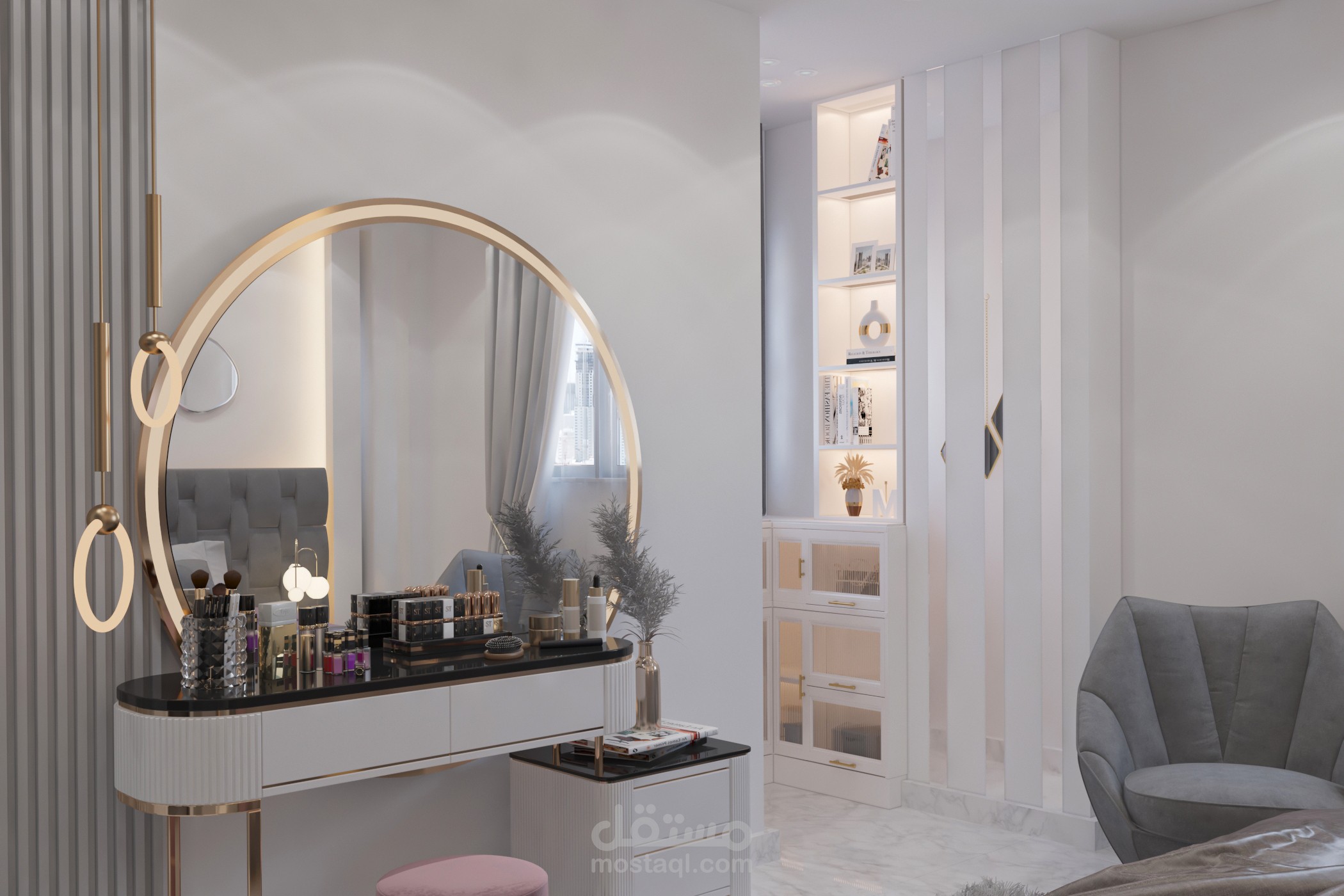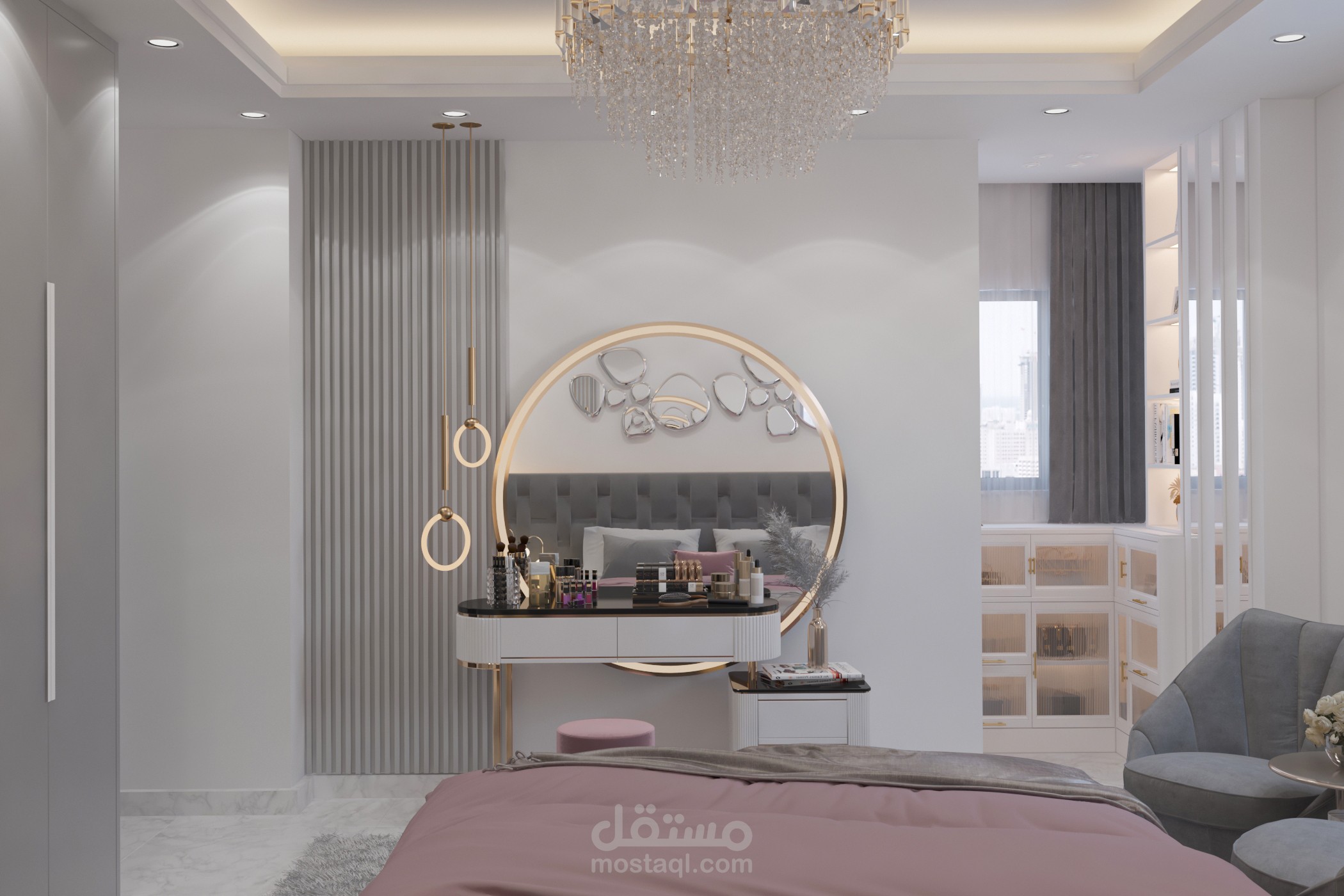 تصميم غرفة أولاد تم تخصيص جزء للمكاتب مع توزيع الإضاءة بشكل منظم وغرفه لبنتين وغرفة ماستر بألوان هادئة ومتناسقه من ضمن تصميمات شقة مساحتها 160م2