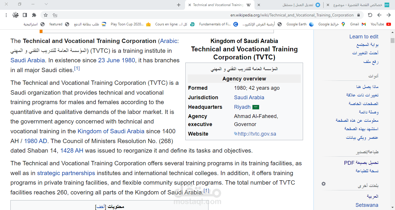 هذه إحدى المقالات التي قمت برفعها على موسوعة ويكيبيديا الشهيرة طبعا على النسخة الإنجليزية من الموسوعة وهي مقالة عن المؤسسة العامة للتدريب التقني والمهني أو بالإنجليزية Technical and Vocational Training Corporation وهي مؤسسة سعودية حكومية معنية بالتدريب التقني والمهني