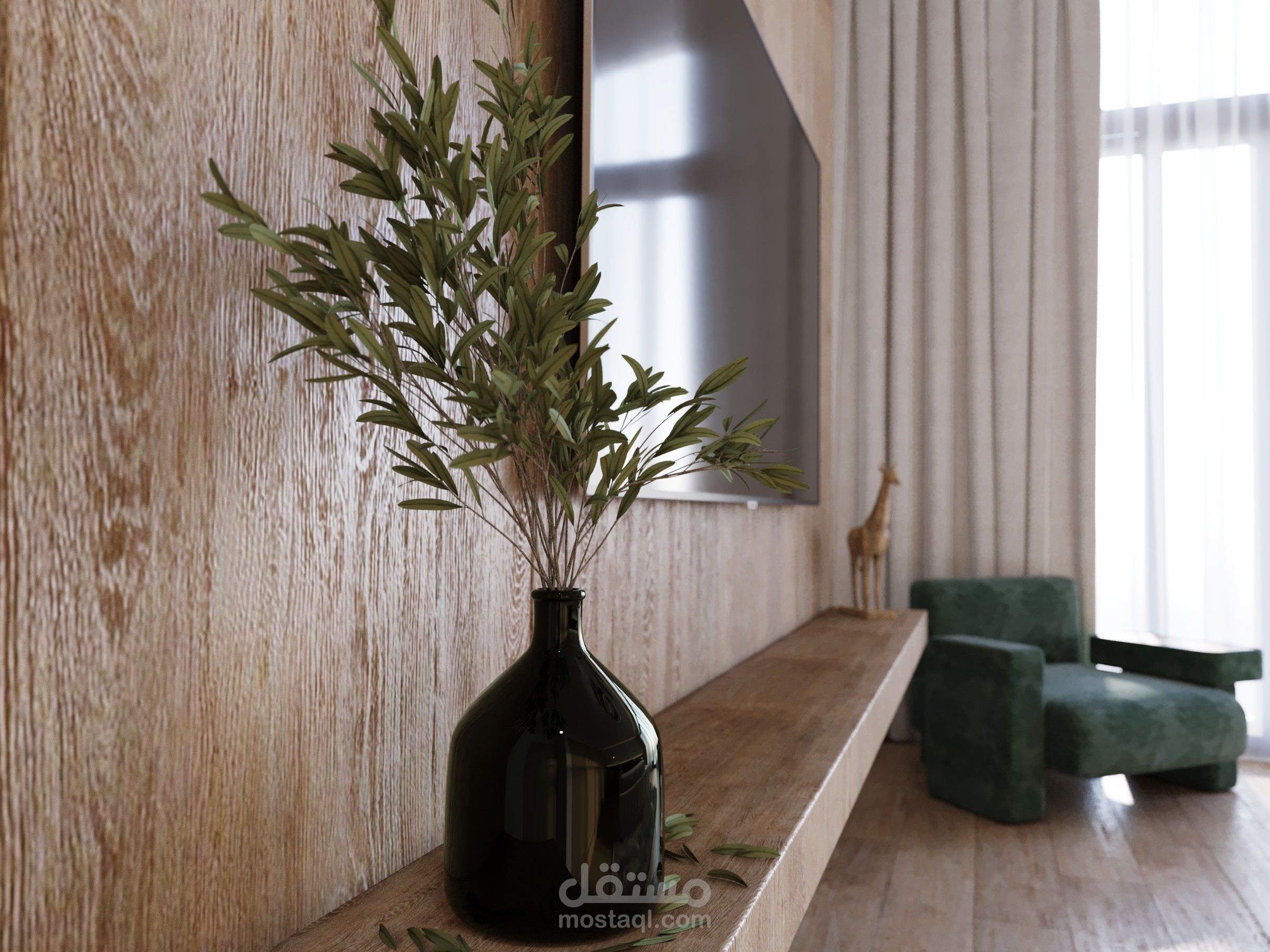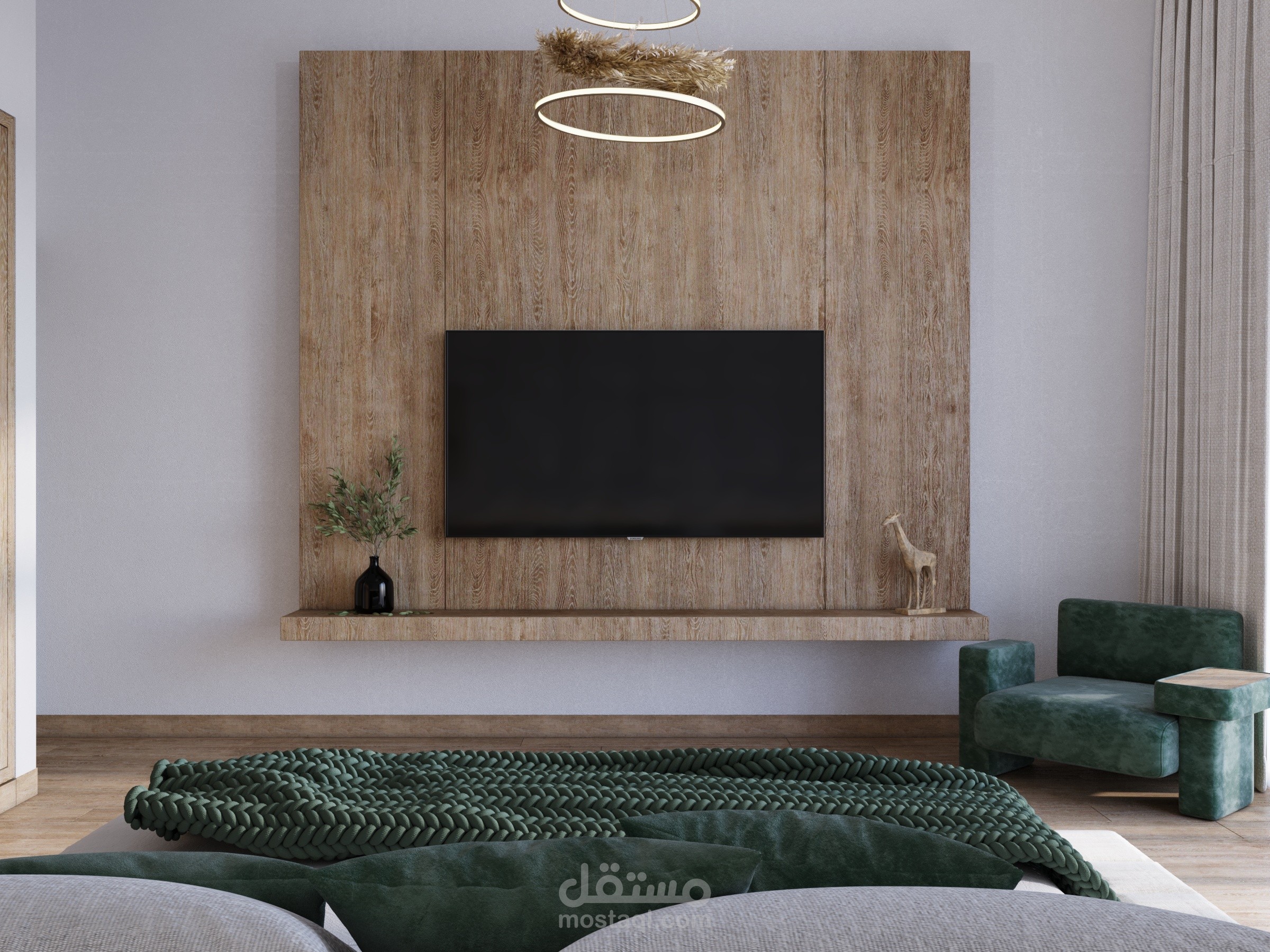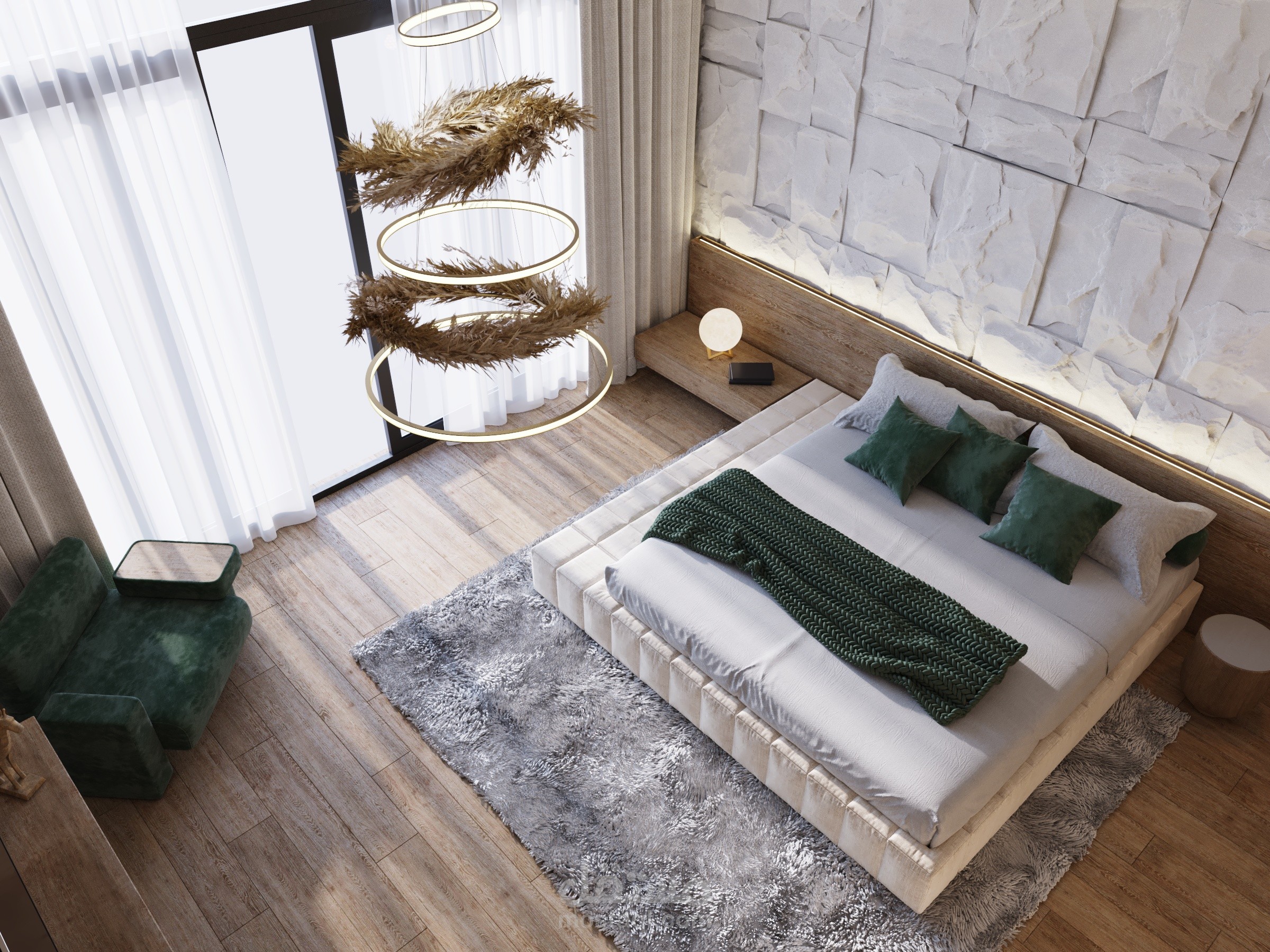 Simple bedroom with natural stone and wood.