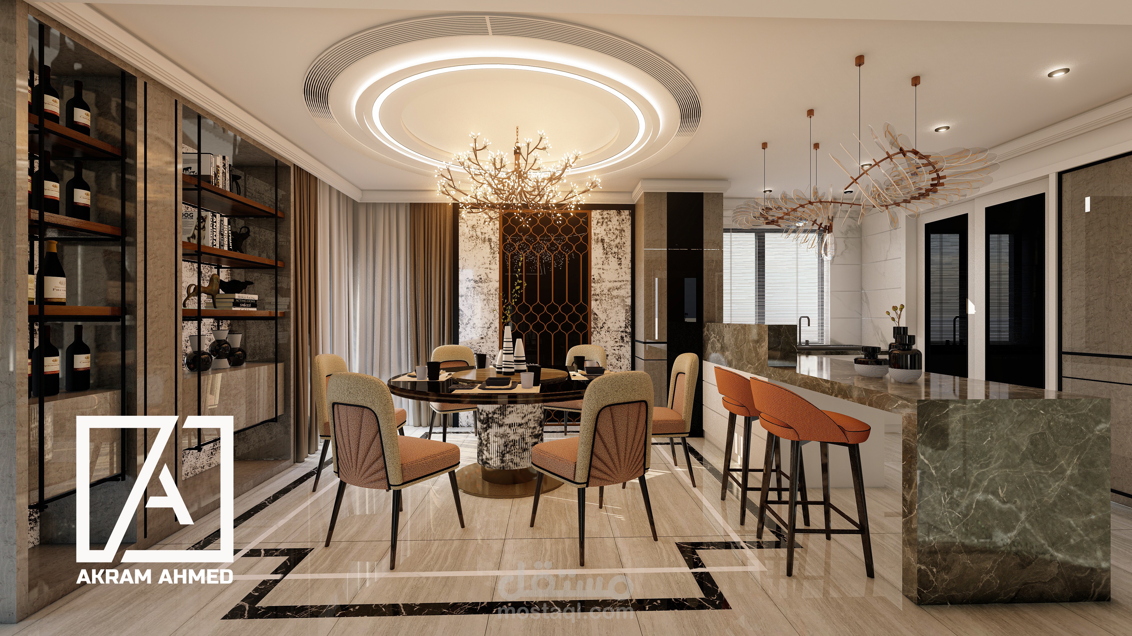تصميم داخلي لصالة معيشة تشمل مكان الجلوس وغرفة الطعام