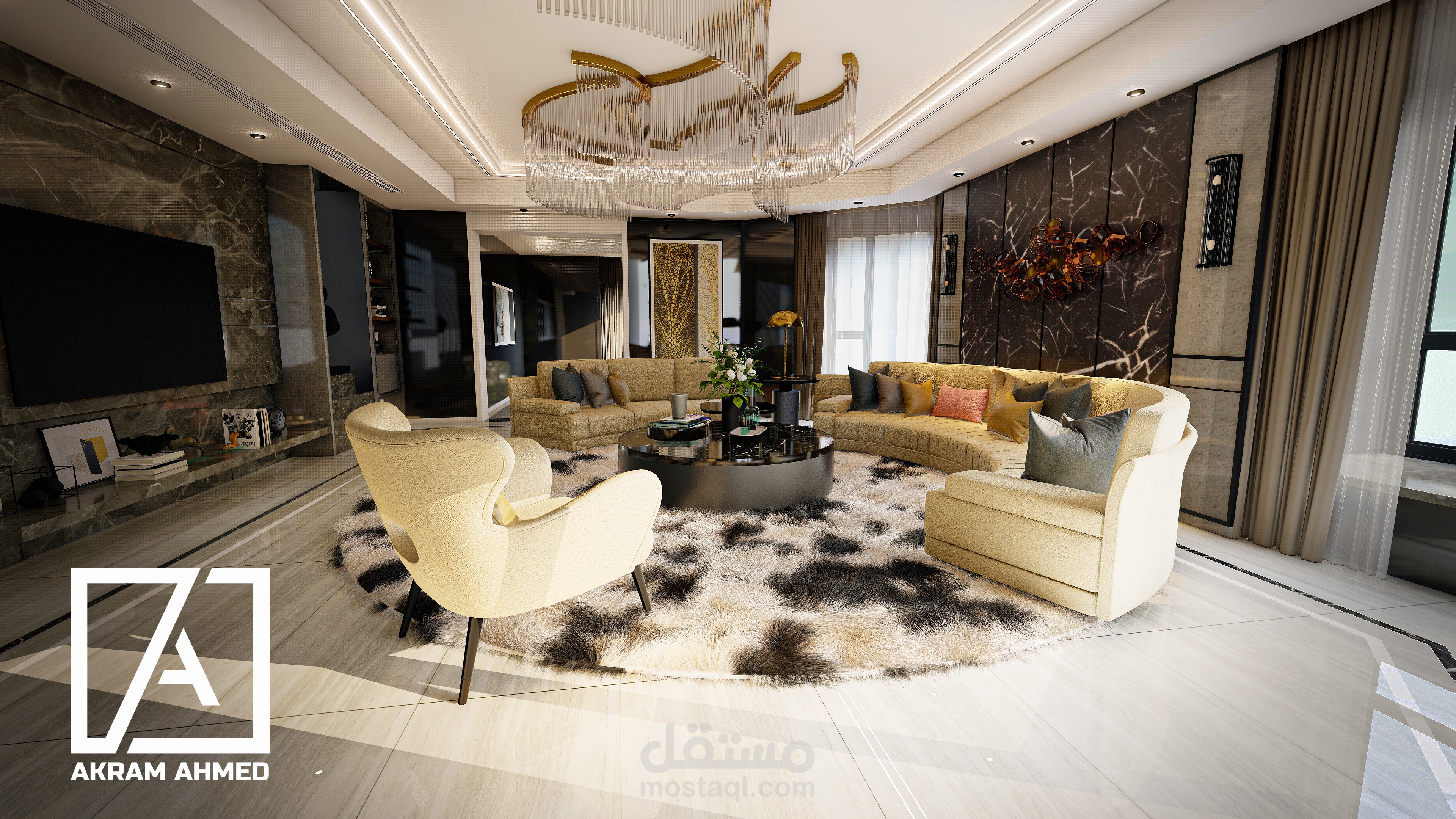 تصميم داخلي لصالة معيشة تشمل مكان الجلوس وغرفة الطعام ويتمتع التصميم بالاضاءة الطبيعية وتناسق الخامات المستخدمة وكذلك الانسجام بين ألوان جميع عناصر التصميم وتم الاهتمام بتوزيع الأثاث بحيث يوفر كل وسائل الراحة وسهولة الحركة.
