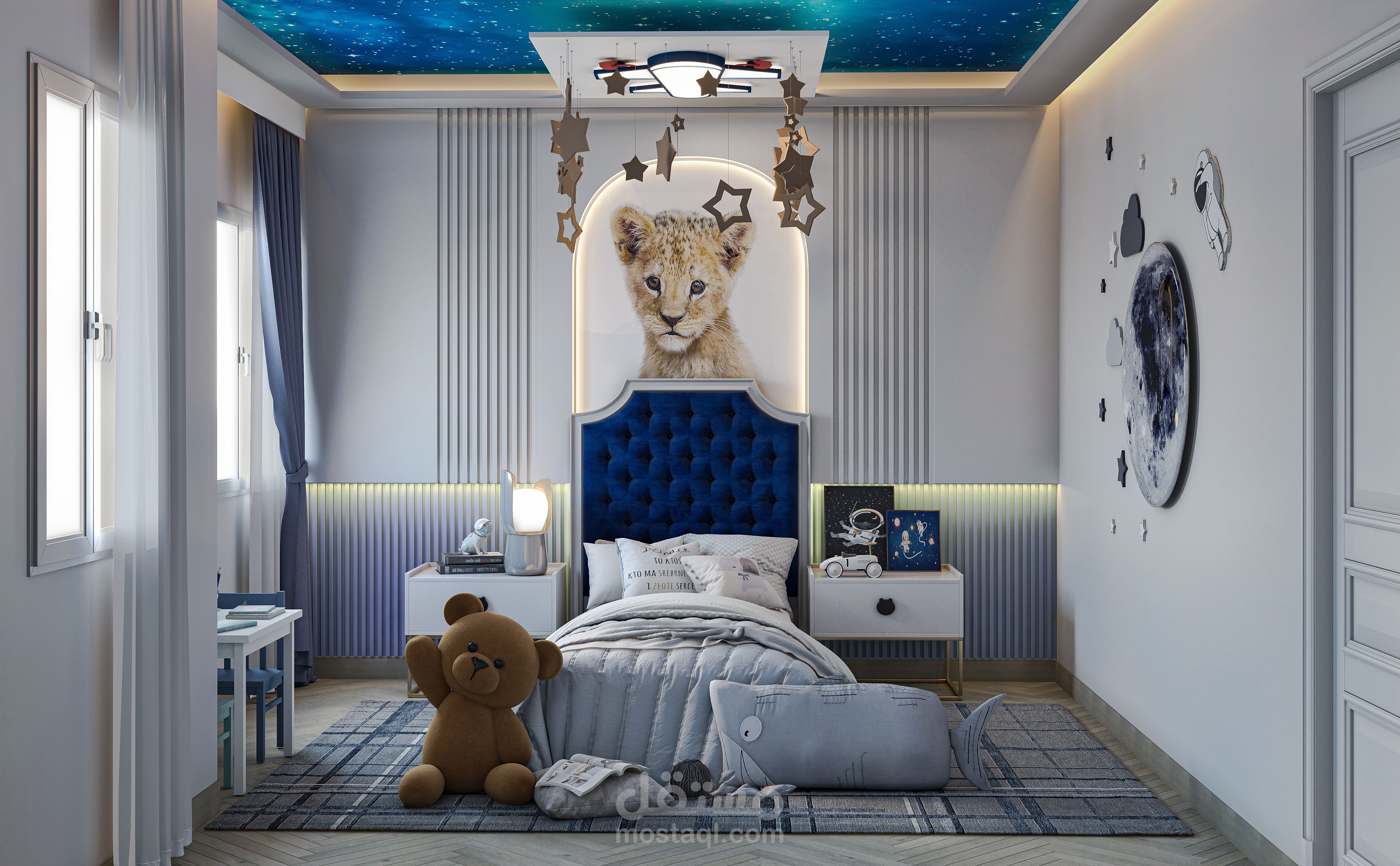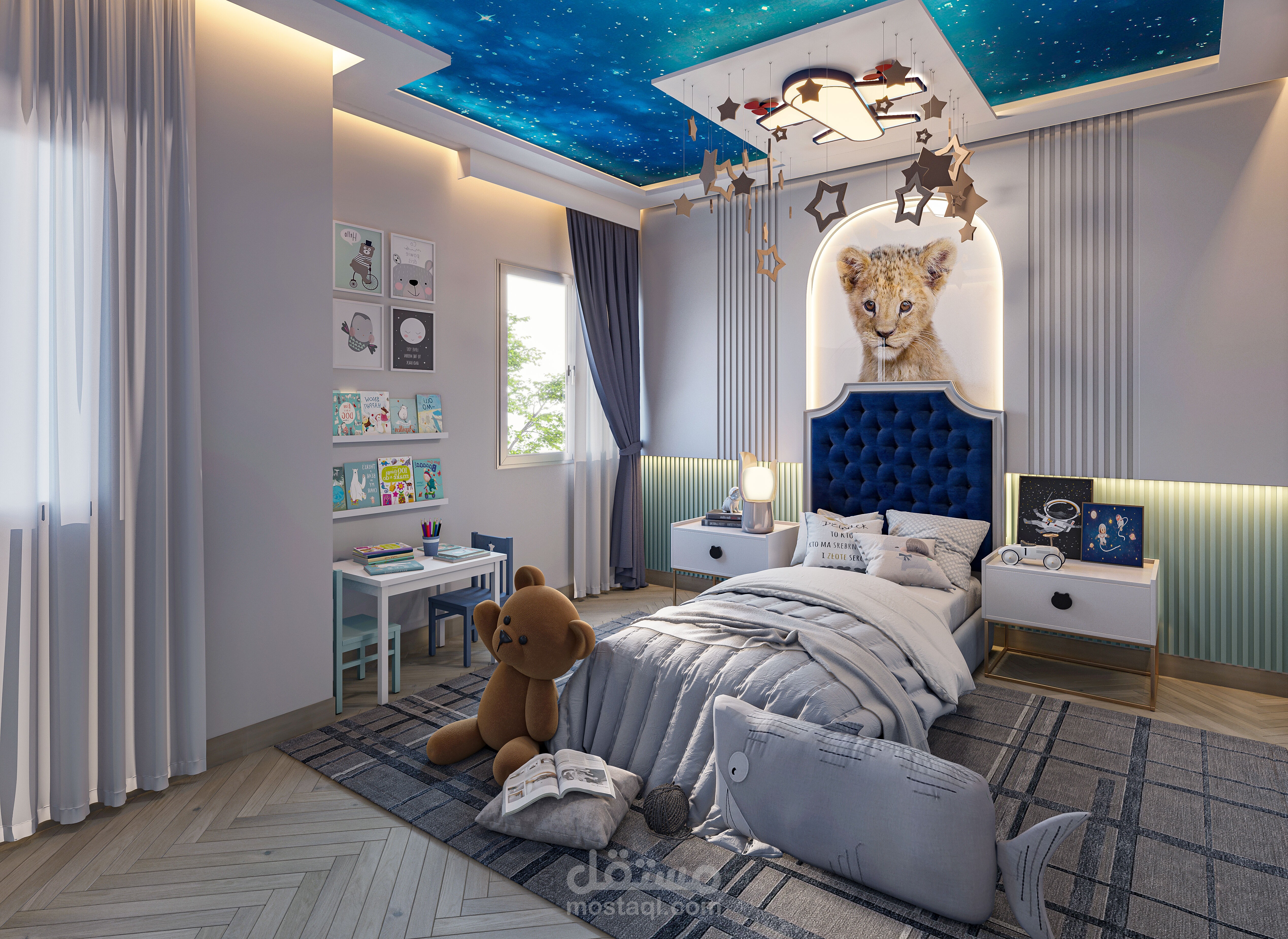 تصميم غرفة نوم طفل بمساحة 16 متر مربع ،تم مراعاة طابع المستخدم ونوعه من حيث اختيار التصاميم والالوان ايضا.وتم اضافة روح المرح في الألواان وكذلك رسومات الحوائط ولون الفرش حتى لا يشعر الطفل بالملل .