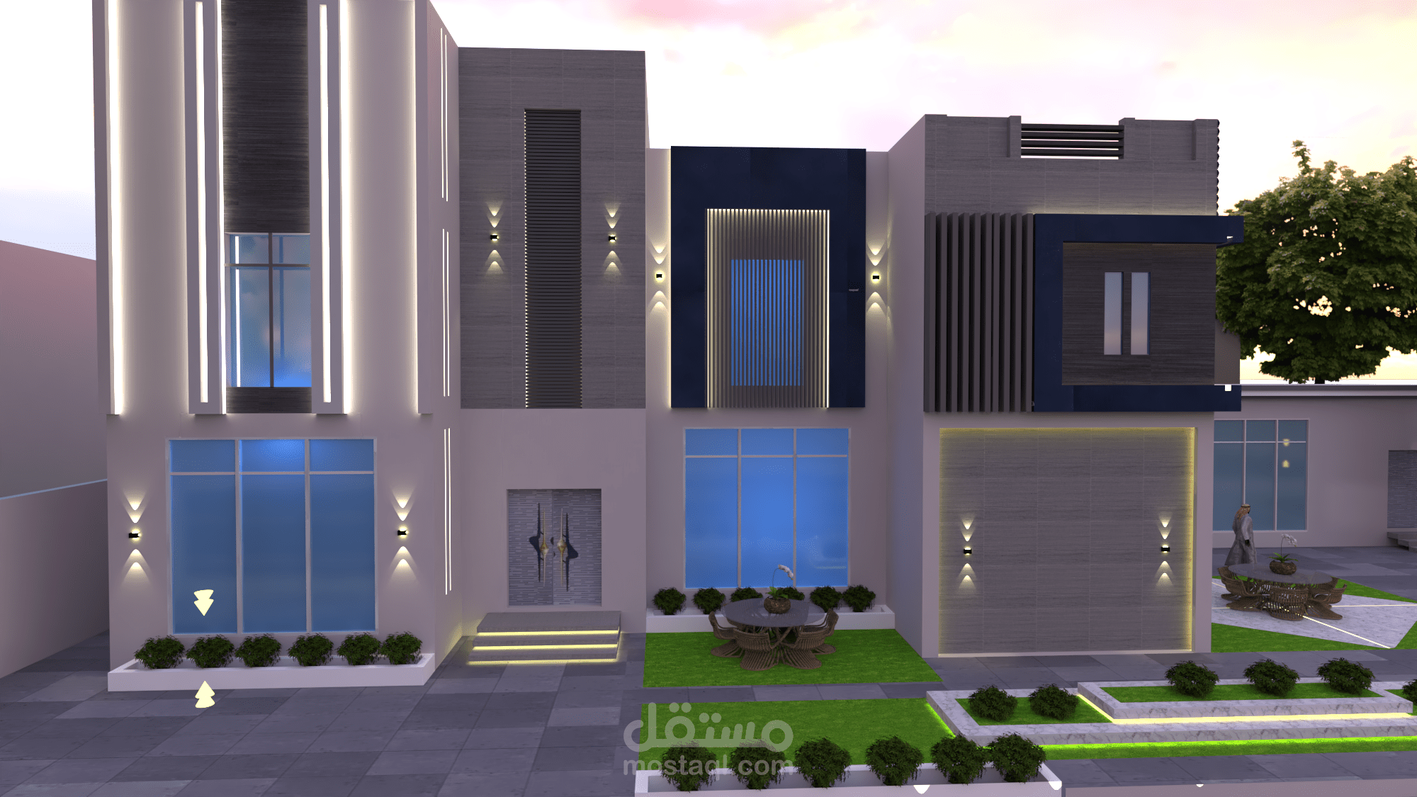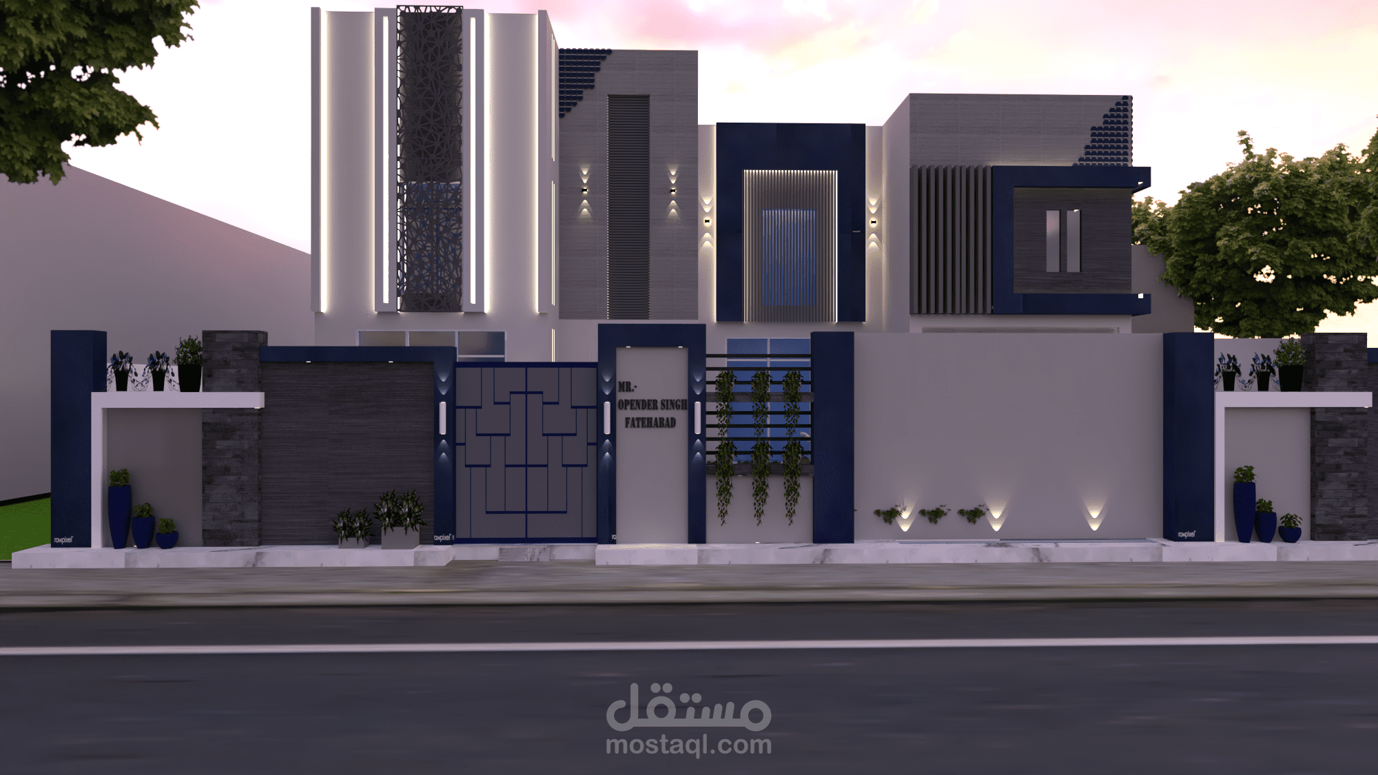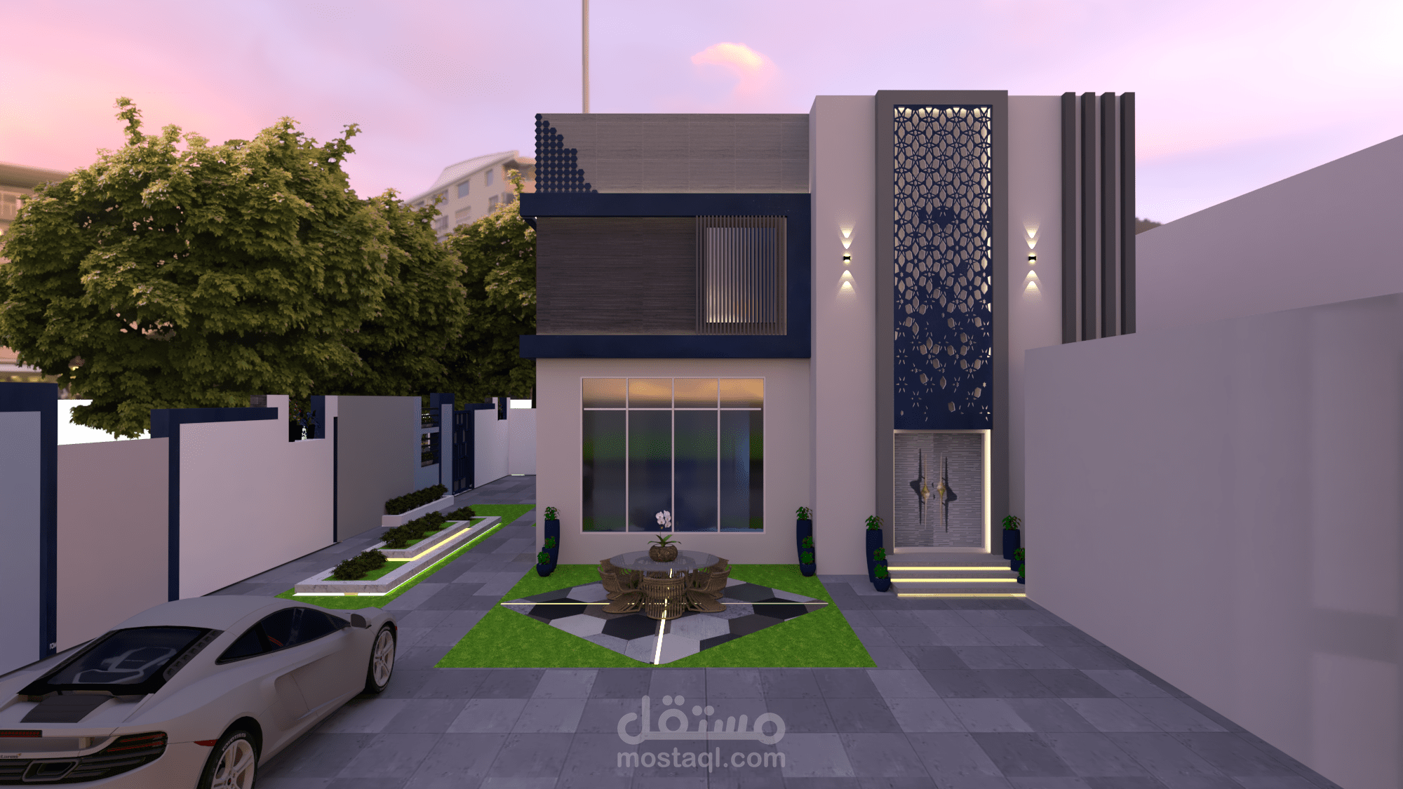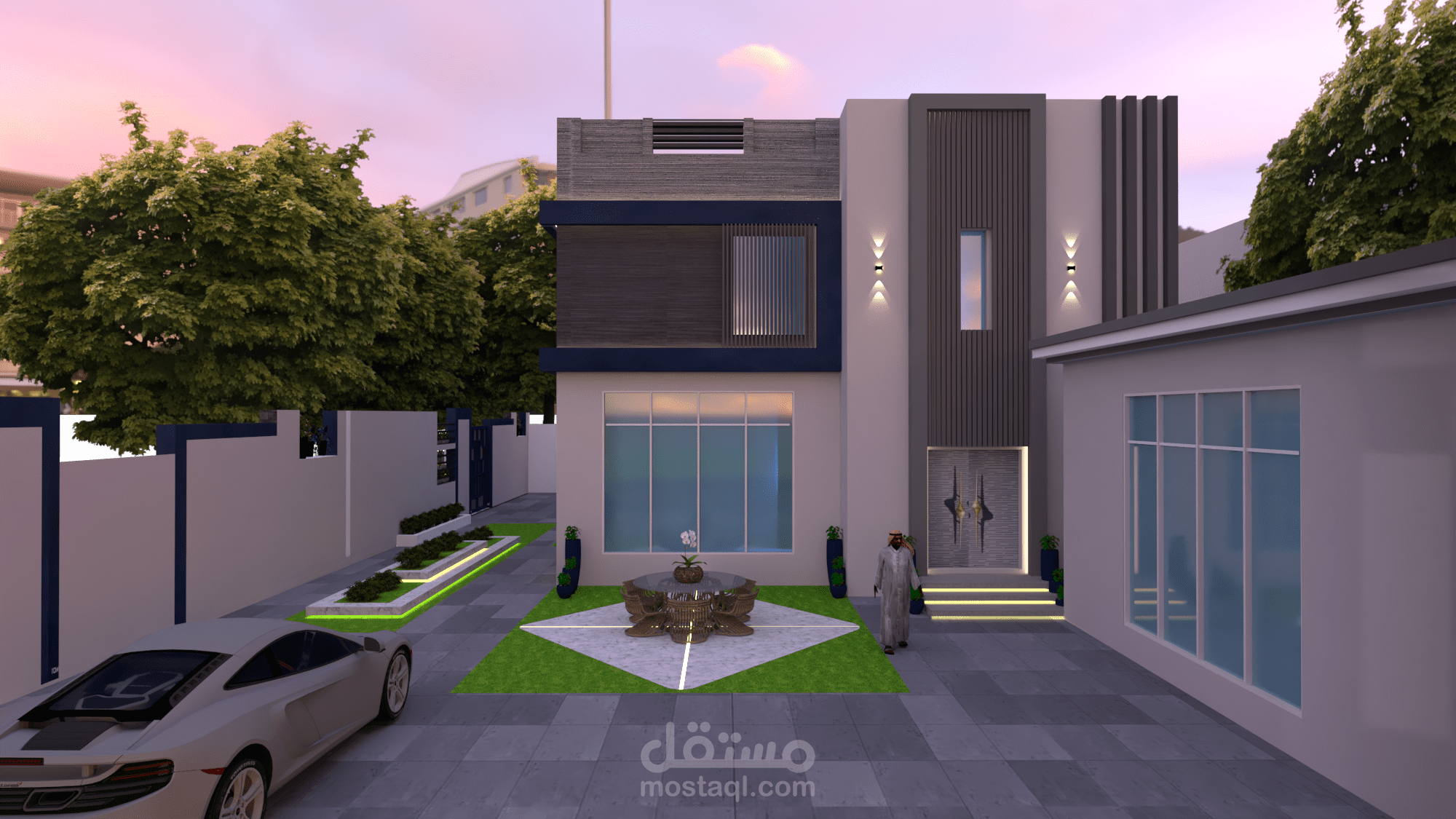 تصميم وتخطيط فيلا بطراز مودرن وتنسيق للفناء الخارجي لها .تم استخدام الوان وخامات تناسب زوق صاحبها