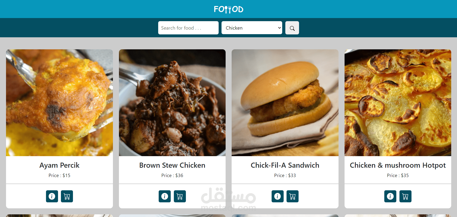 تطبيق React خاص بالطعام تم فيه استخدام API خاص بالأطعمة تم إضافة أسعار بضوابط معينة والأسعار ليست موجودة في ال Api تم برمجة البحث في التصنيفات باستخدام select كذلك تم استخدام react-router-dom للوصول إلى صفحة تفاصيل لكل منتج ، التصميم متجاوب مع أحجام الشاشات المختلفة . . وجاري العمل على تطويره ليشمل مواصفات ووظائف أكثر