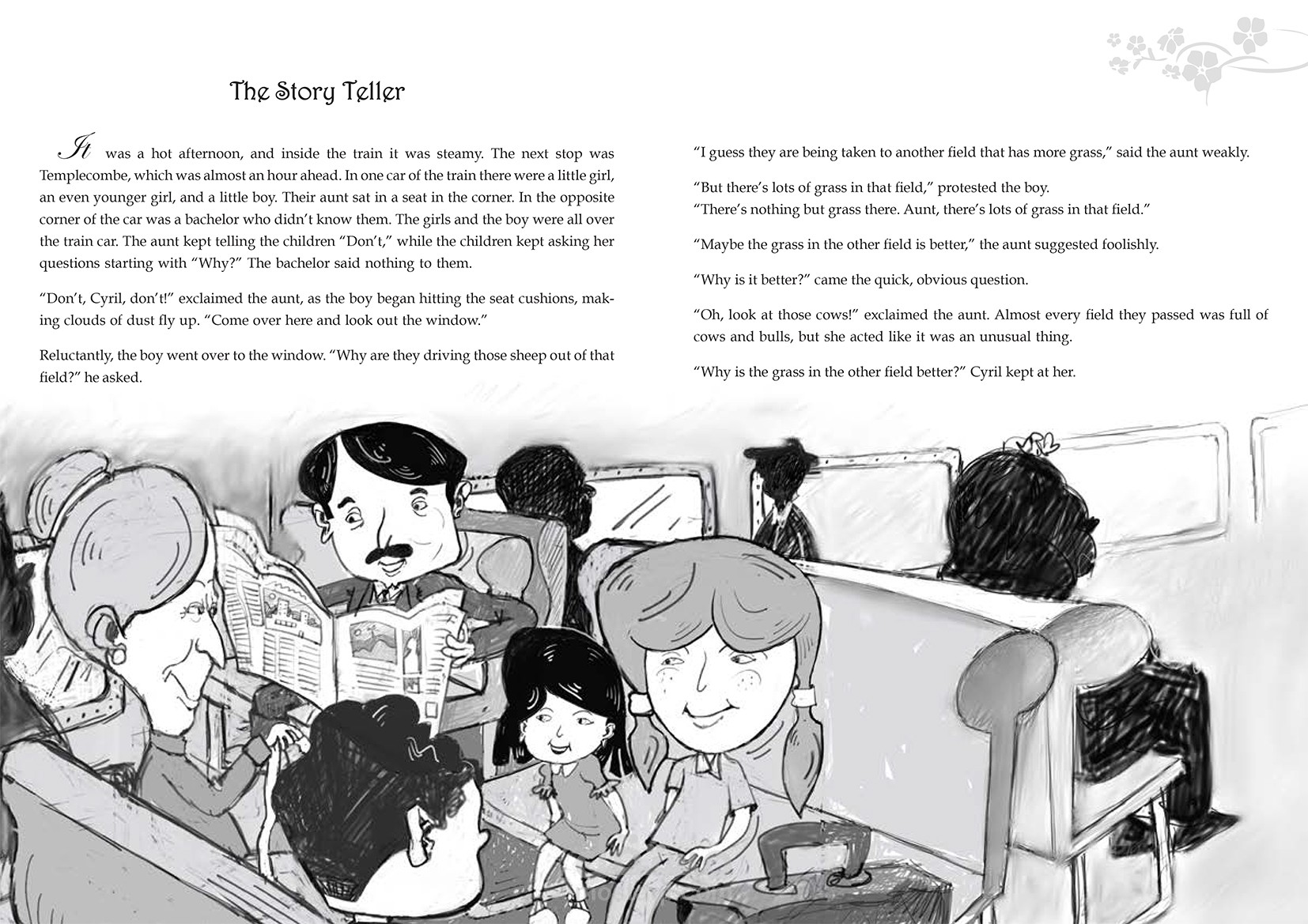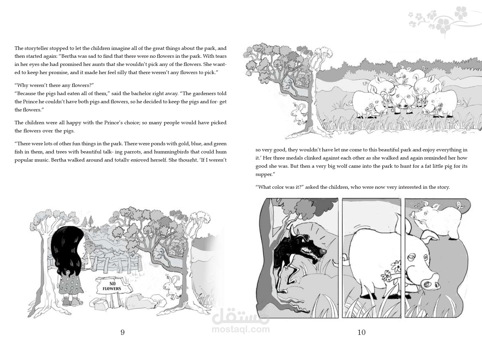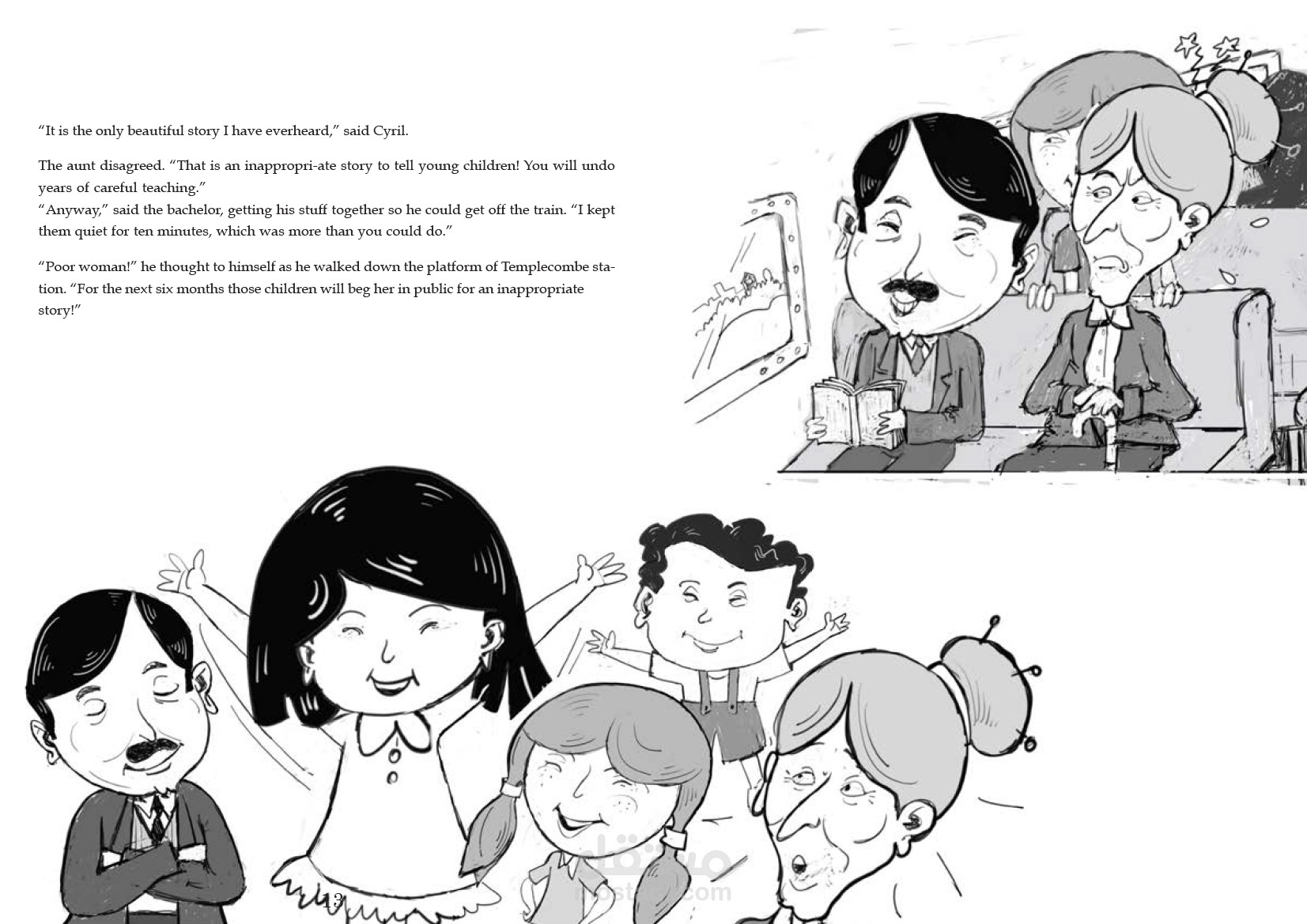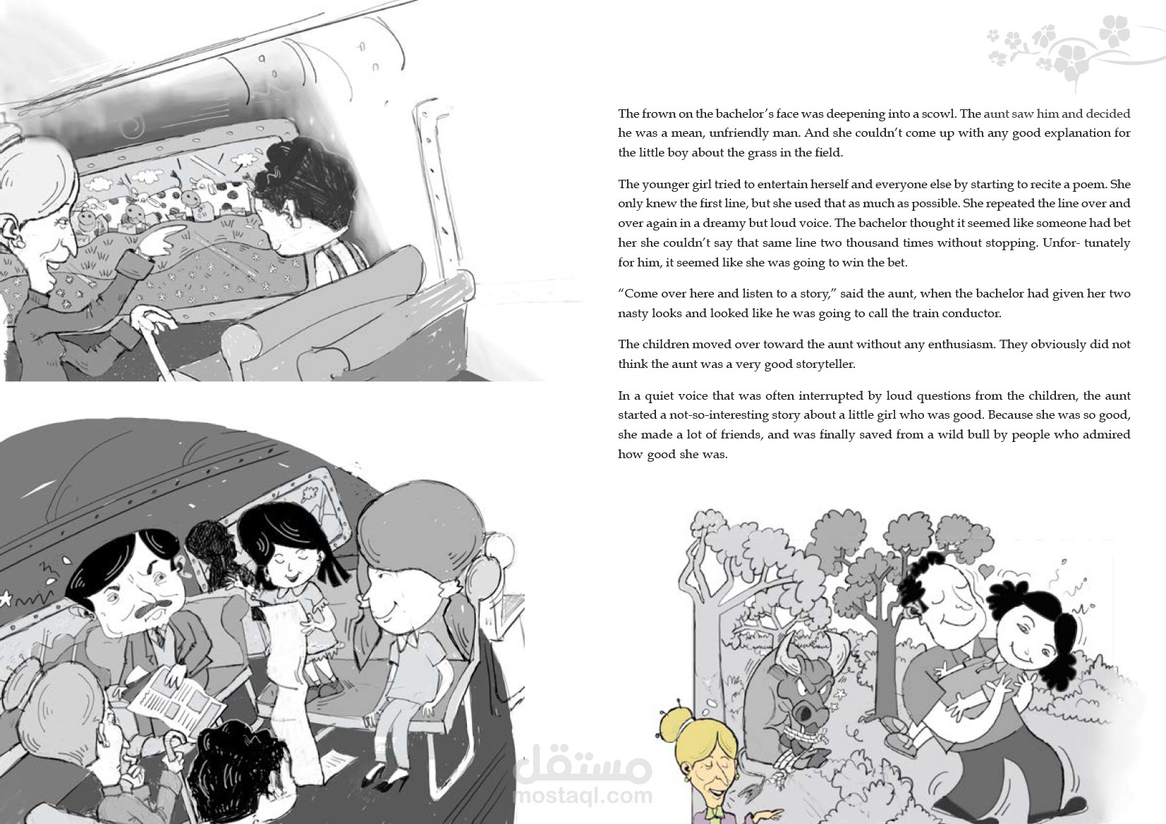 بعض رسوم لصفحات من قصة قصيرة للمؤلف الإنجليزي "ساكي" بعنوان (The story teller)، قمت برسمها وتنفيذها على موقع خمسات.