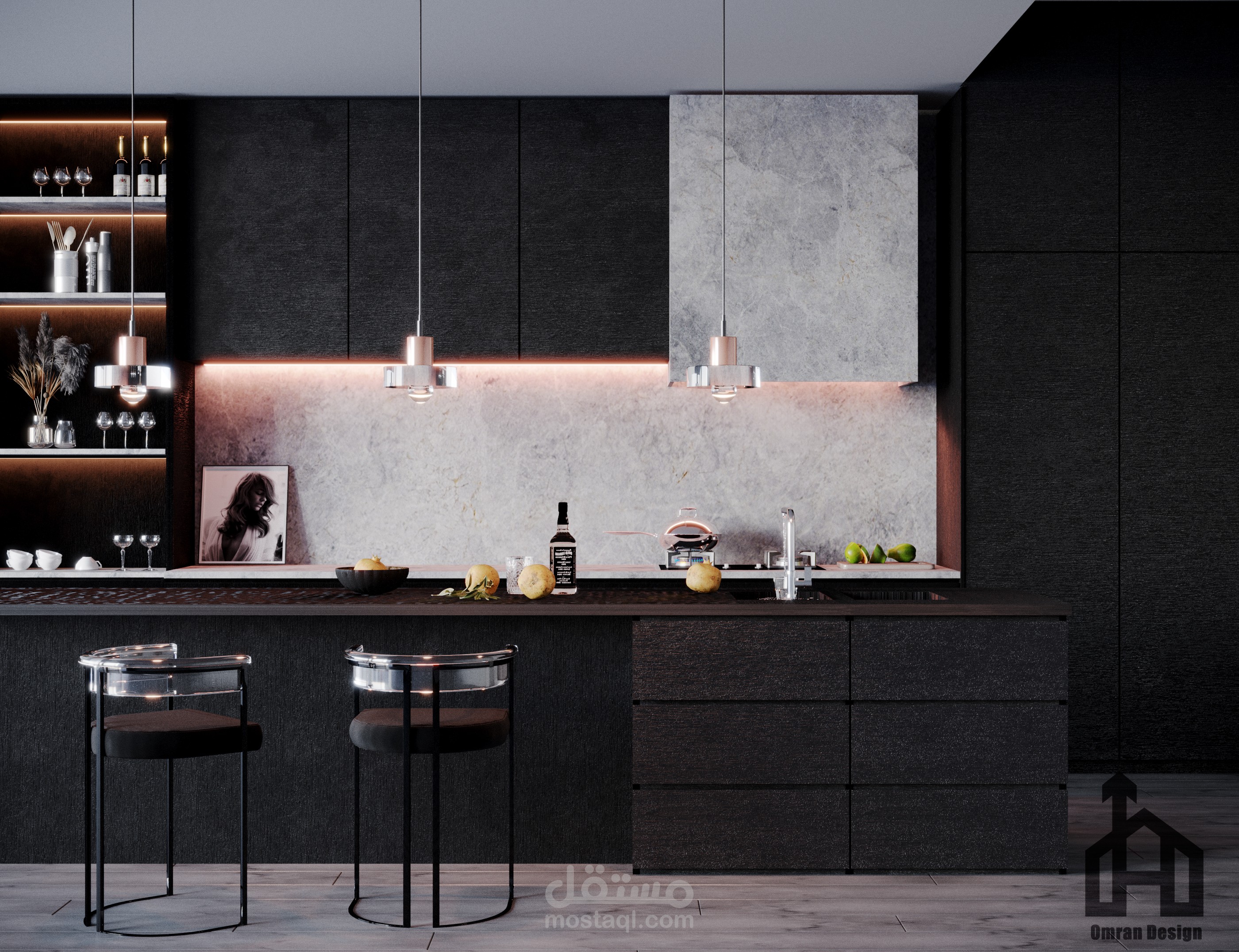 المطلوب تصميم مطبخ علي الطراز الحديث ابيض و اسود رخام
