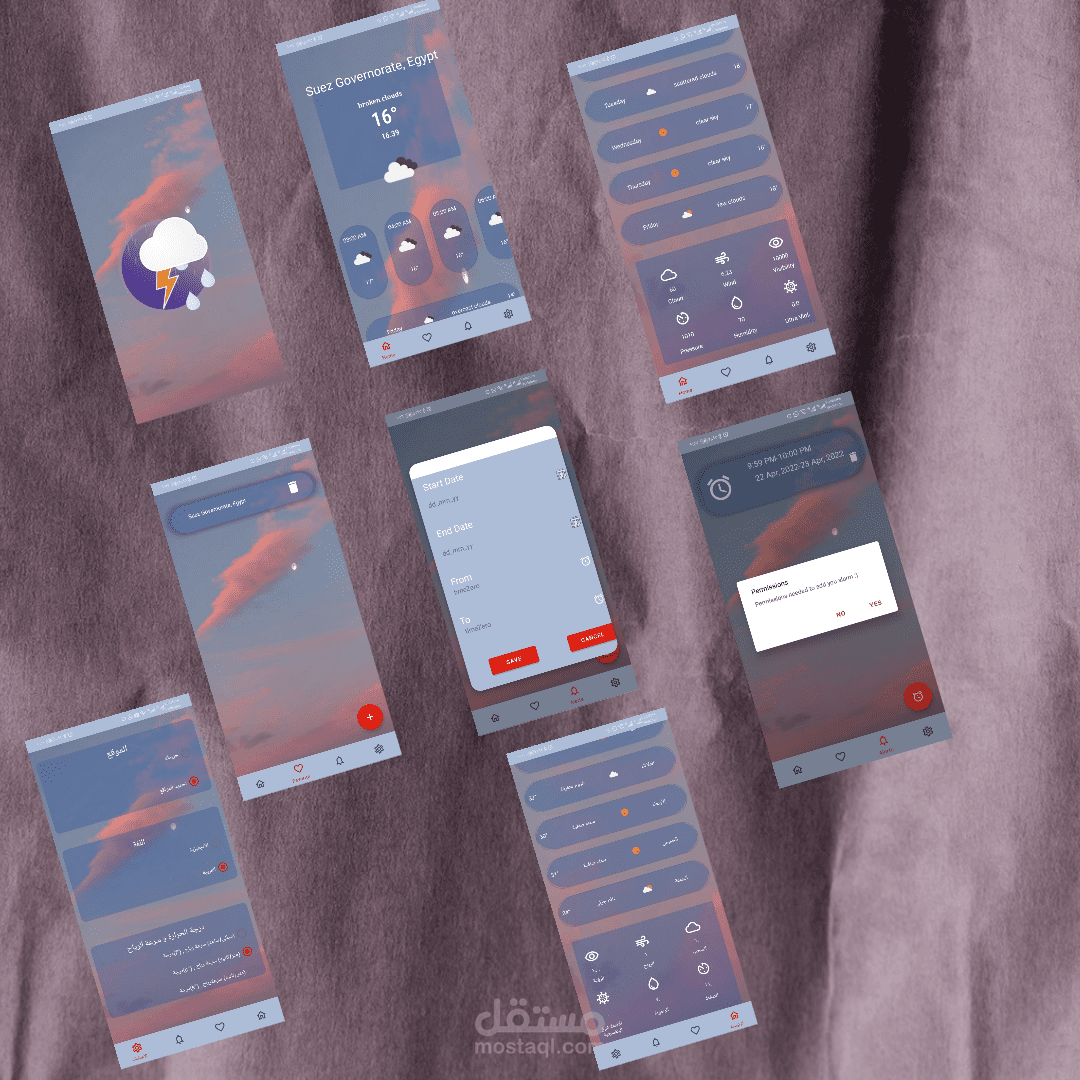My Weather Forecast Application Android Kotlin Application that displays the weather status and the temperature from your location or picks a specific location on the map and allow to make alarm for specific weather status on specific time and allow to change settings (language, units) Tools: Kotlin, MVVM, Retrofit, Room, liveData, Data Binding and Alarm Manager