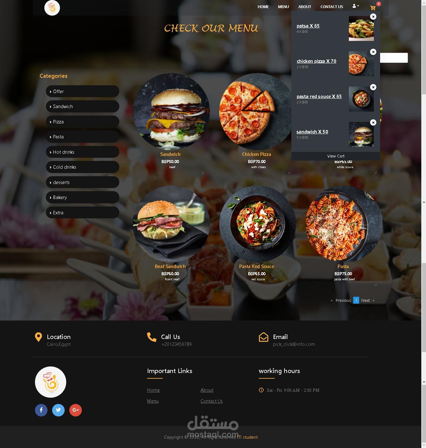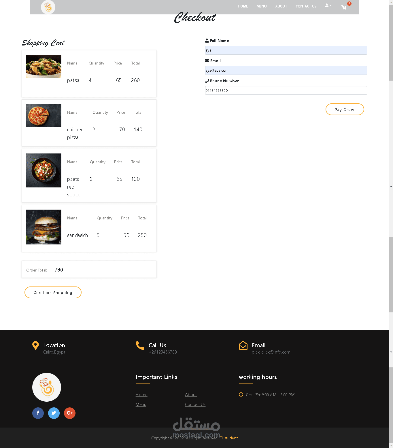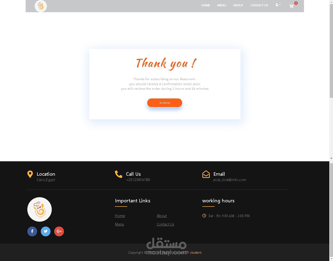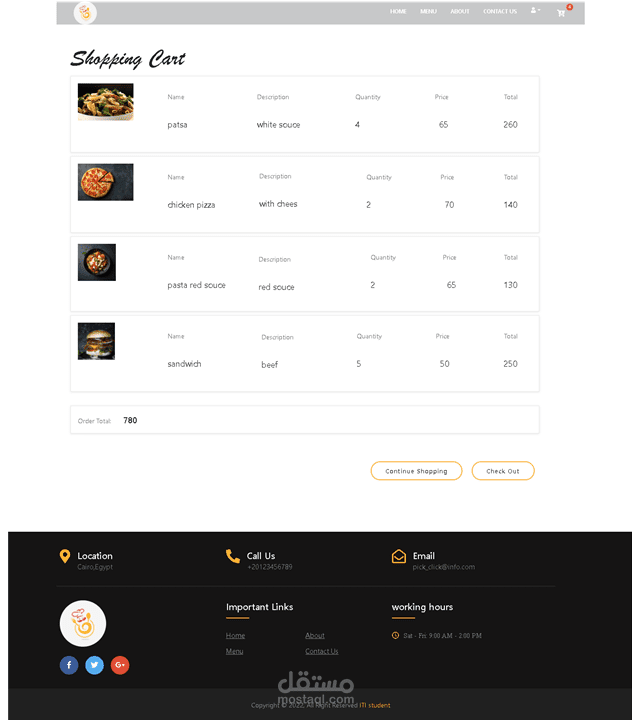 مطعم و يمكن للمستخدم عمل اوردر و الدفع اونلاين ولكن بعد تسجيل الدخول الى المطعم ولكن يمكن للمستخدم رؤية قائمة الطعام دون تسجيل الدخول و عند عمل الاوردر يصل الى المستخدم اشعار بمعاد وصول الاوردر لديه