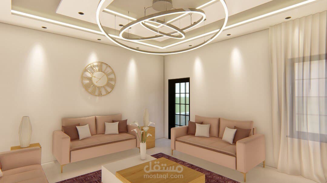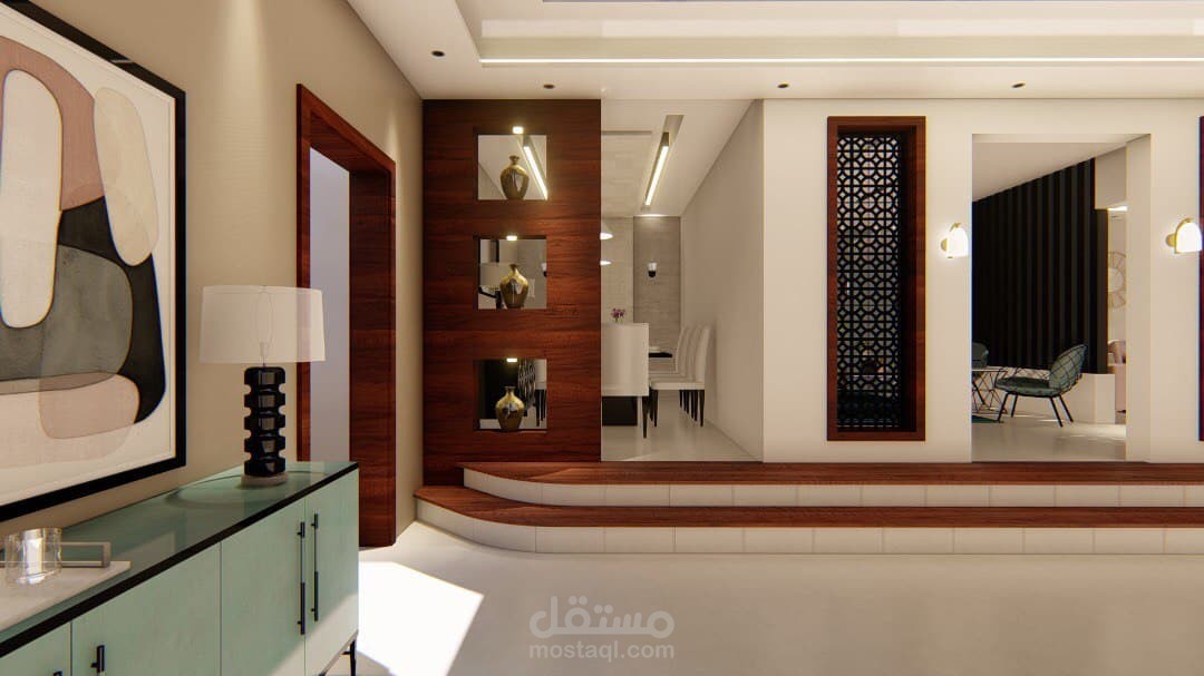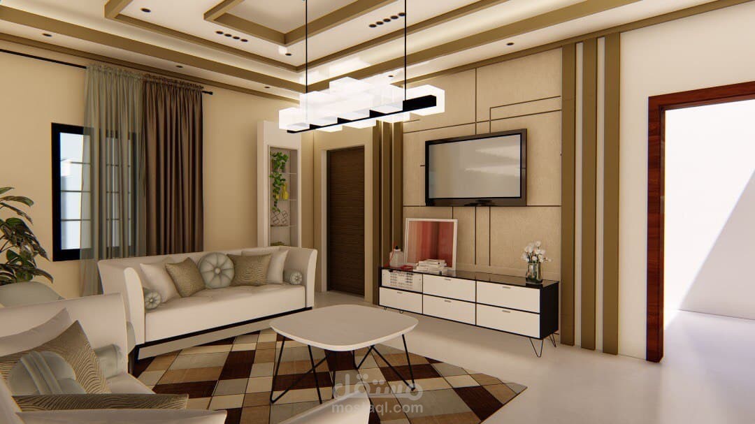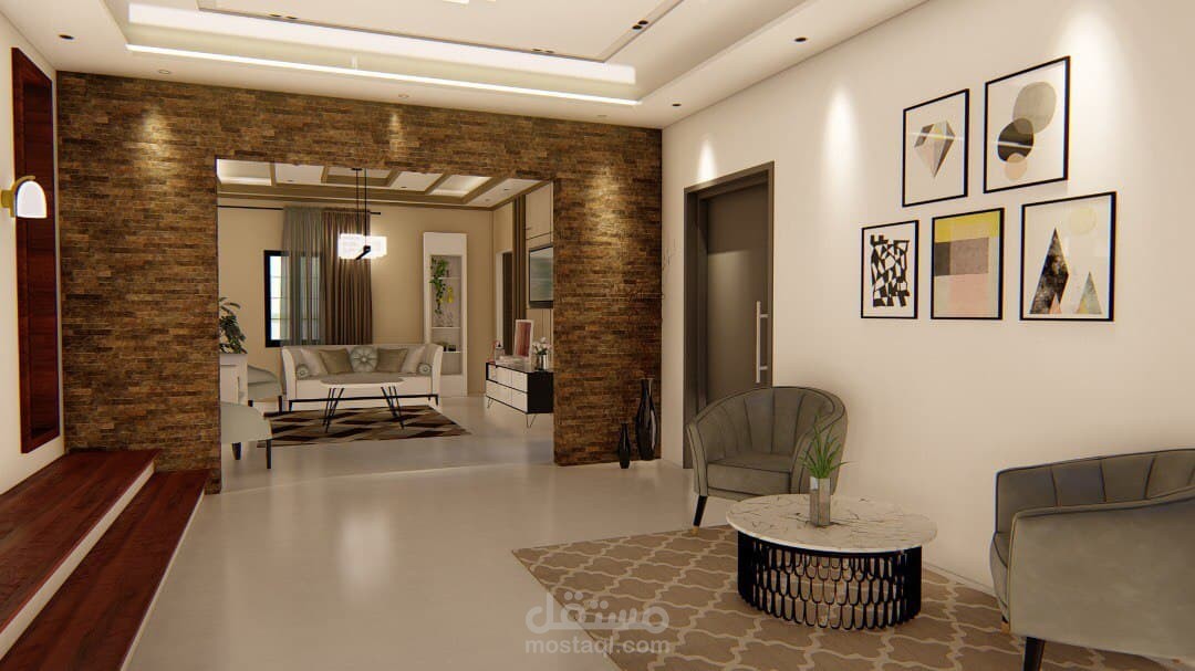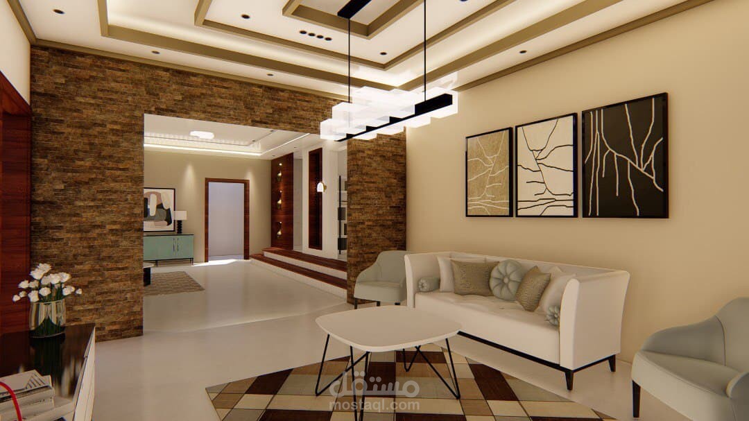 تصميم داخلي ل مساحة عائلية تتكون من مدخل إستقبال و غرفة معيشة و صالون .