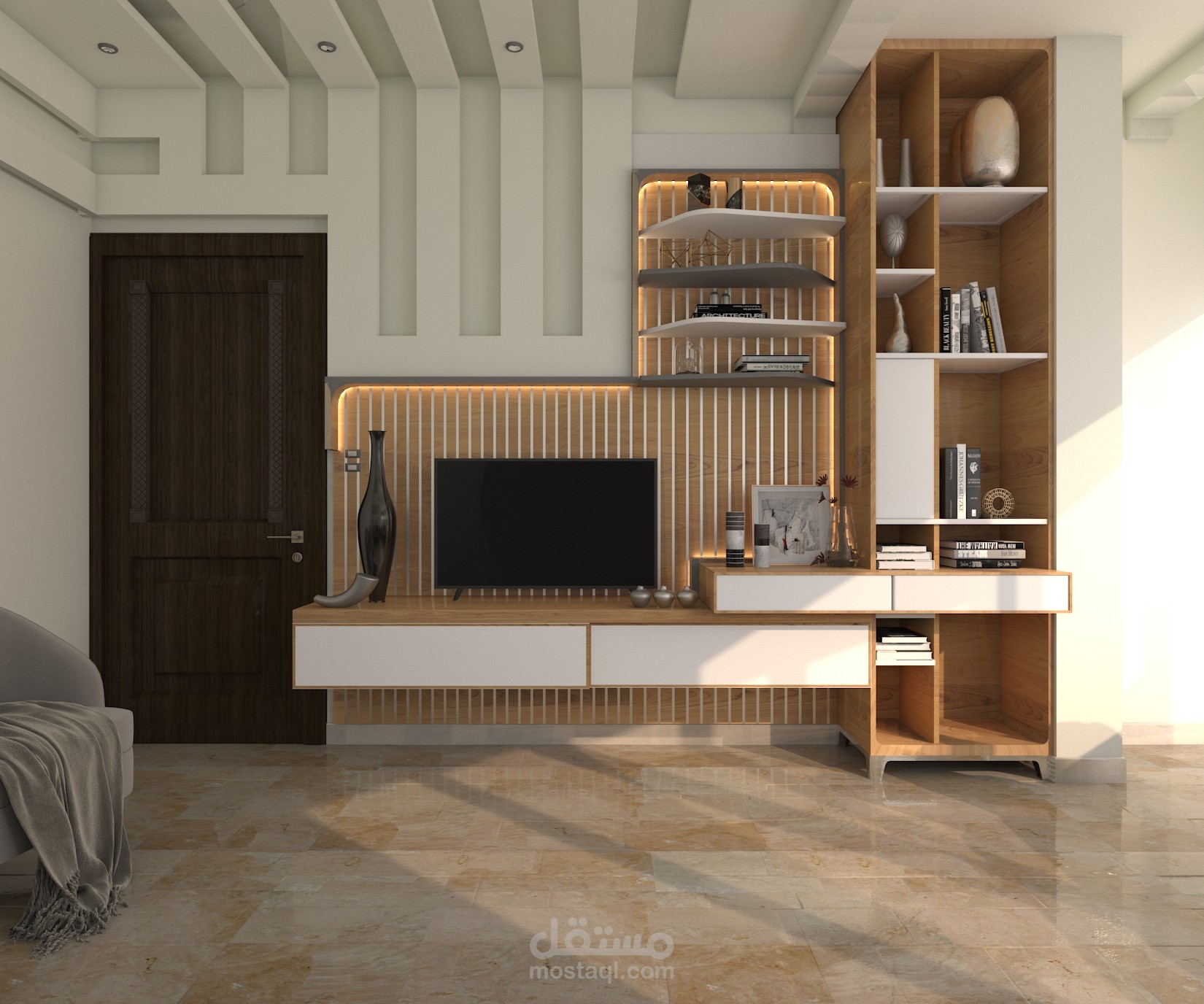 حيث تم تخصيص مكان لشاشة التلفاز وأماكن أخرى لوضع بعض الكتب والتماثيل