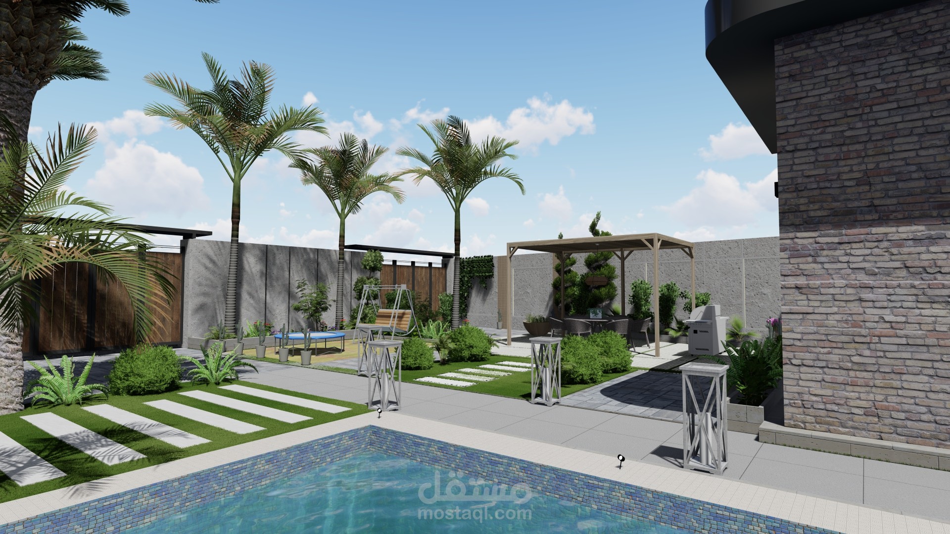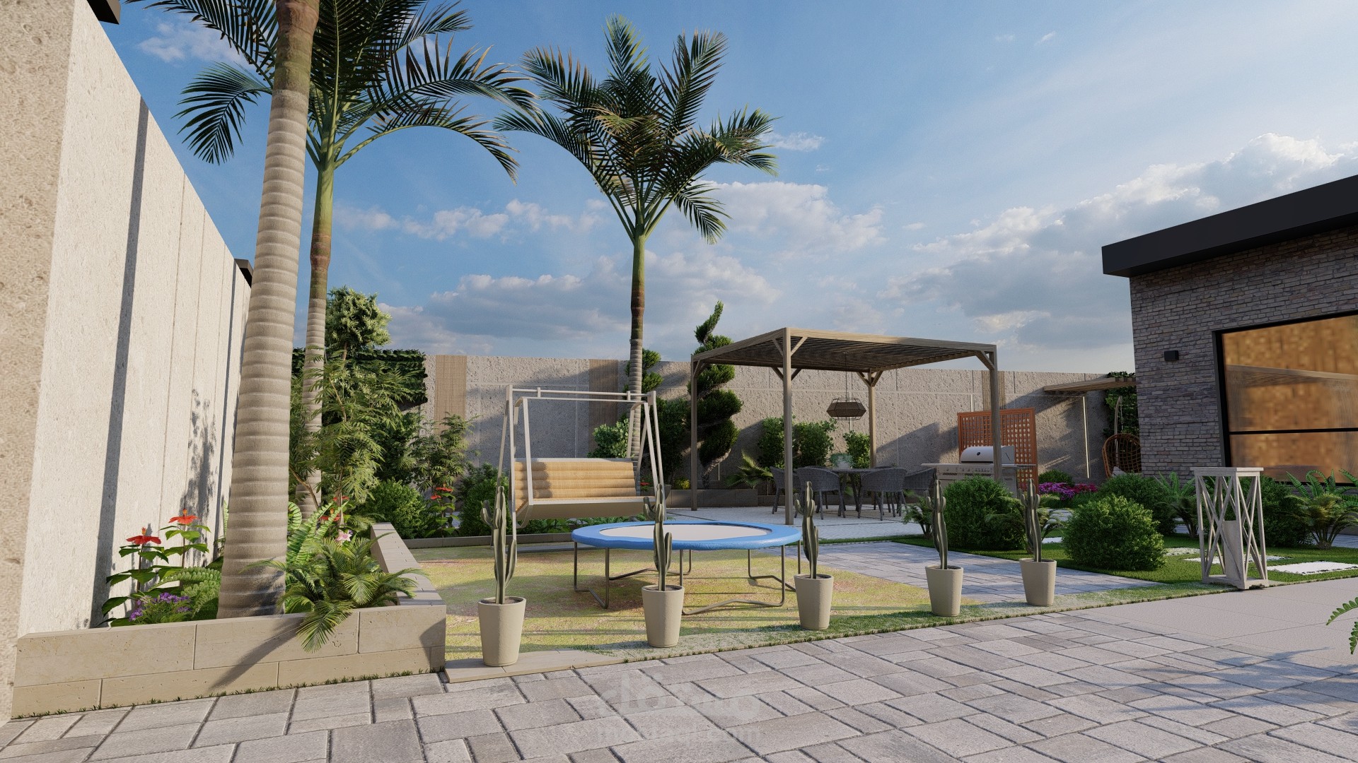 تصميم حديقة واستغلال أفضل للمساحة حسب ذوق العميل مع لمسة ابداعية كمصممة.