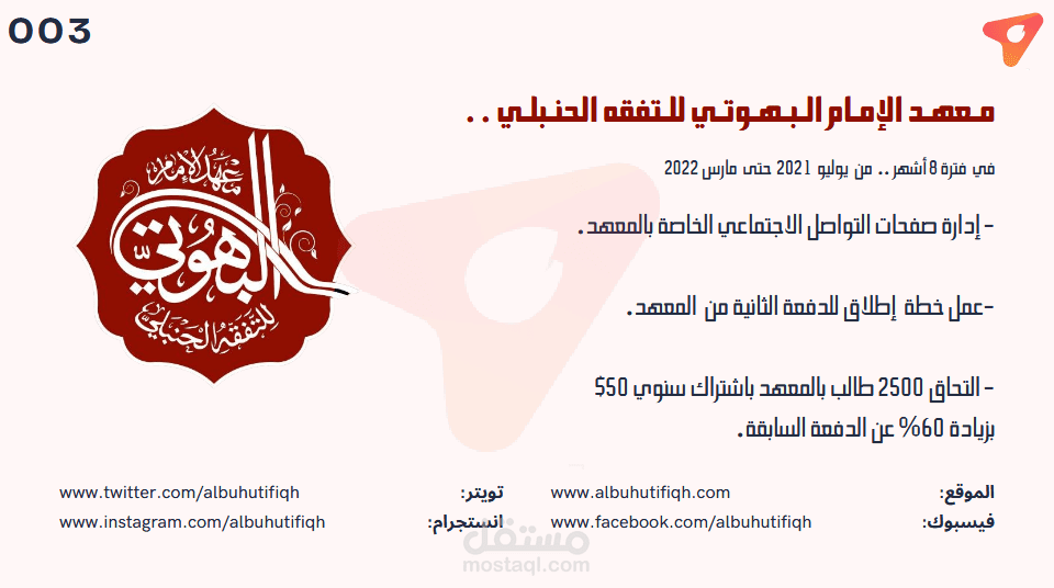 وإدارة صفحات التواصل الاجتماعي على جميع المنصات (فيسبوك وتويتر وانستجرام وتيليجرام)؛