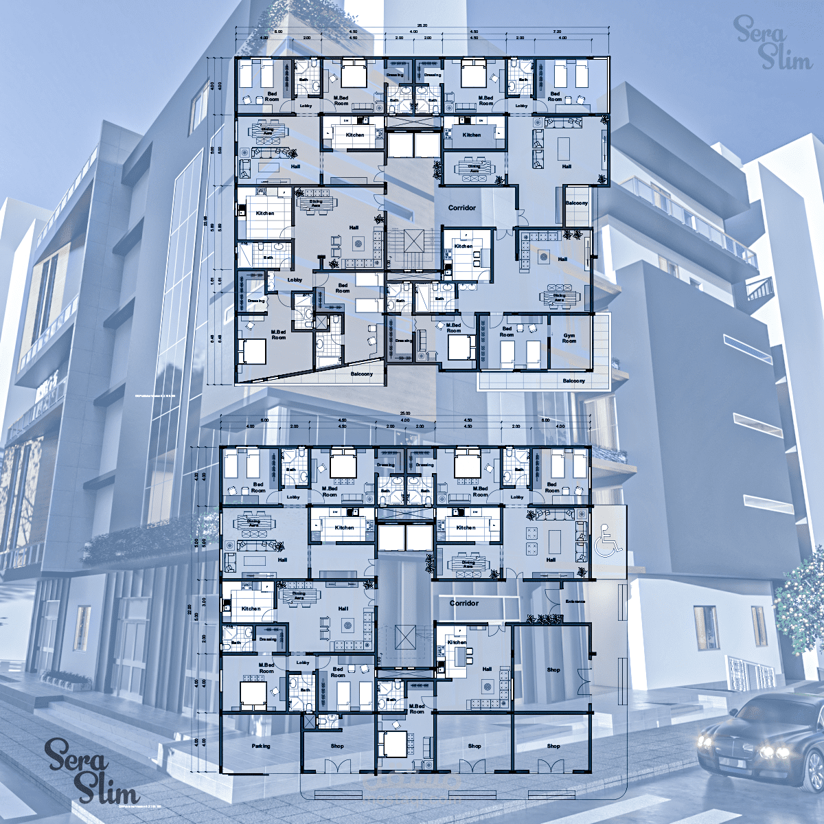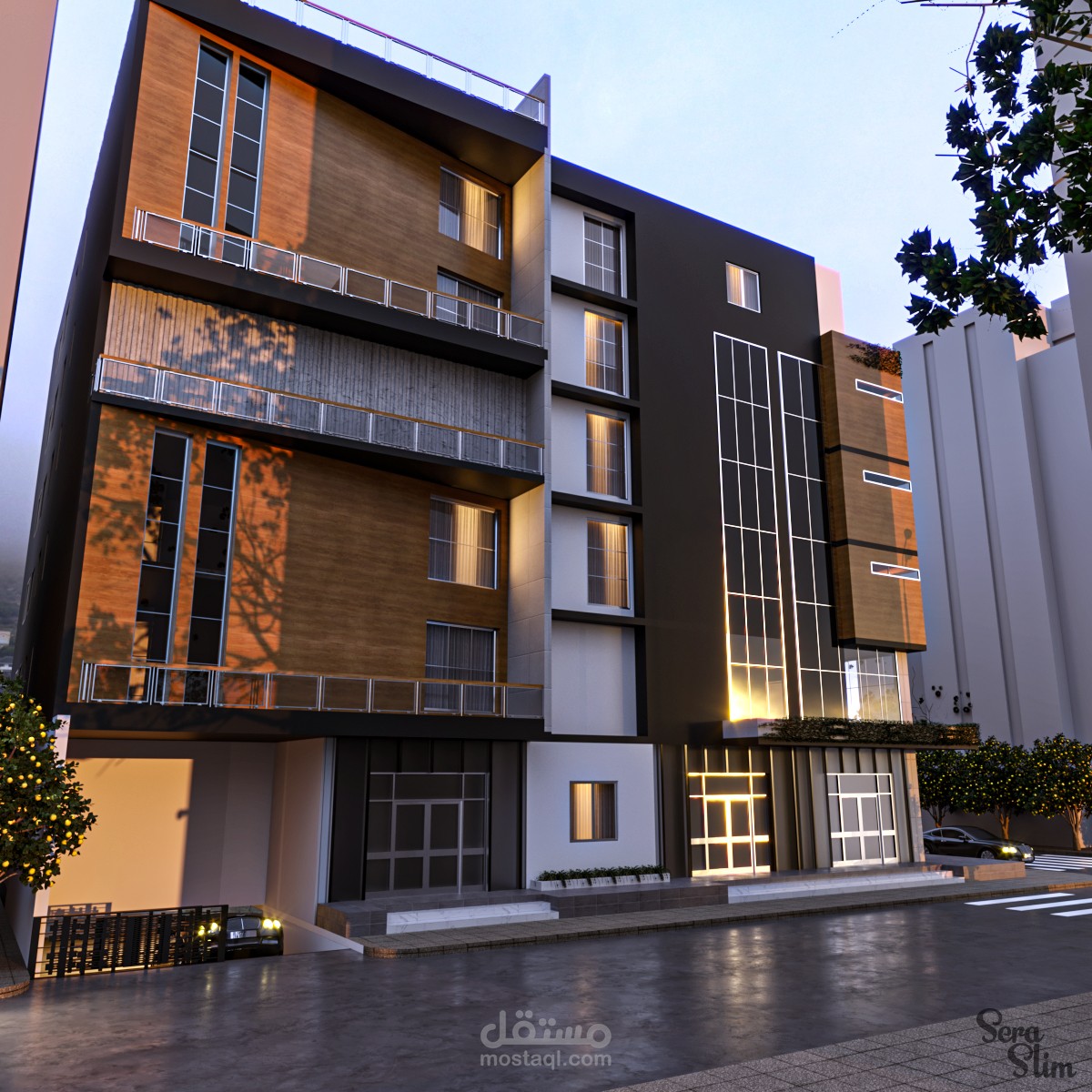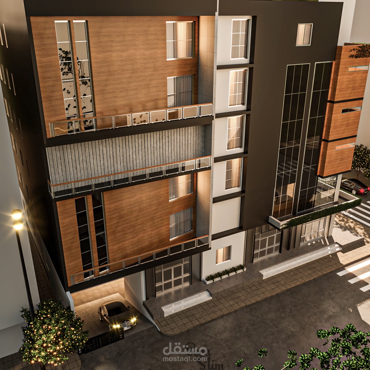 تصميم مبنى سكني مكون من أرضي و سرداب و 5 طوابق اتبع الاستايل العصري في الواجهات..