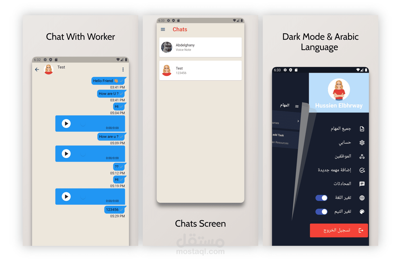 -workers also can make chat(Text and Voice Notes) with each other