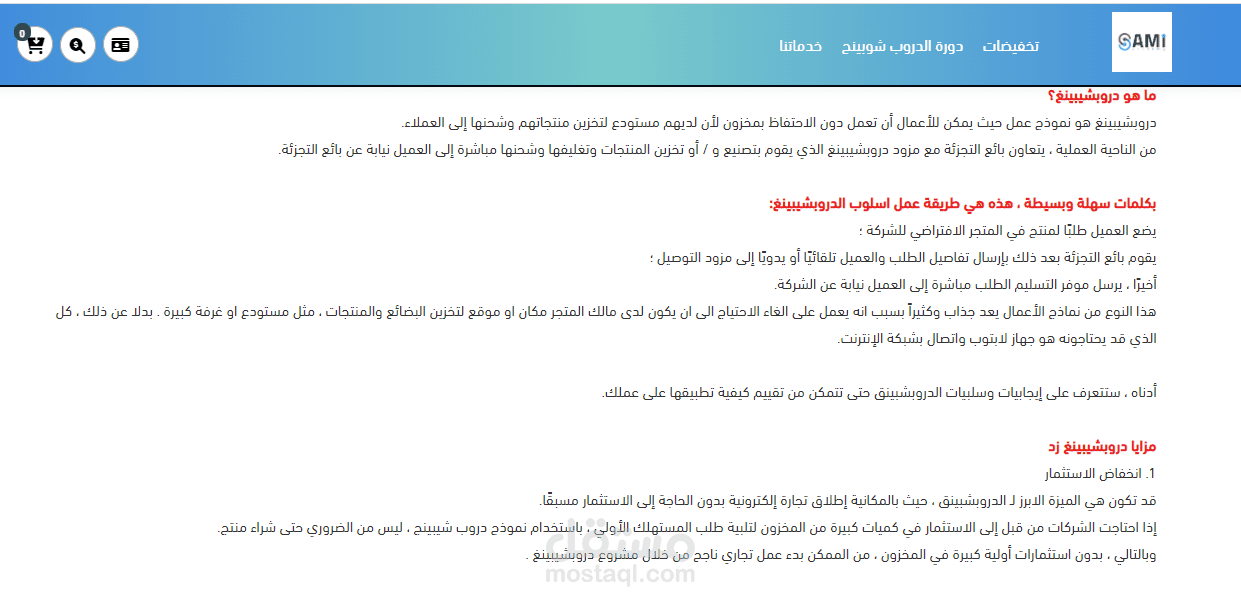 تم كتابة مقالة بعنوان دروبشيبينغ زد لصالح متجر اكاديمية سامي في منصة سلة بالتوافق مع قواعد السيو من اجل التصدر في الكلمات المفتاحية المحددة من صاحب المتجر وتم التاكد من حصرية المقال بنسبة100% عبر ادوات المحتوى المكرر، حيث تم الربط الداخلي بين الصفحات والمنتجات وتضمين الصور الحصرية وجميع البيانات المطلوبة من اجل رحلة قراءة ممتعة للعميل..