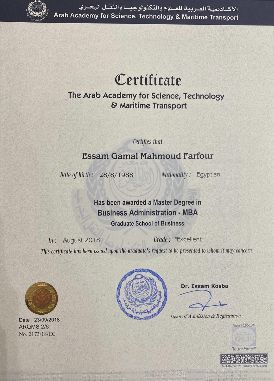 ١- شهادات ماجستير بتقدير عام امتياز في ادارة الاعمال تخصص تسويق.
