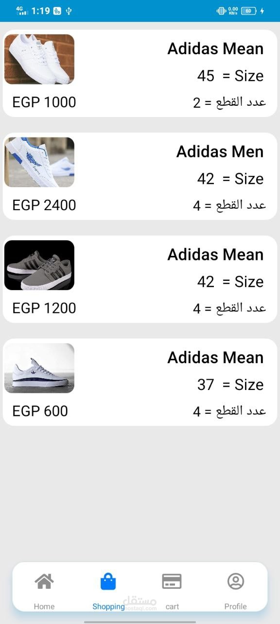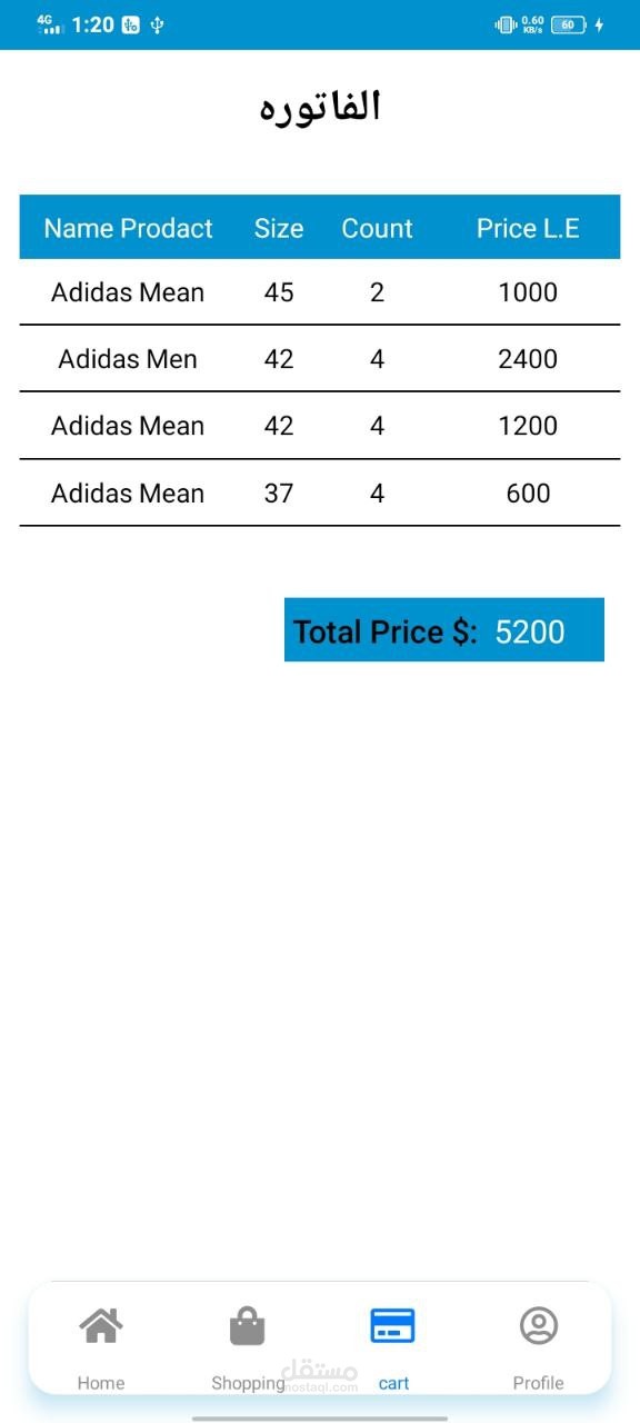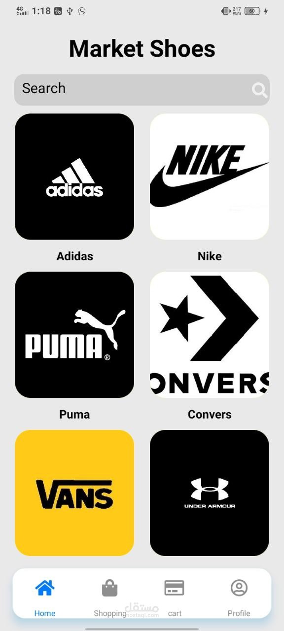 An application that displays different types of branded shoes and is divided into a section for men's shoes and a section for women's shoes with available shoe sizes and allows you to choose the right shoe and display it in the shopping bag. You can modify the product by increasing the number or a different size or canceling the order and showing an invoice with product details