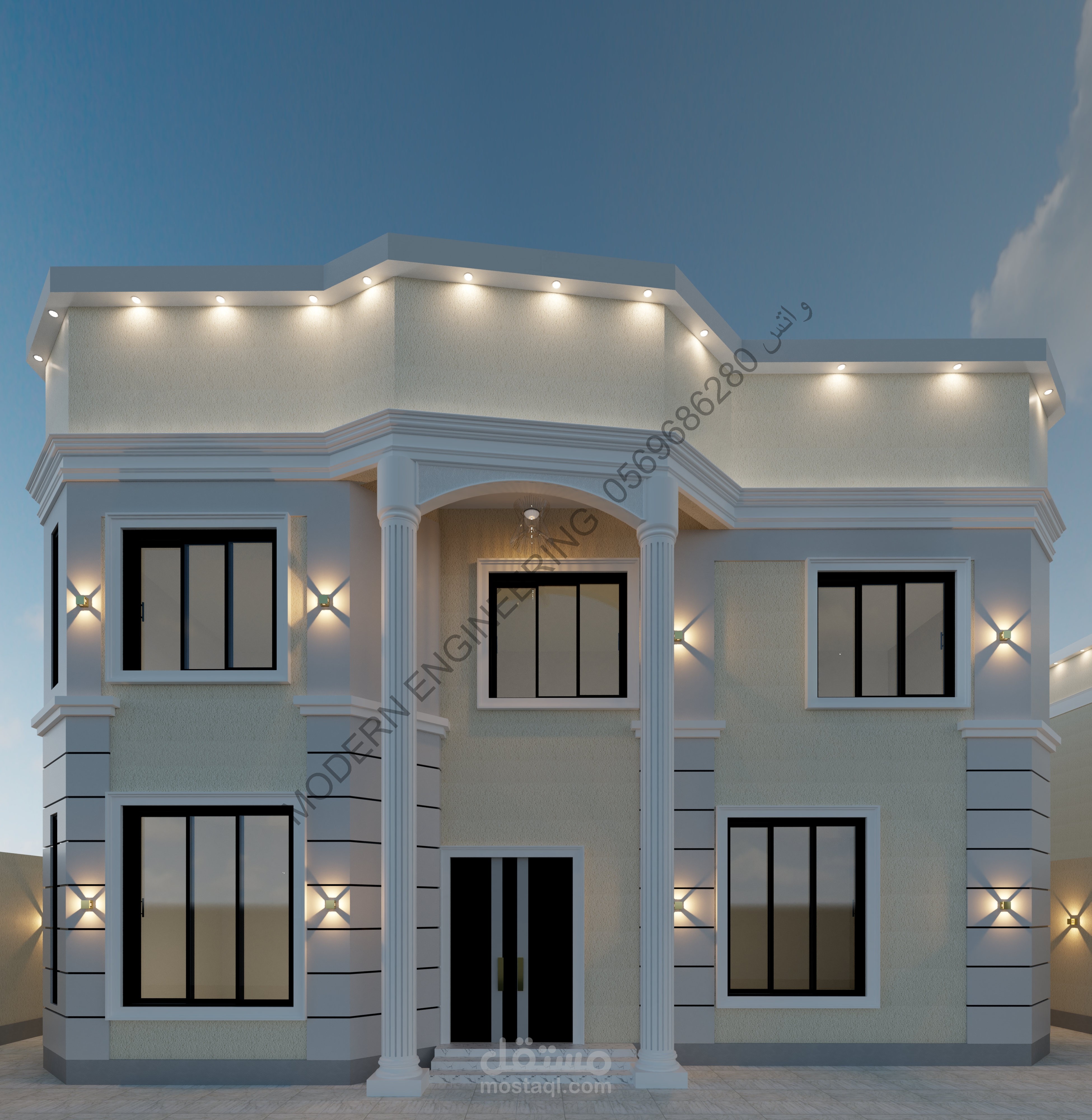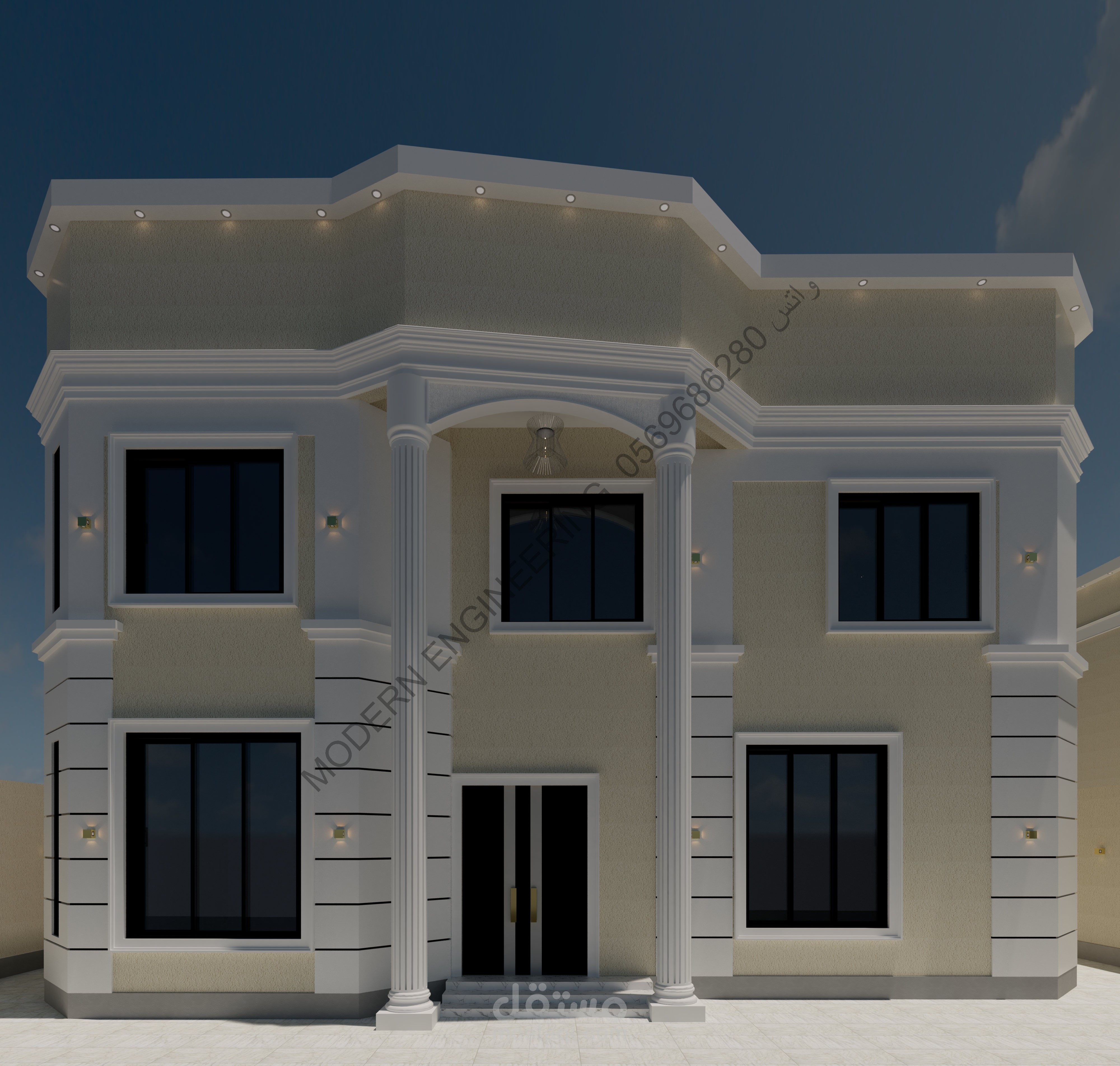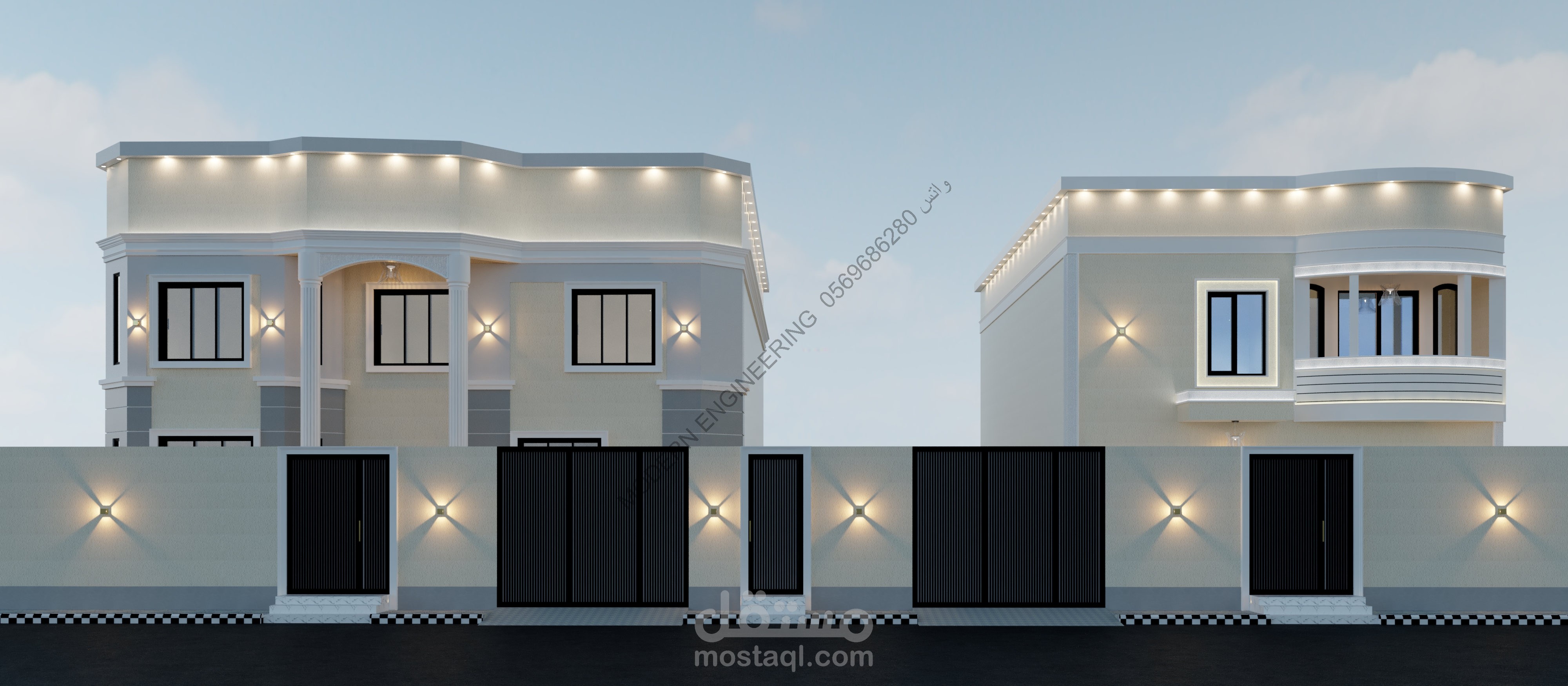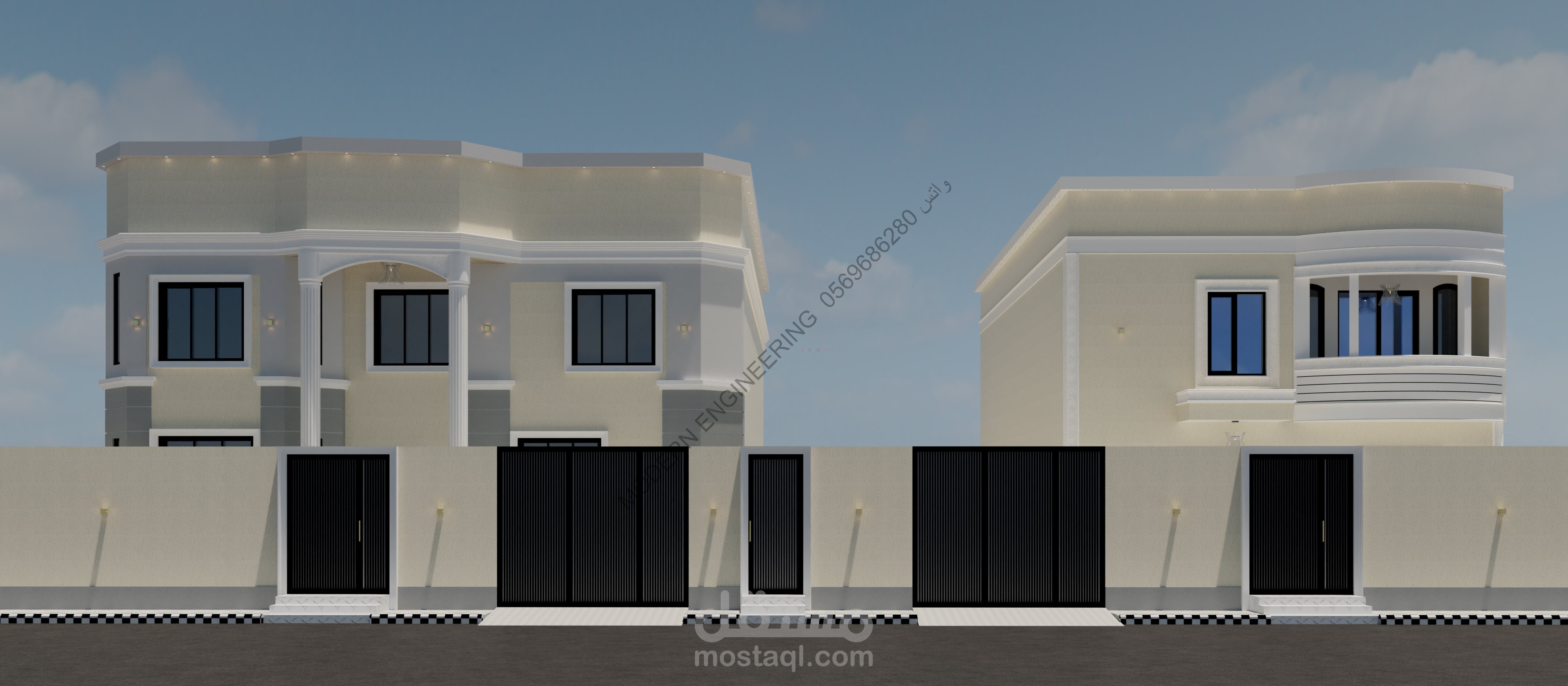 تطوير وتعديل واجهات فلتين متجاورتين بإضافة مادة الجي ار سي وتبويشات اسمنتية اما تكسية الواجهات فهي من مادة البروفايل ومخرجات العمل كانت صور ثري دي ليلية ونهارية بالاضافة ل منظور بانورامي 360 درجة ويتوفر ايضا صور العظم للفلل