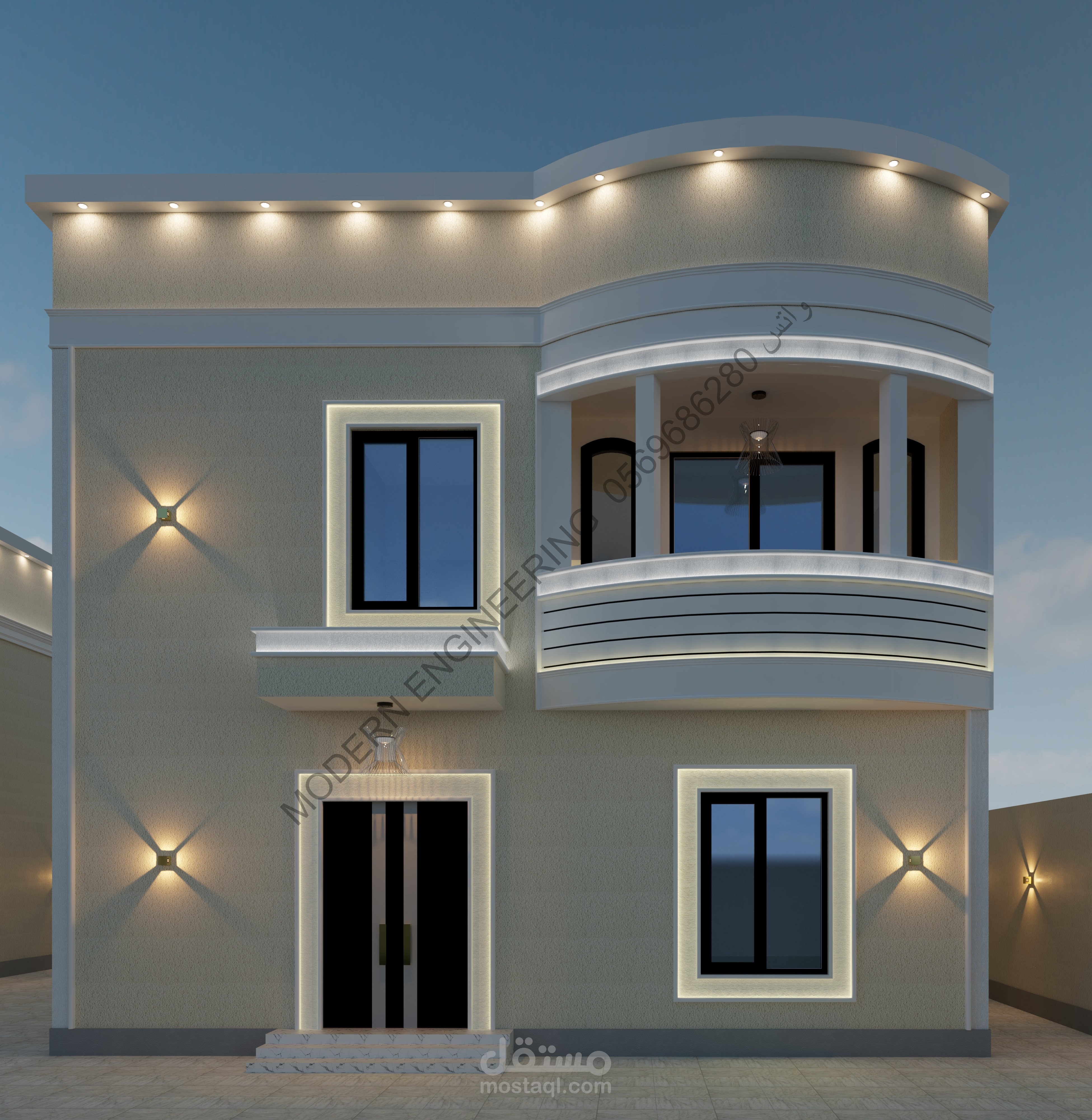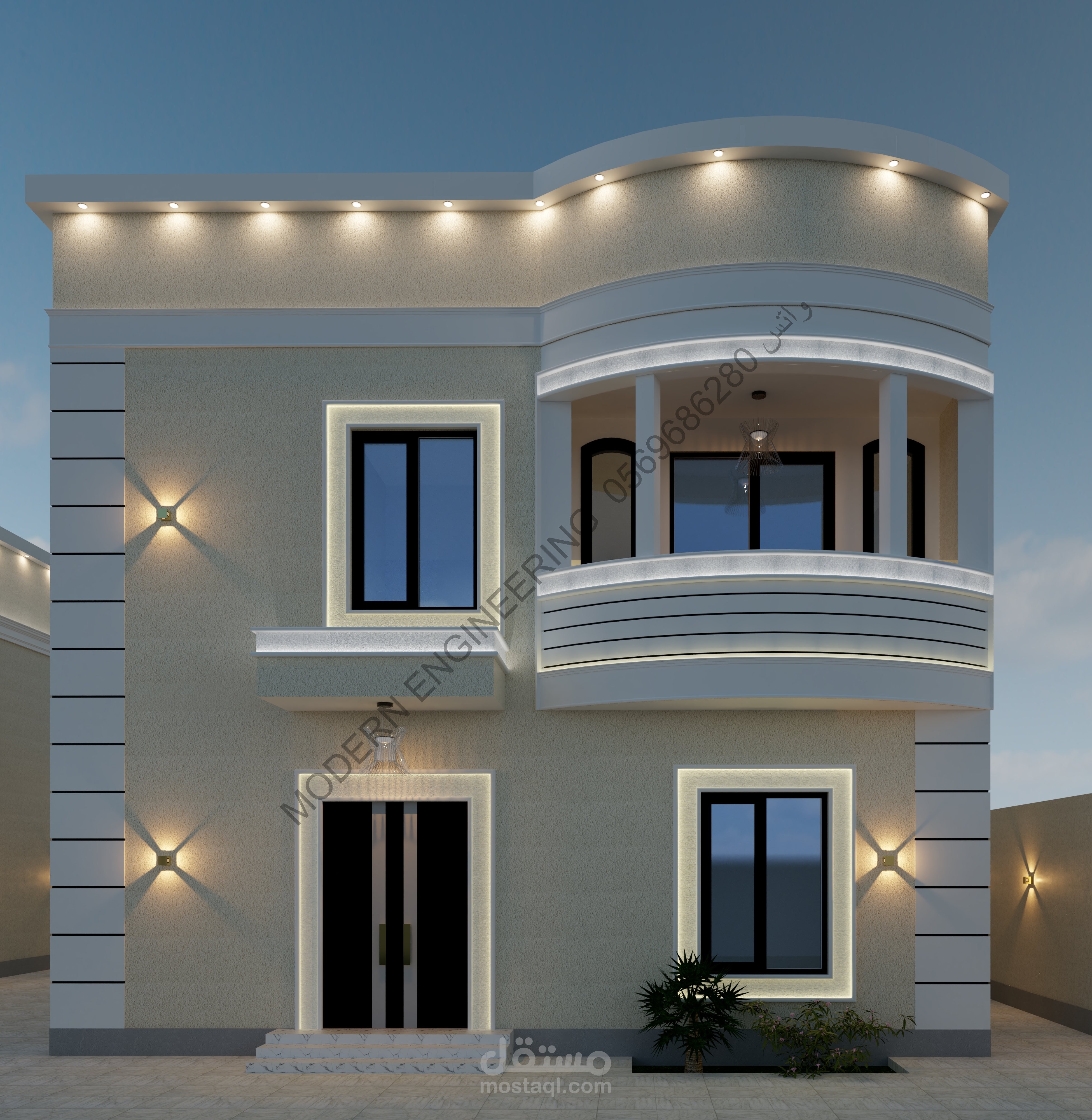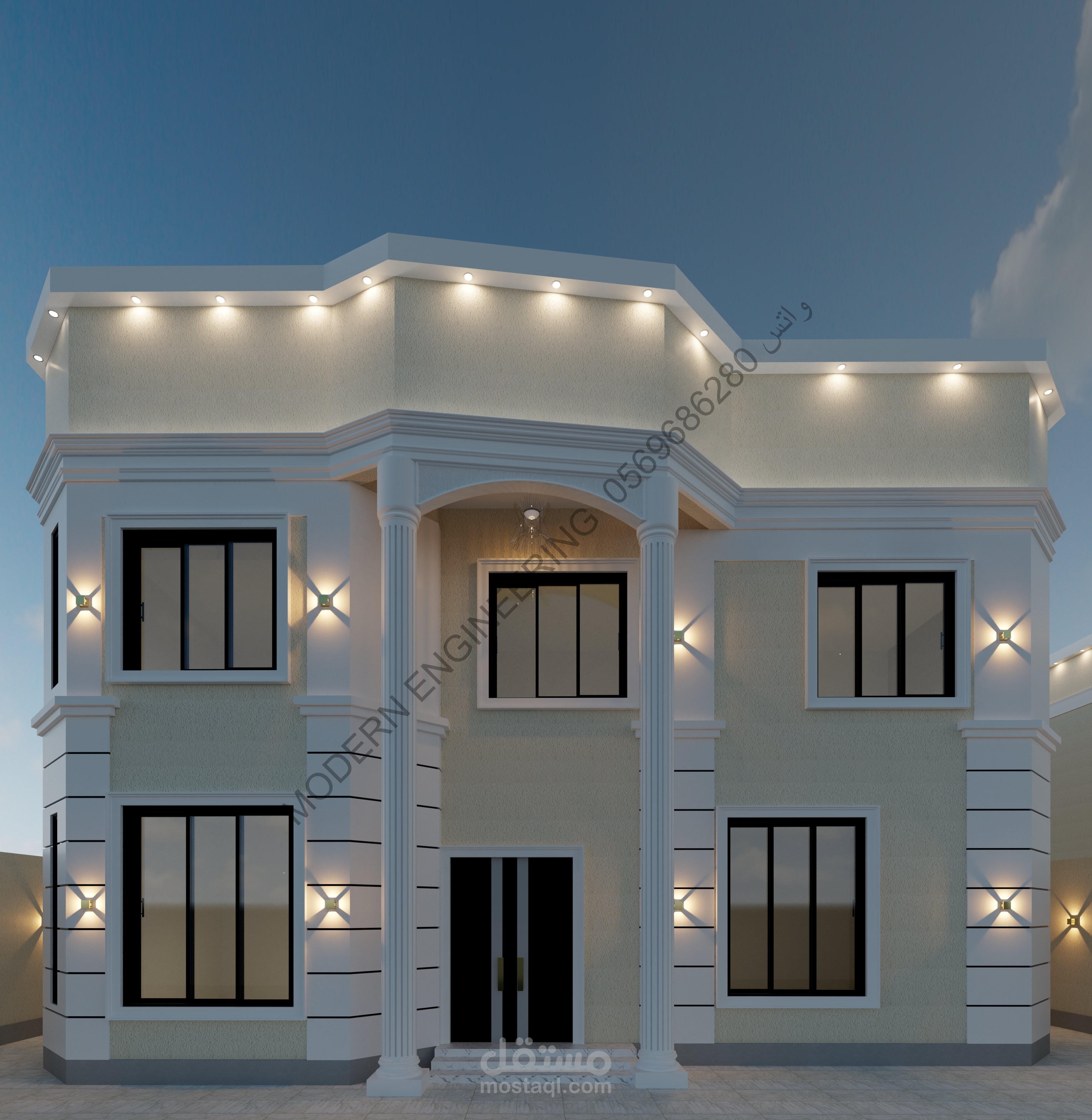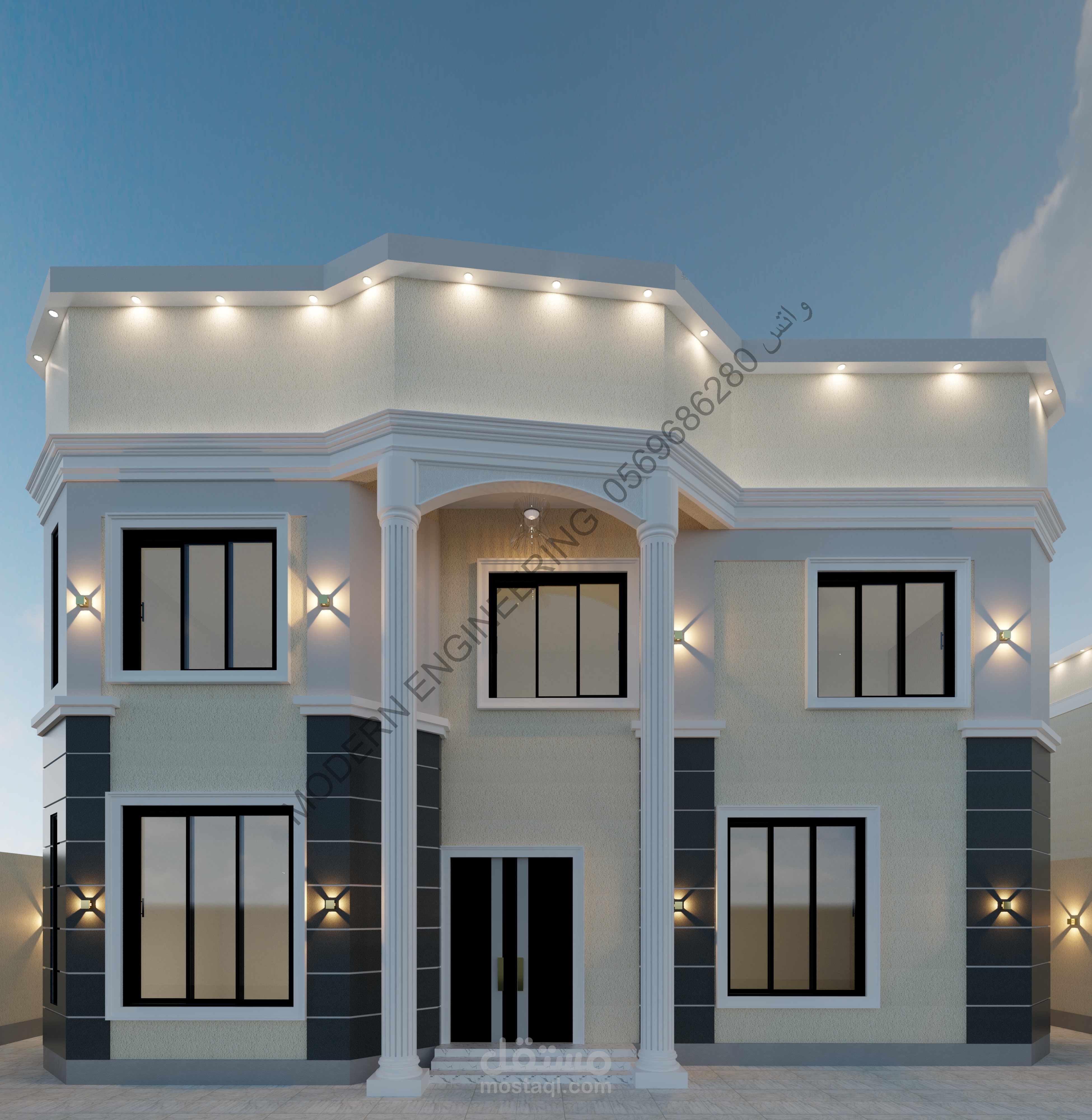 تطوير وتعديل واجهات فلتين متجاورتين بإضافة مادة الجي ار سي وتبويشات اسمنتية اما تكسية الواجهات فهي من مادة البروفايل ومخرجات العمل كانت صور ثري دي ليلية ونهارية بالاضافة ل منظور بانورامي 360 درجة ويتوفر ايضا صور العظم للفلل