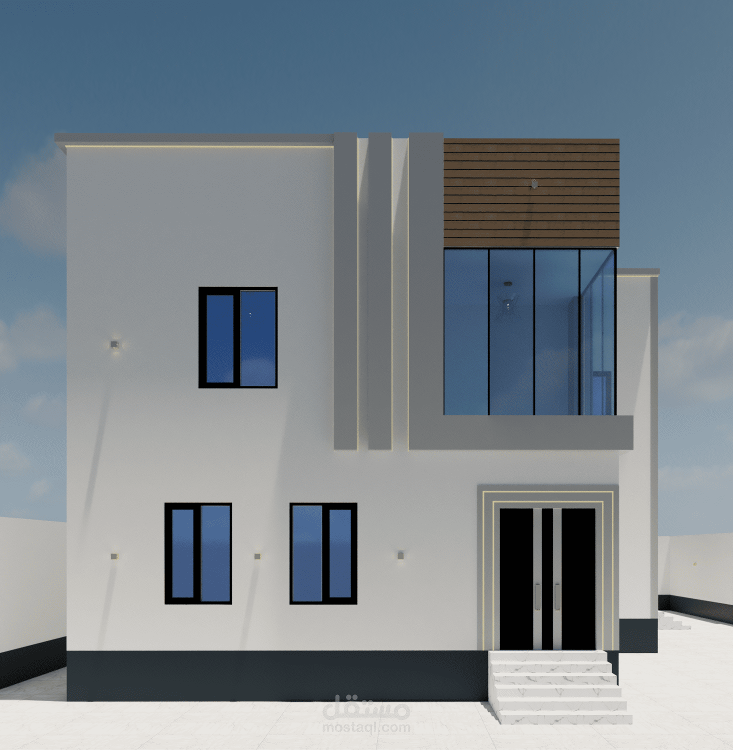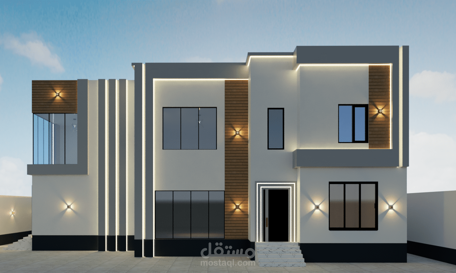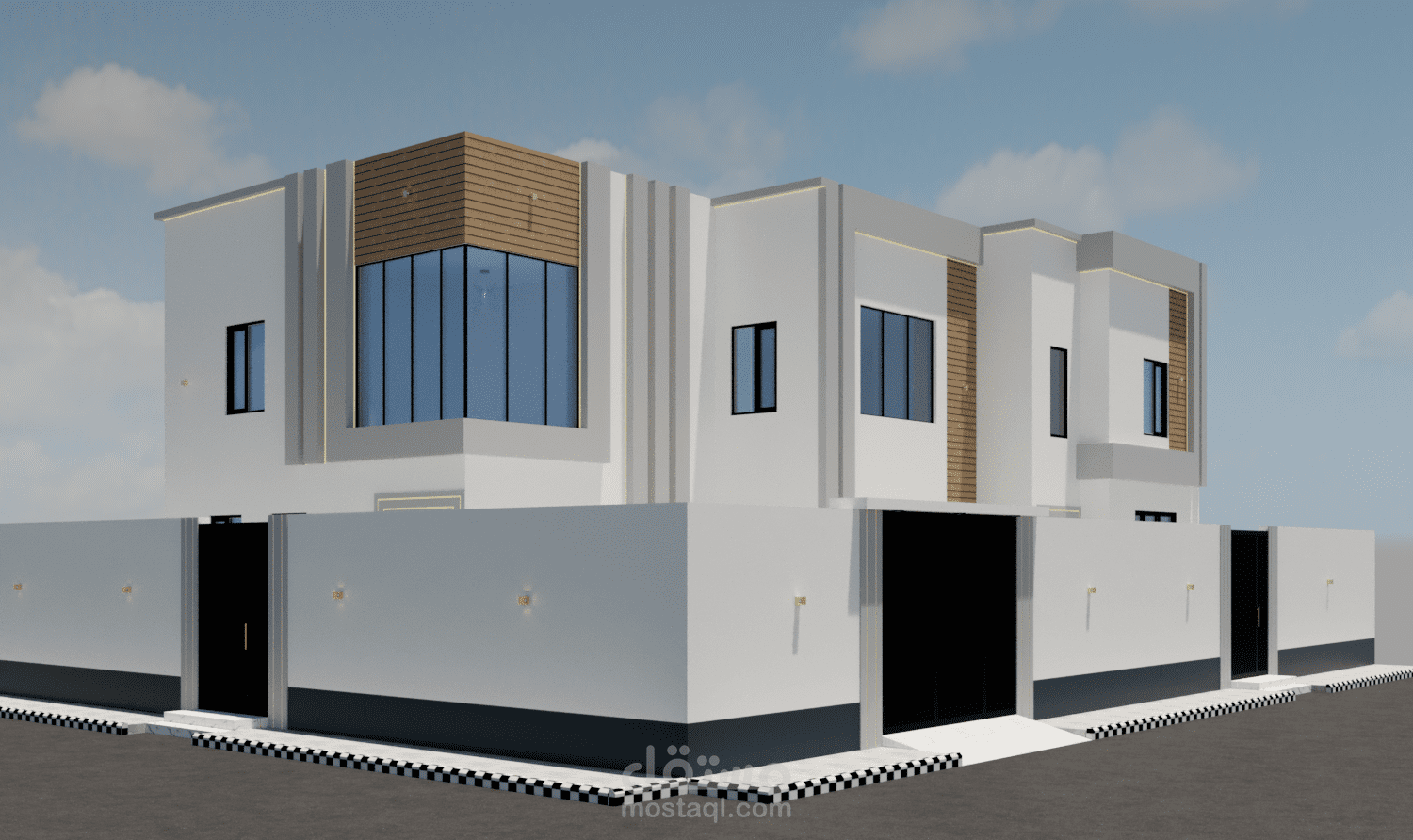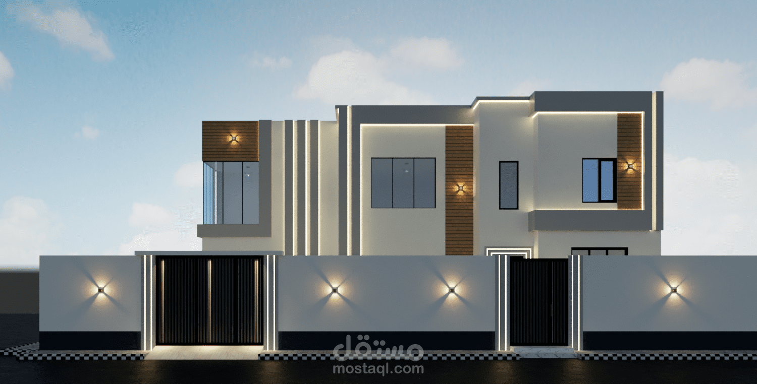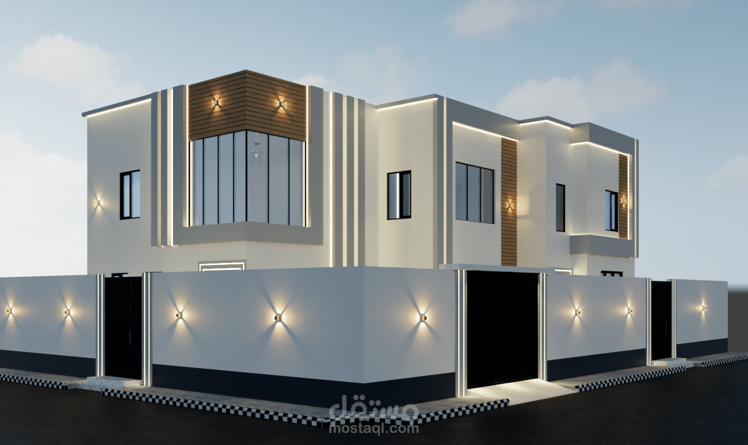 تصميم واجهتين فيلا مع تصميم واجهة السور ثري دي مع منظور بانورامي 360 درجة, تم رفع صور للتصميم بلقطات نهارية وليلية وايضا مرفق صور العظم للفيلا على الواقع