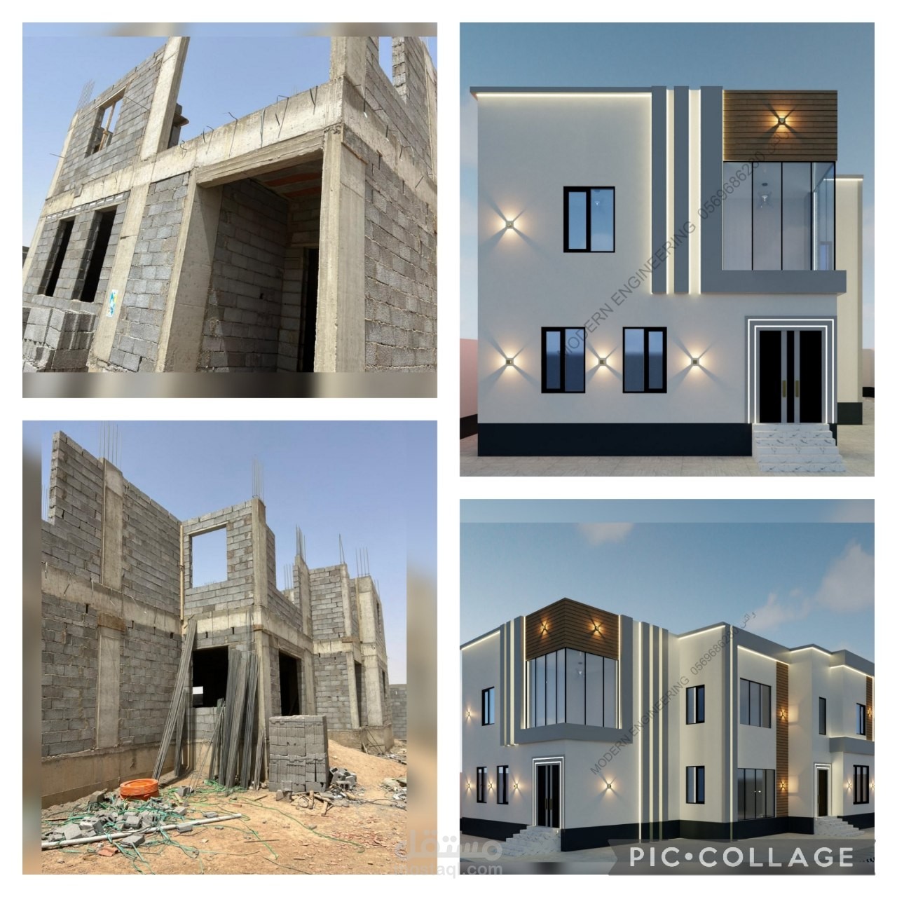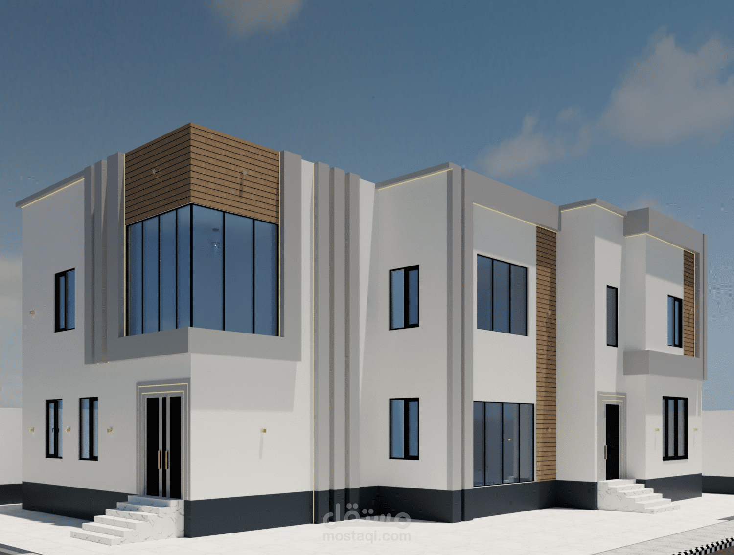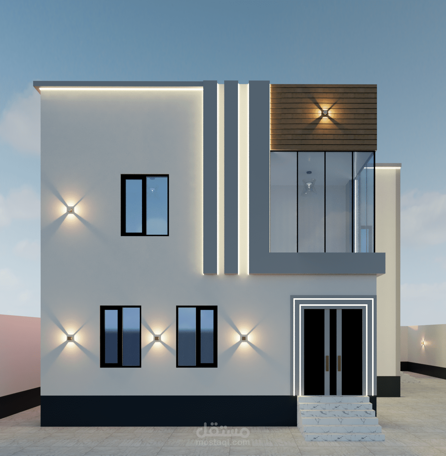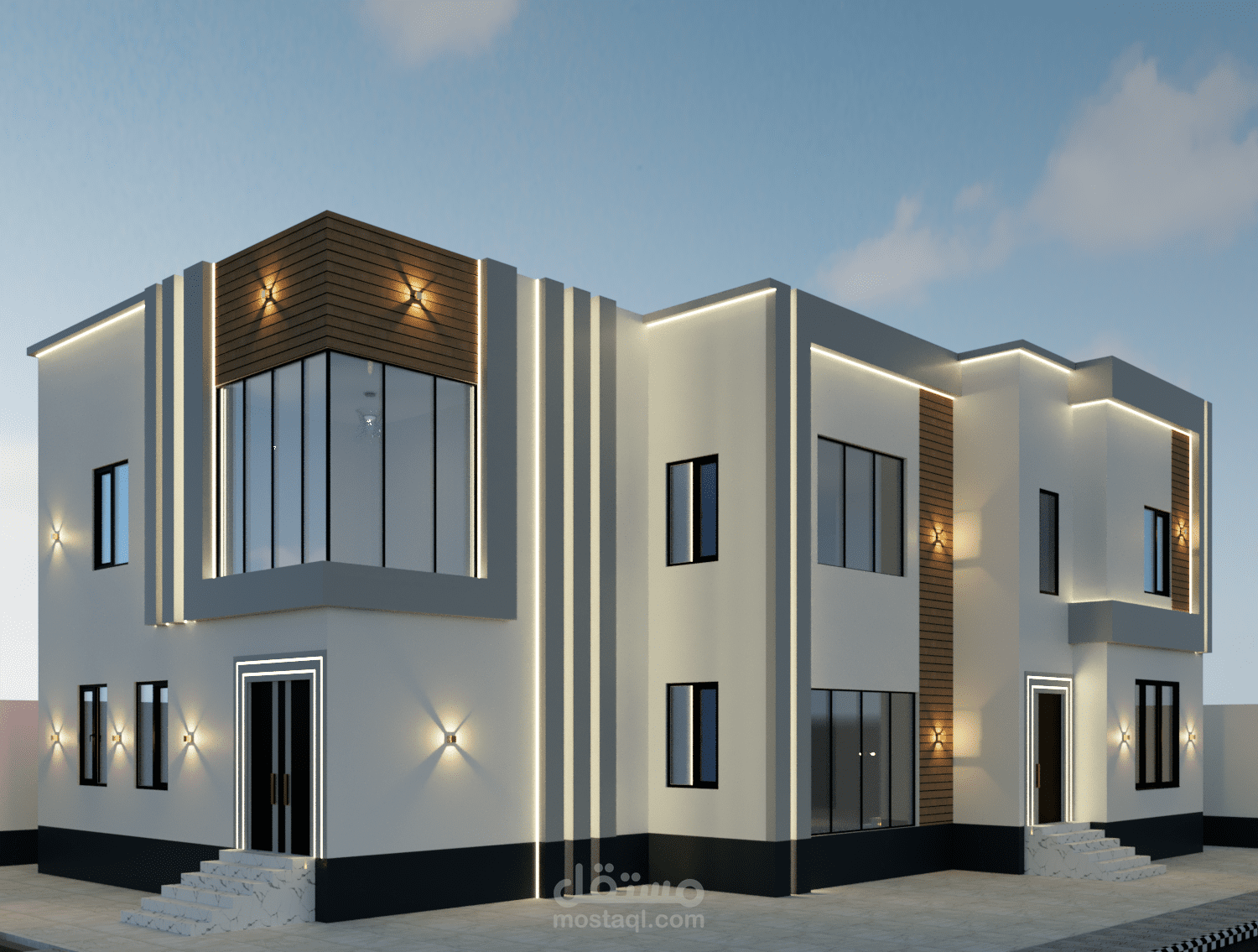 تصميم واجهتين فيلا مع تصميم واجهة السور ثري دي مع منظور بانورامي 360 درجة, تم رفع صور للتصميم بلقطات نهارية وليلية وايضا مرفق صور العظم للفيلا على الواقع
