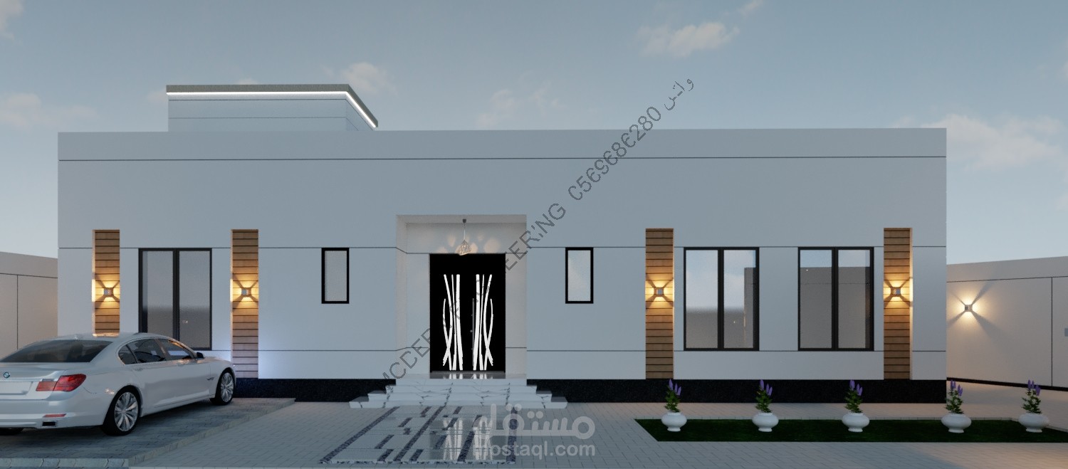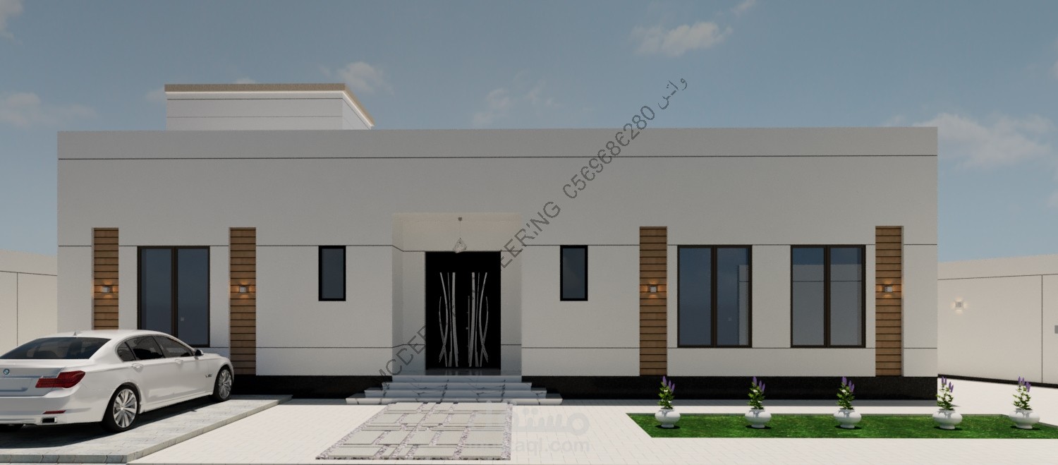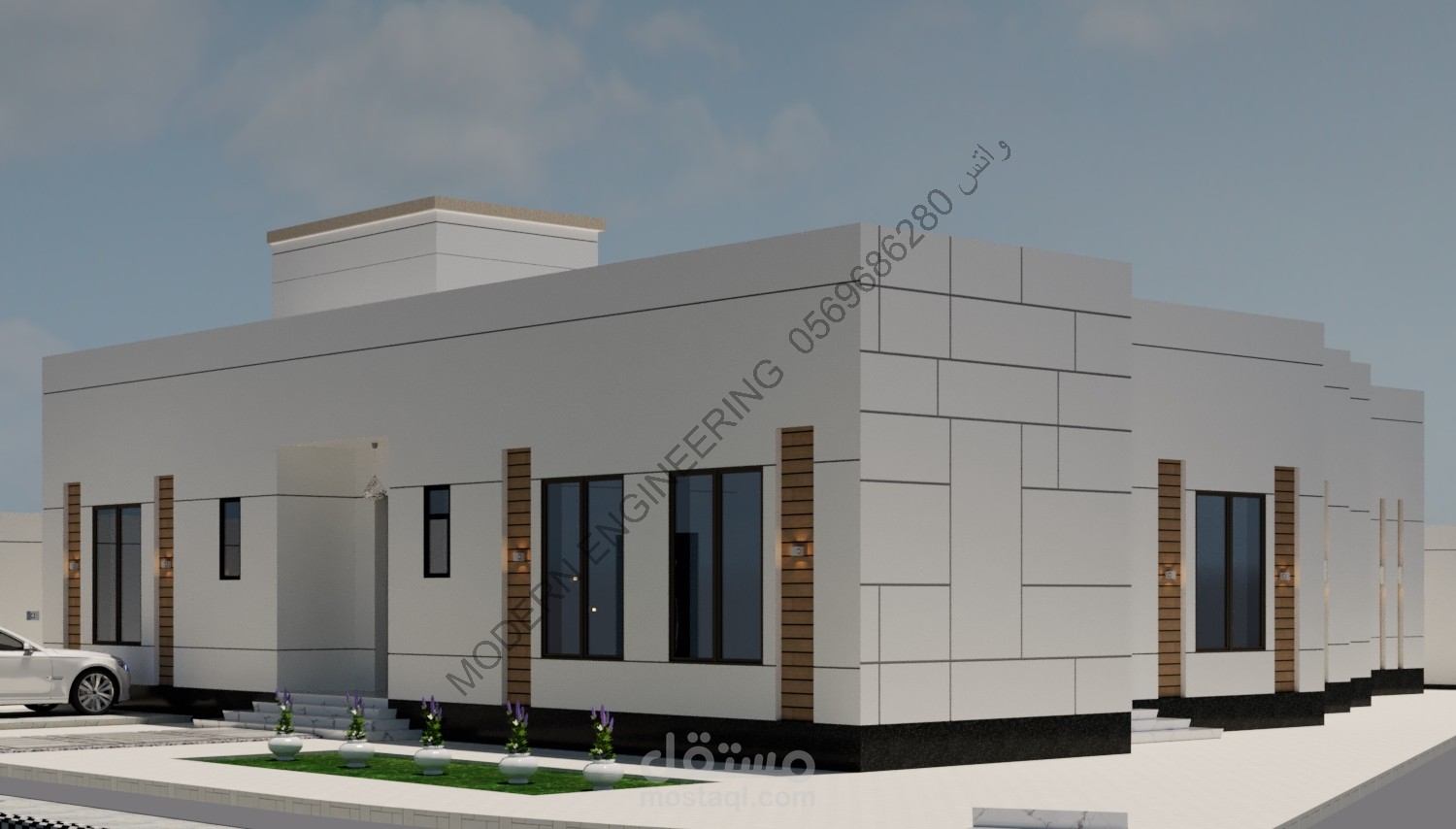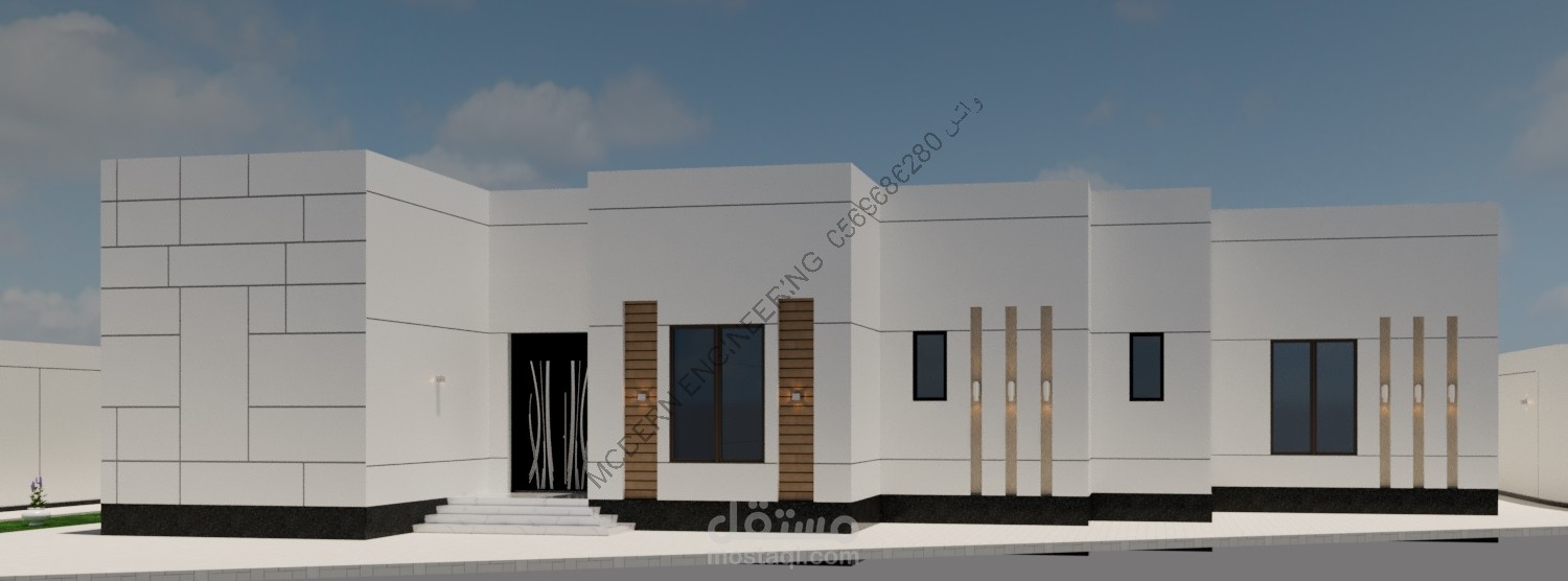 تصميم واجهات فيلا دور واحد مصممة بالكود الجديد وتم استخدام تطعيمات من البورسلان الخشبي اما تكسيه الواجهات دهان خارجي وأيضا استخدمنا قروفات اللياسة.