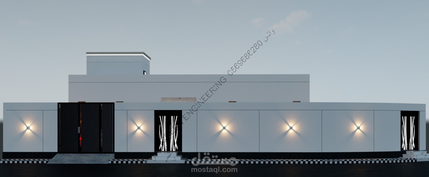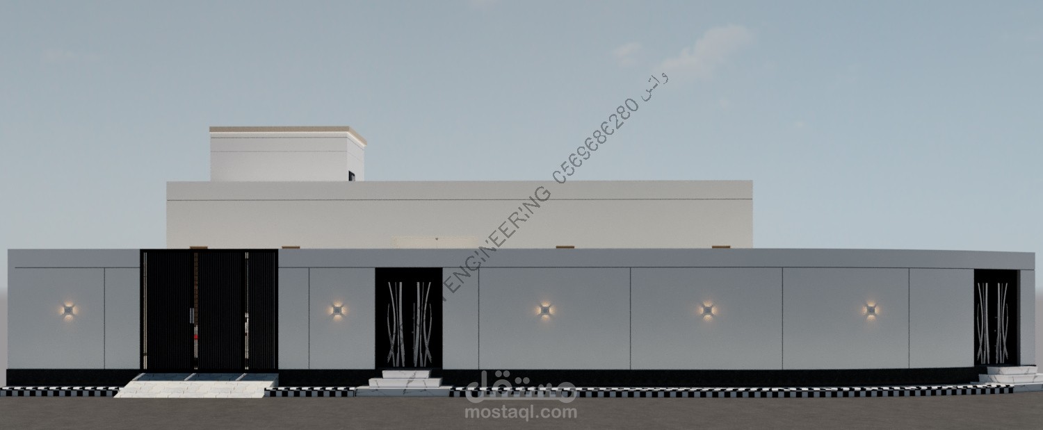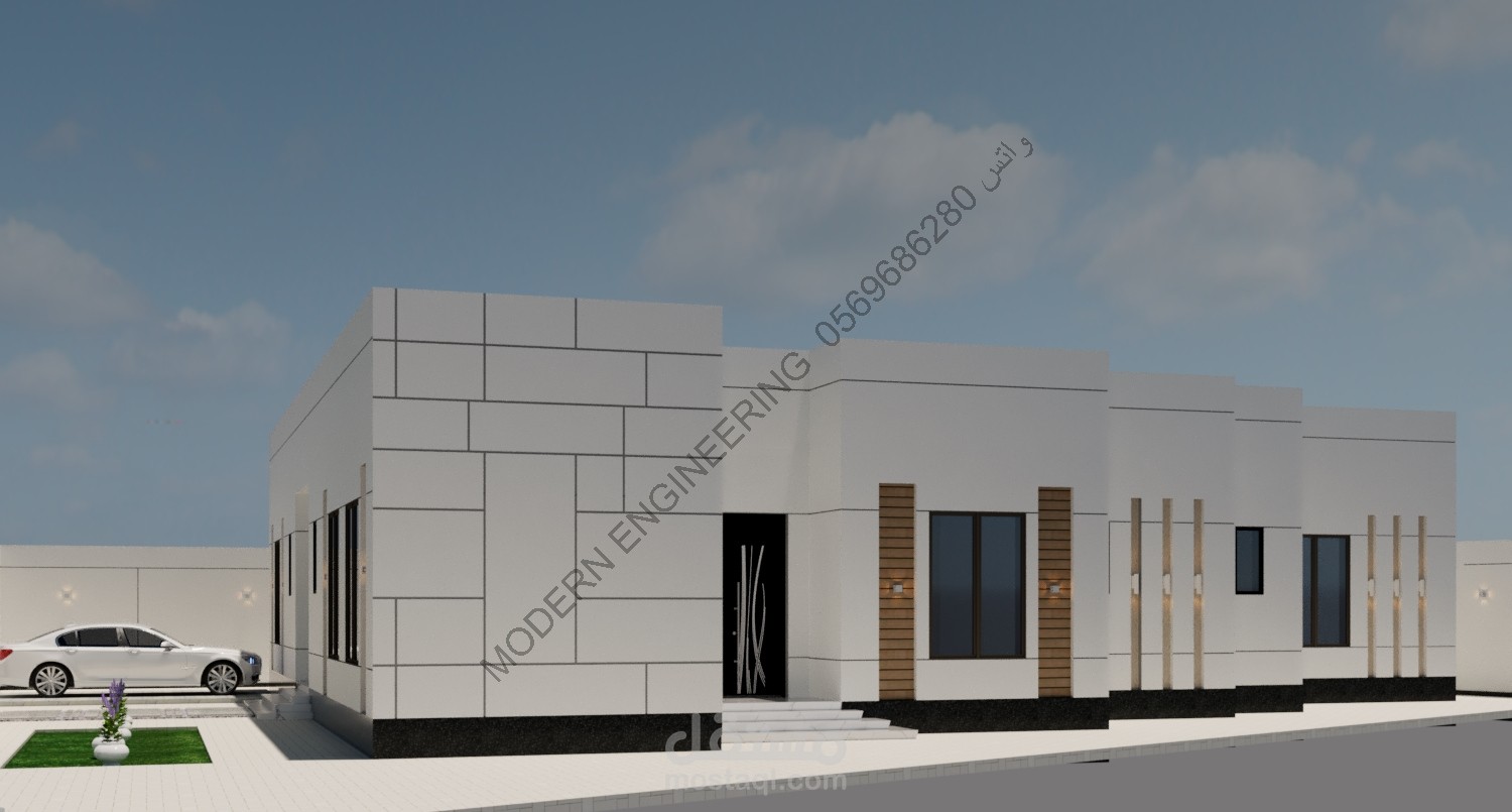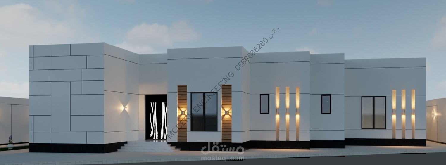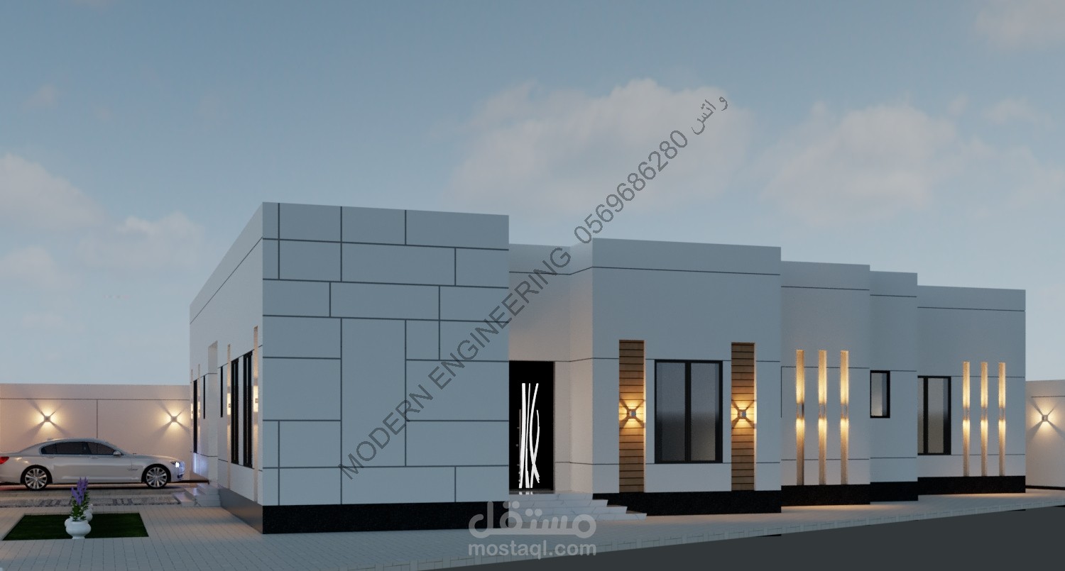 تصميم واجهات فيلا دور واحد مصممة بالكود الجديد وتم استخدام تطعيمات من البورسلان الخشبي اما تكسيه الواجهات دهان خارجي وأيضا استخدمنا قروفات اللياسة.