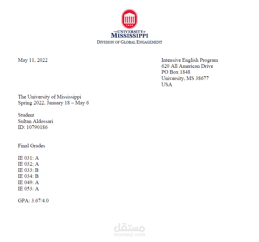 حاصل على شهاده من معهد الغه IEP في جامعه Universaty of Mississippi بتقدير ممتاز