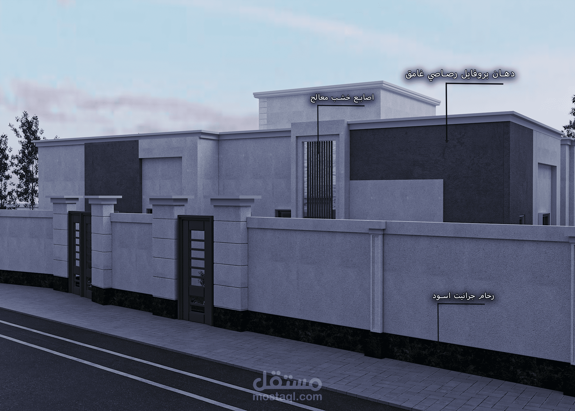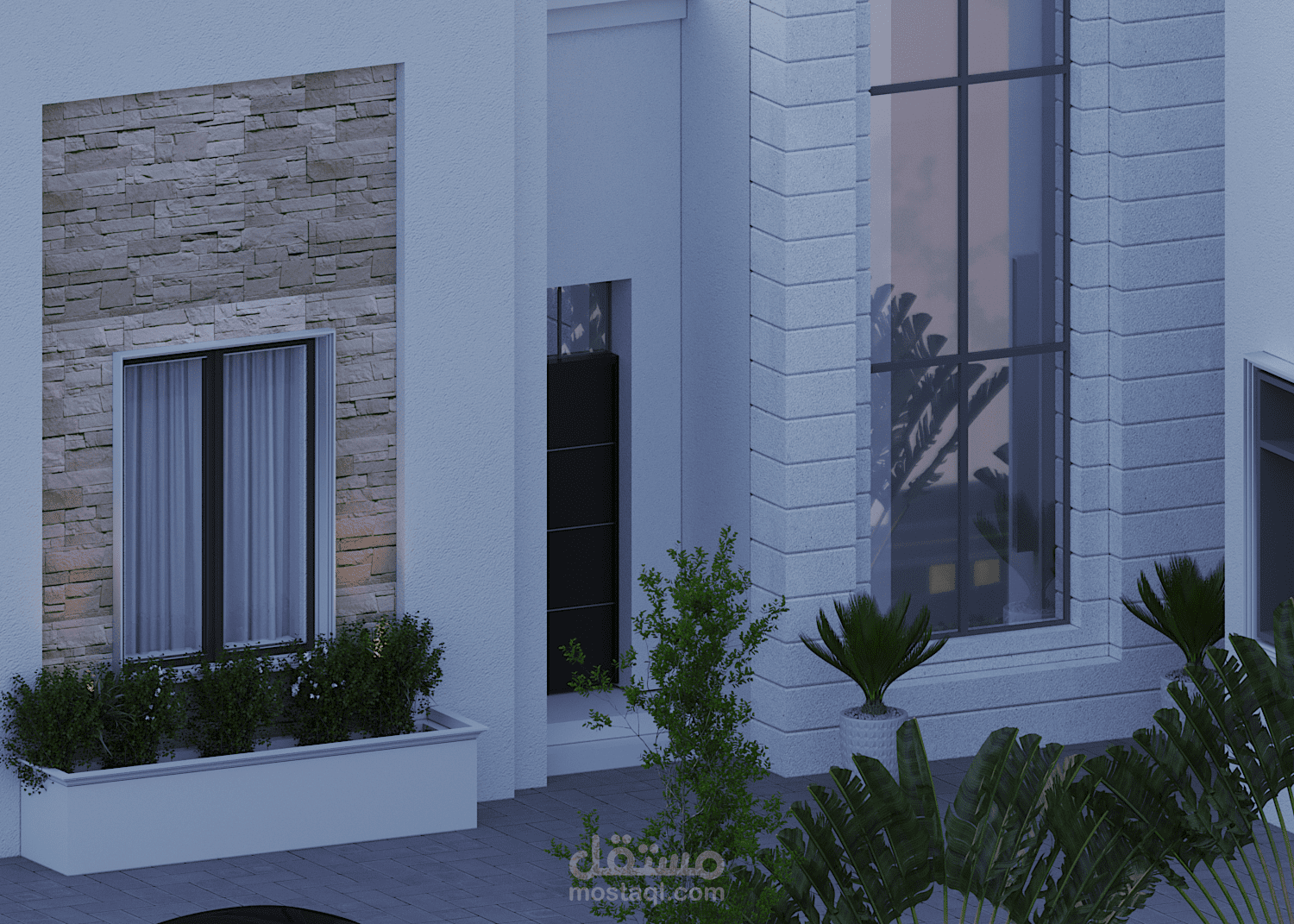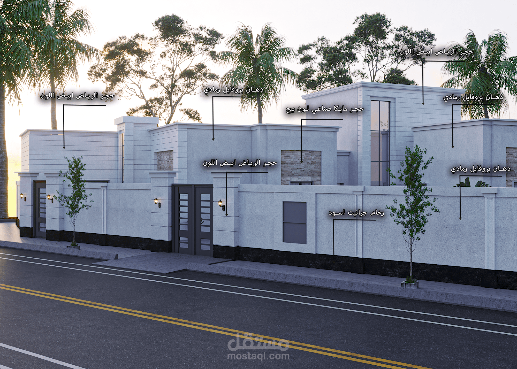 تصميم فيلا طابق ارضي في جنوب السعودية مع مراعات استخدام خامات معينة بناء على طلب العميل و محاولة زيادة الارتفاع بقدر الامكان