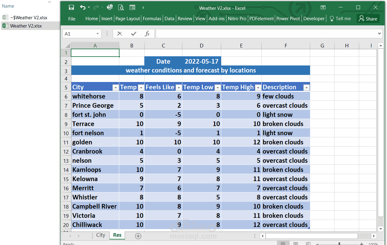 عمل ملف اكسل يتم تحديثة تلقايئا يقوم باحضار درجات الحرارة الحالية والمحسوسة والصغري والعظمي ووصف الطقس عن طريق API والاكسيل