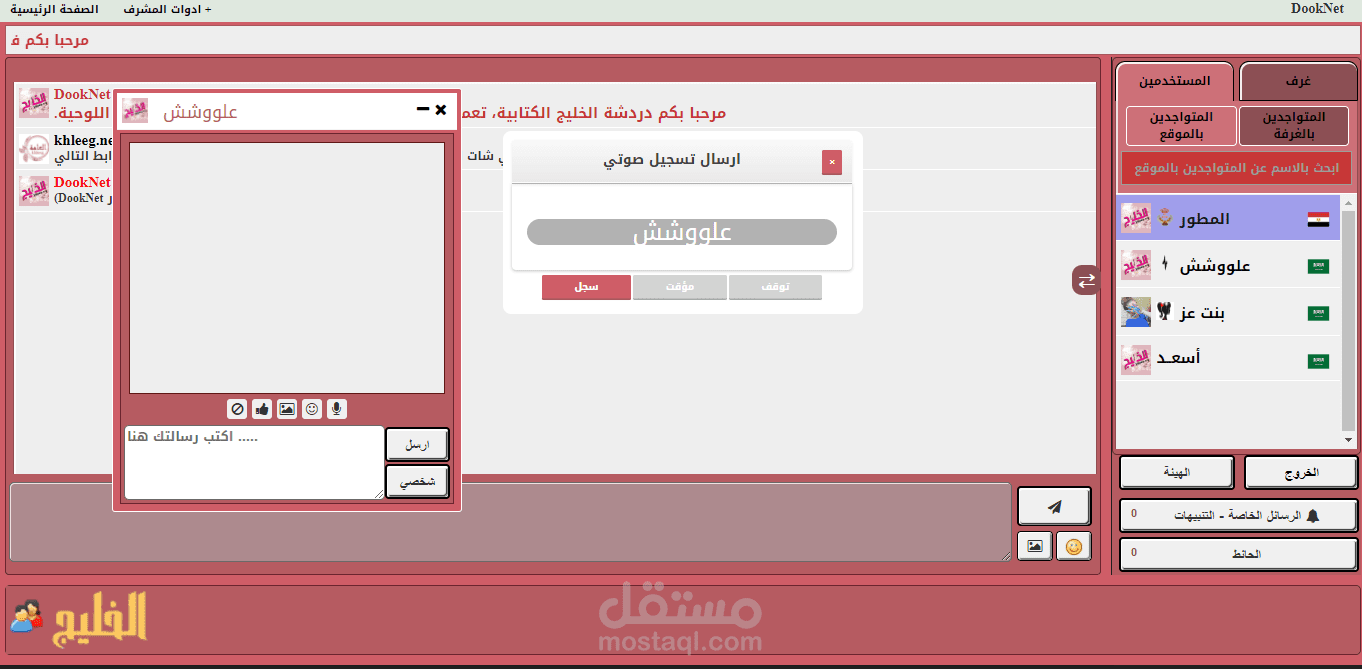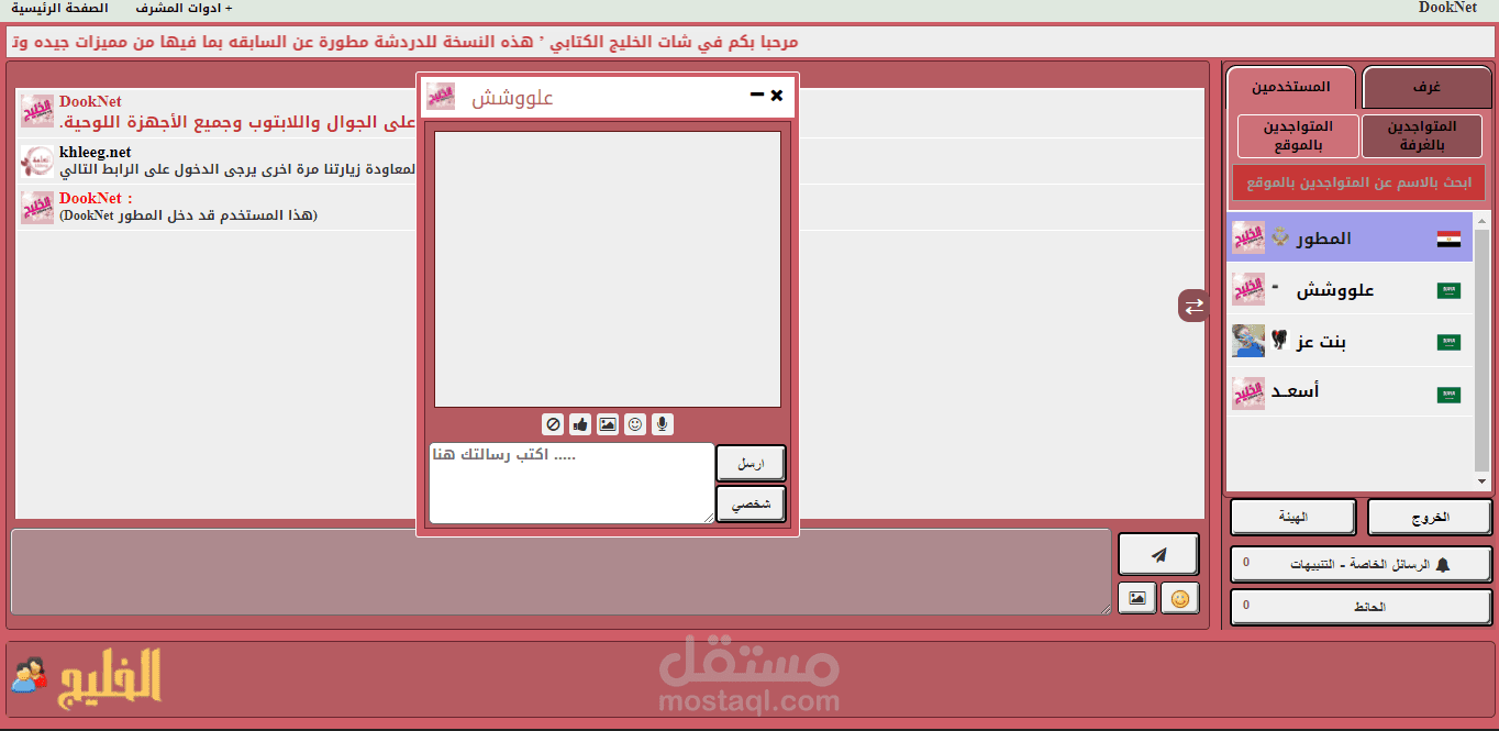 يمكن في الشات انشاء غرفة جماعية بكلمة مرور او بدونه ( للجميع او للمشرفين )