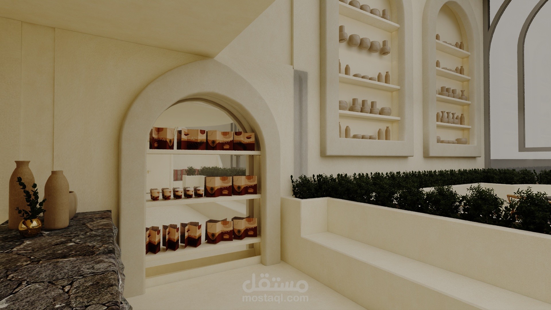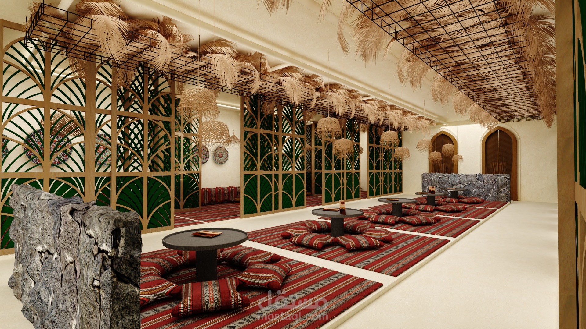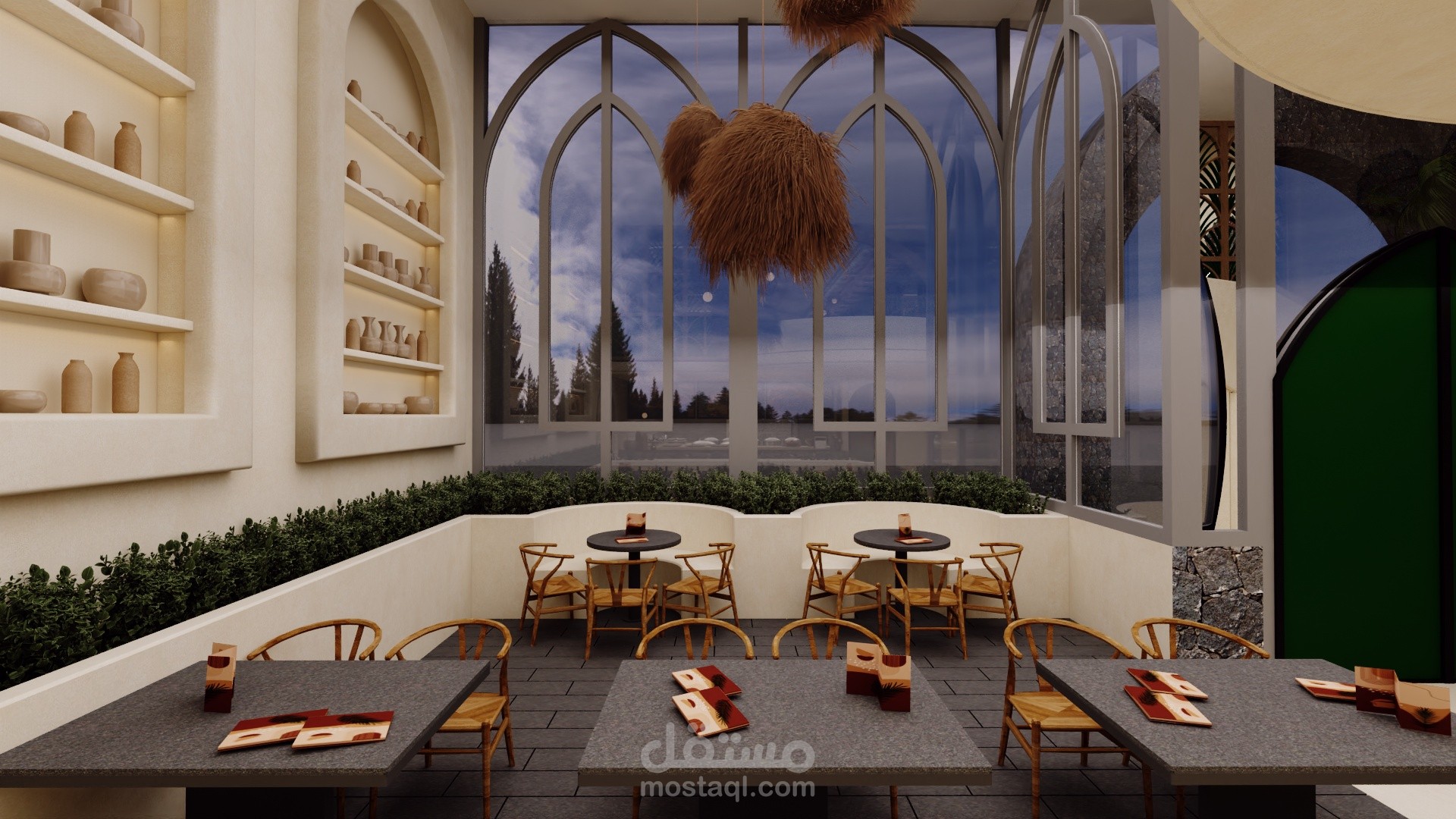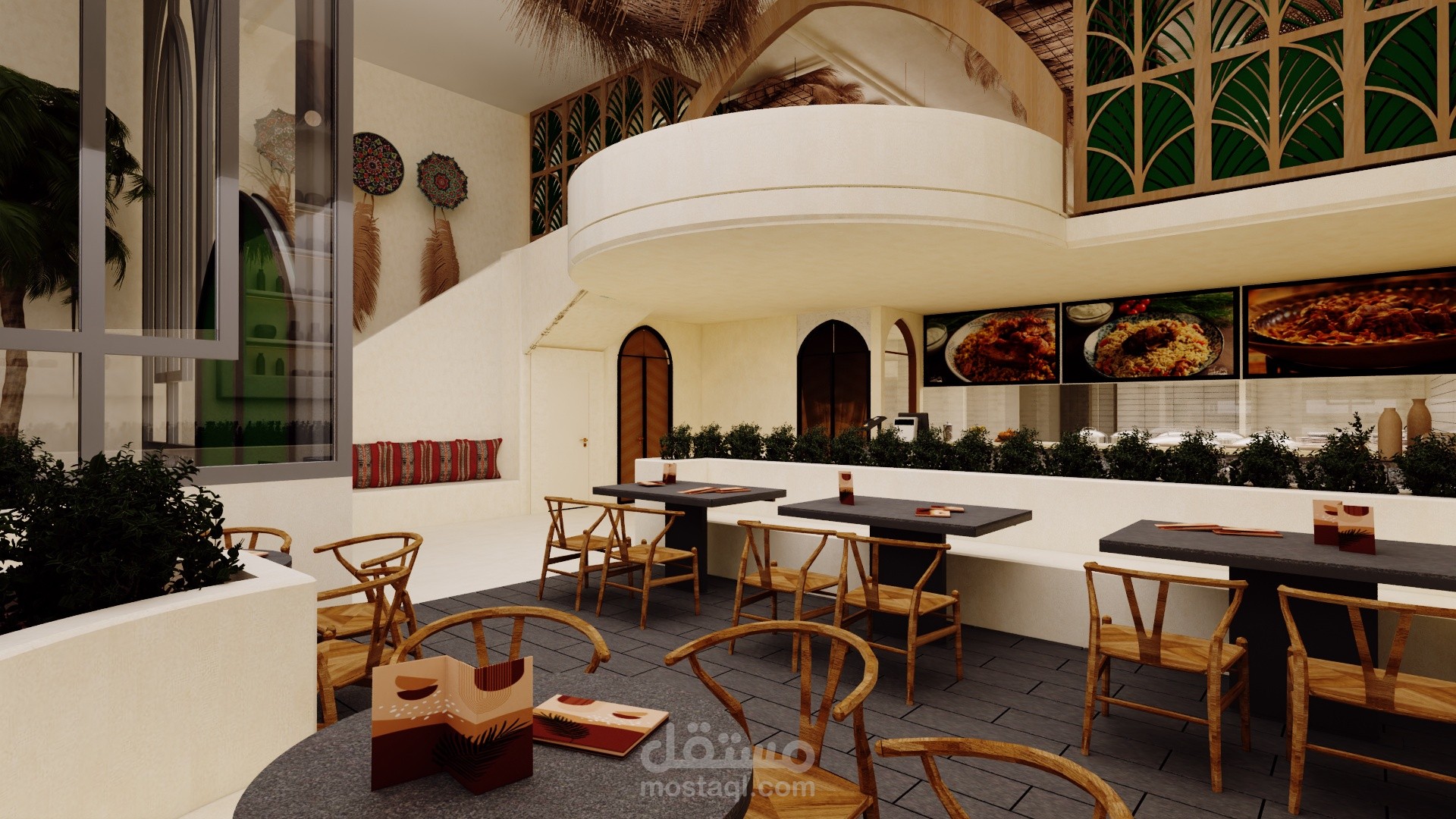 A traditional restaurant that reflects the heritage of Medina / its relationship with simple handmade bricks and volcanic black stone / the distinctiveness of its palm trees and mint