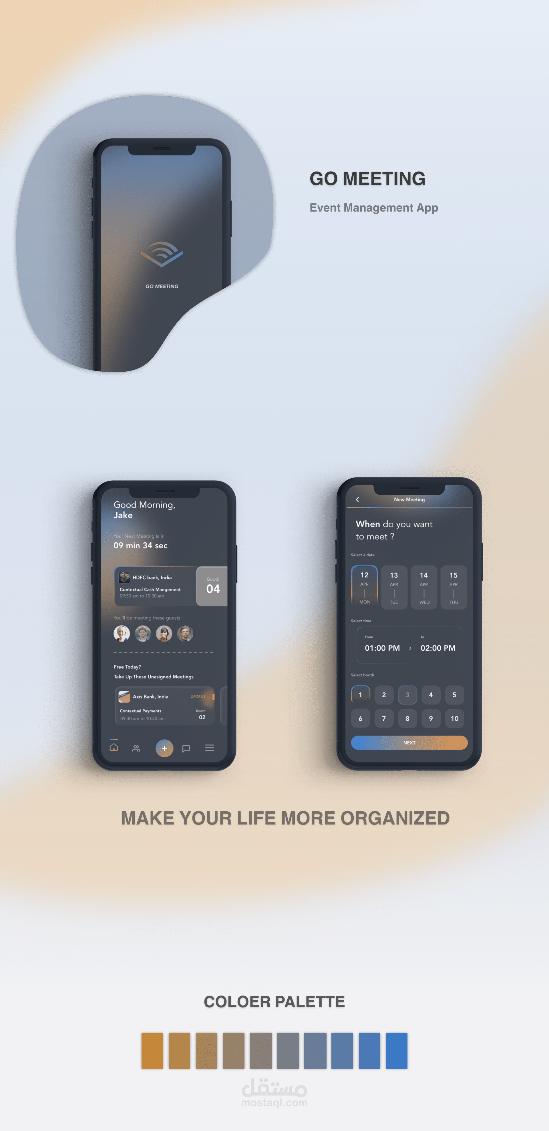 you can see the home page shows you your meetings and suggests in your spare time some meetings close to your field, you also have a meeting booking page with its detalis.