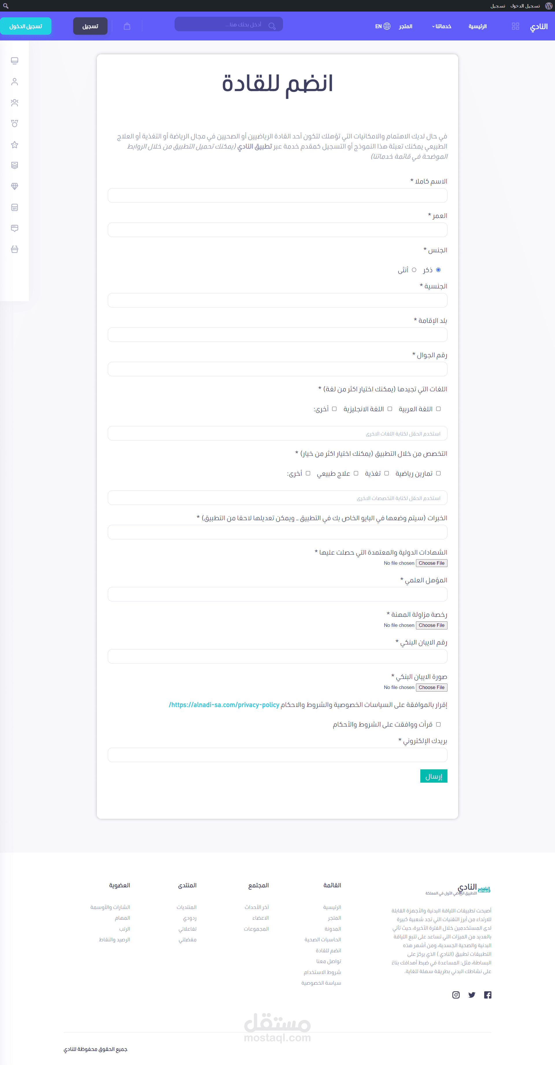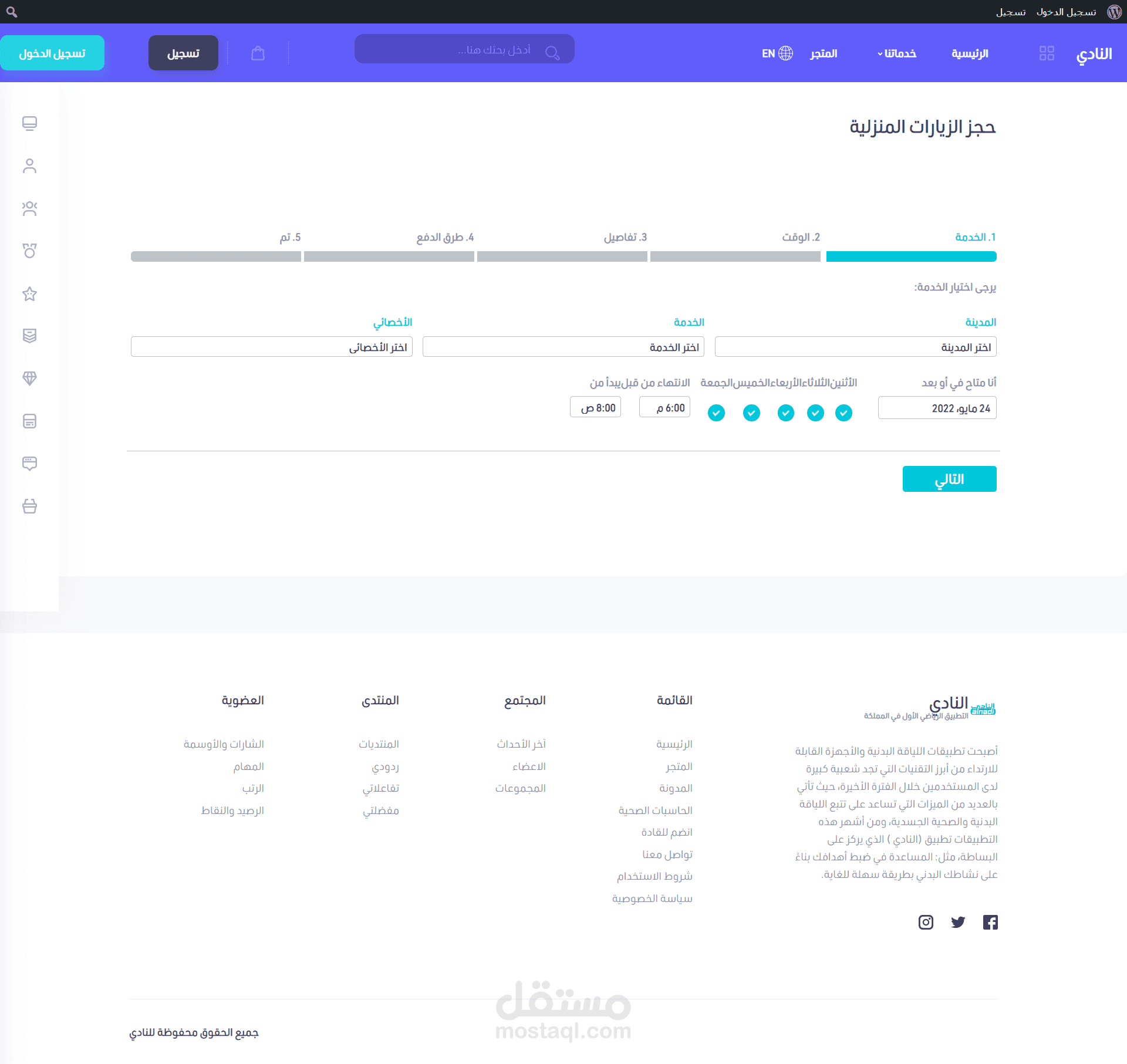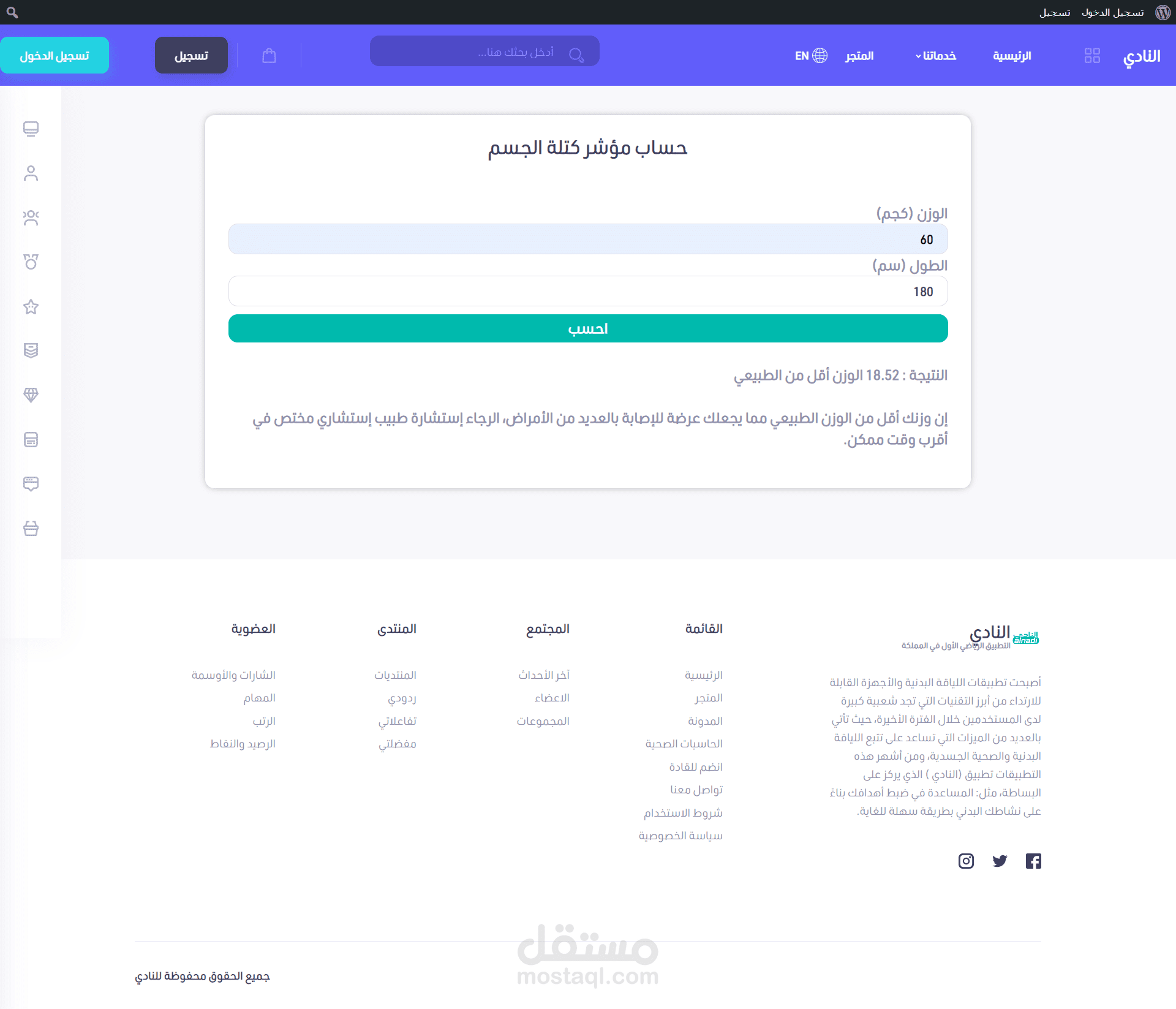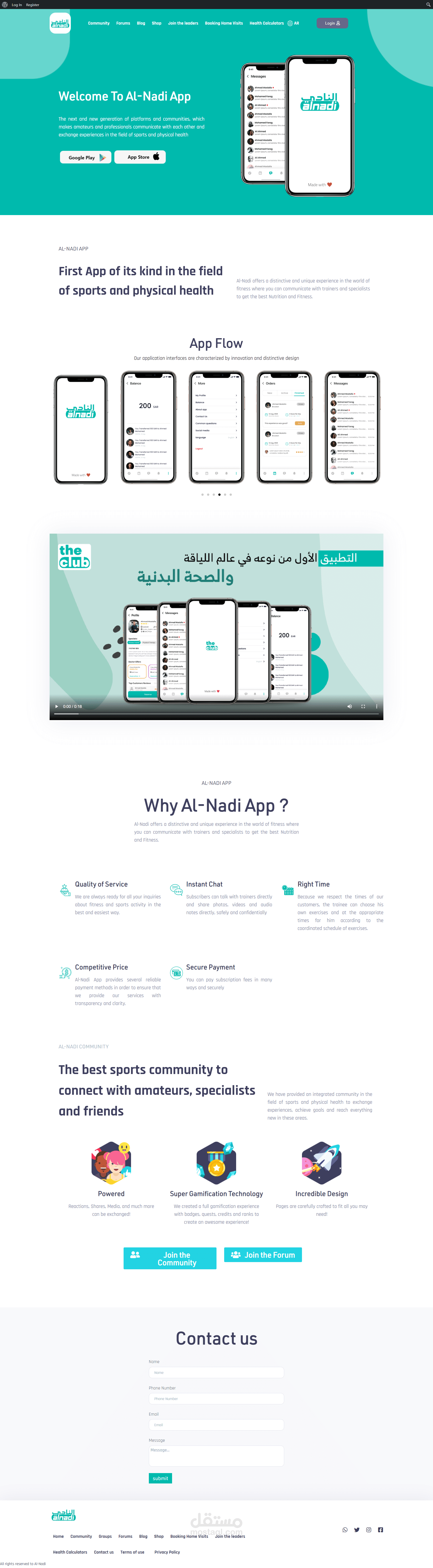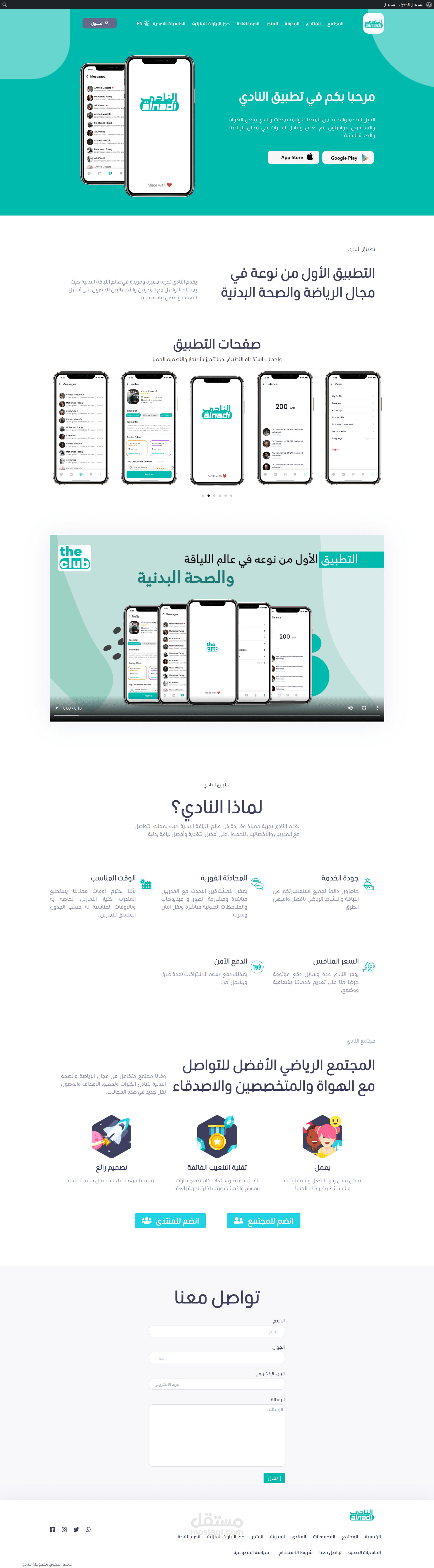 النادي موقع تعريفي لتطبيق النادي + مجتمع تفاعلي + منتدى ونقاشات + مدونة ومقالات + متجر ومفعل عليه طرق الدفع بالفيزا وماستركارد + نظام حجوزات لحجز الاستشارات اونلاين بالموعد الذي يحدده الزبون والذي يتوافق مع اوقات المدرب او المستشار + حاسبات صحية في الموقع... الموقع متعدد اللغات عربي انجليزي
