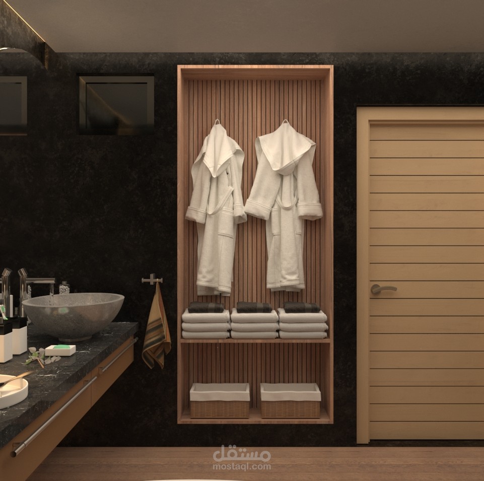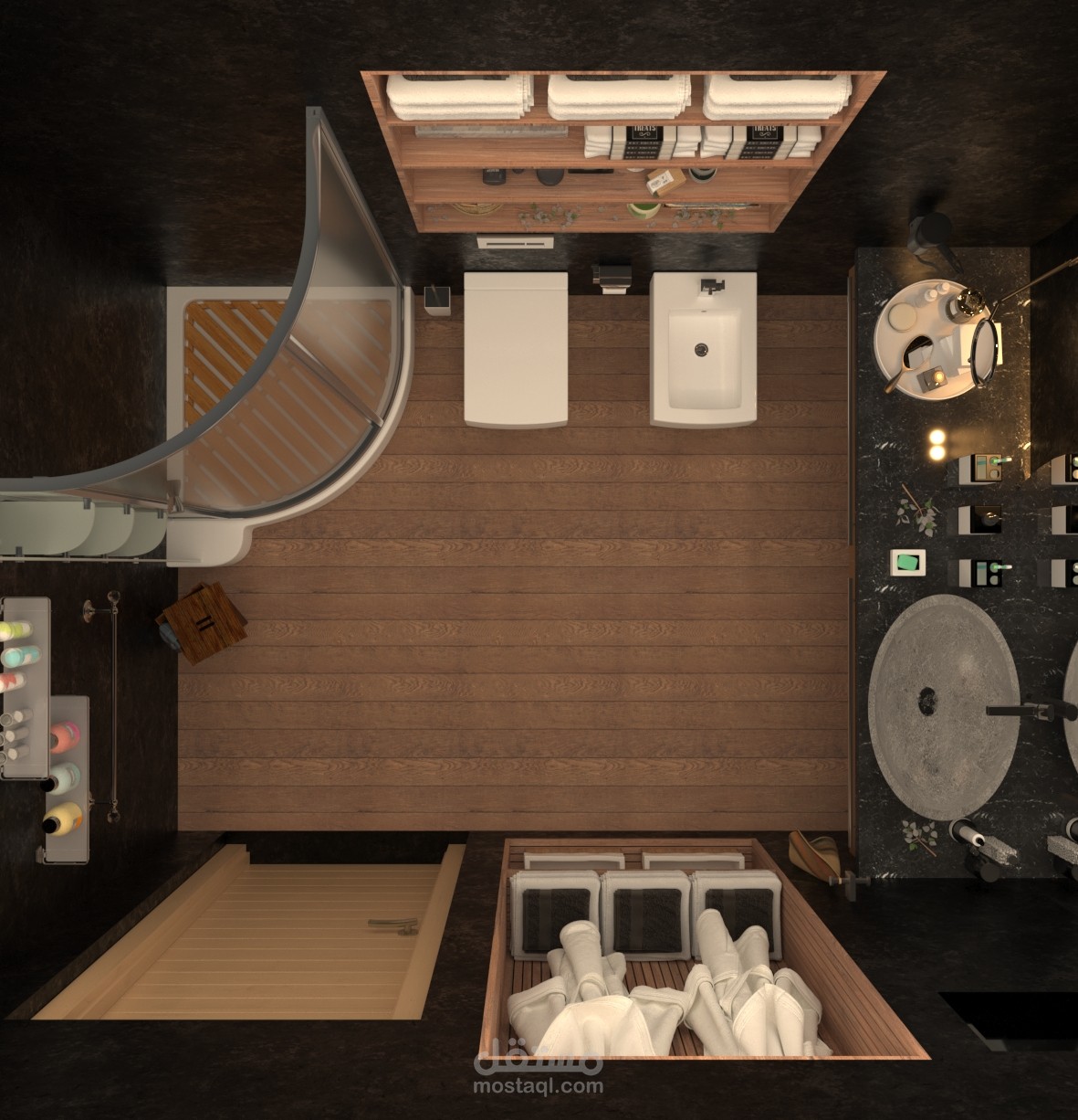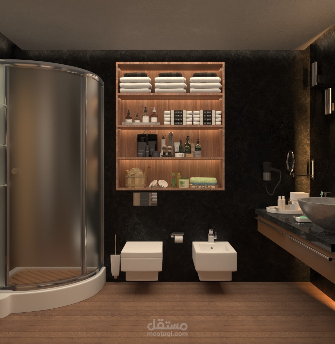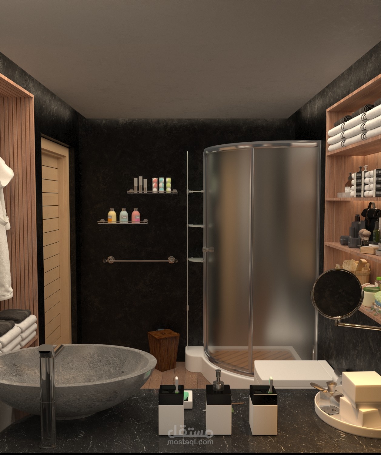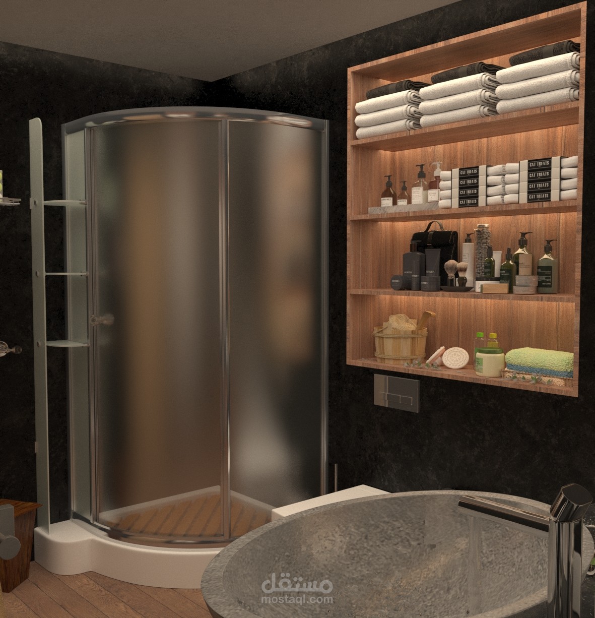 تصميم مودرن لحمام مع استغلال ل المساحات و خزائن جدارية باستخدام برامج ال 3DsMax , Rhino