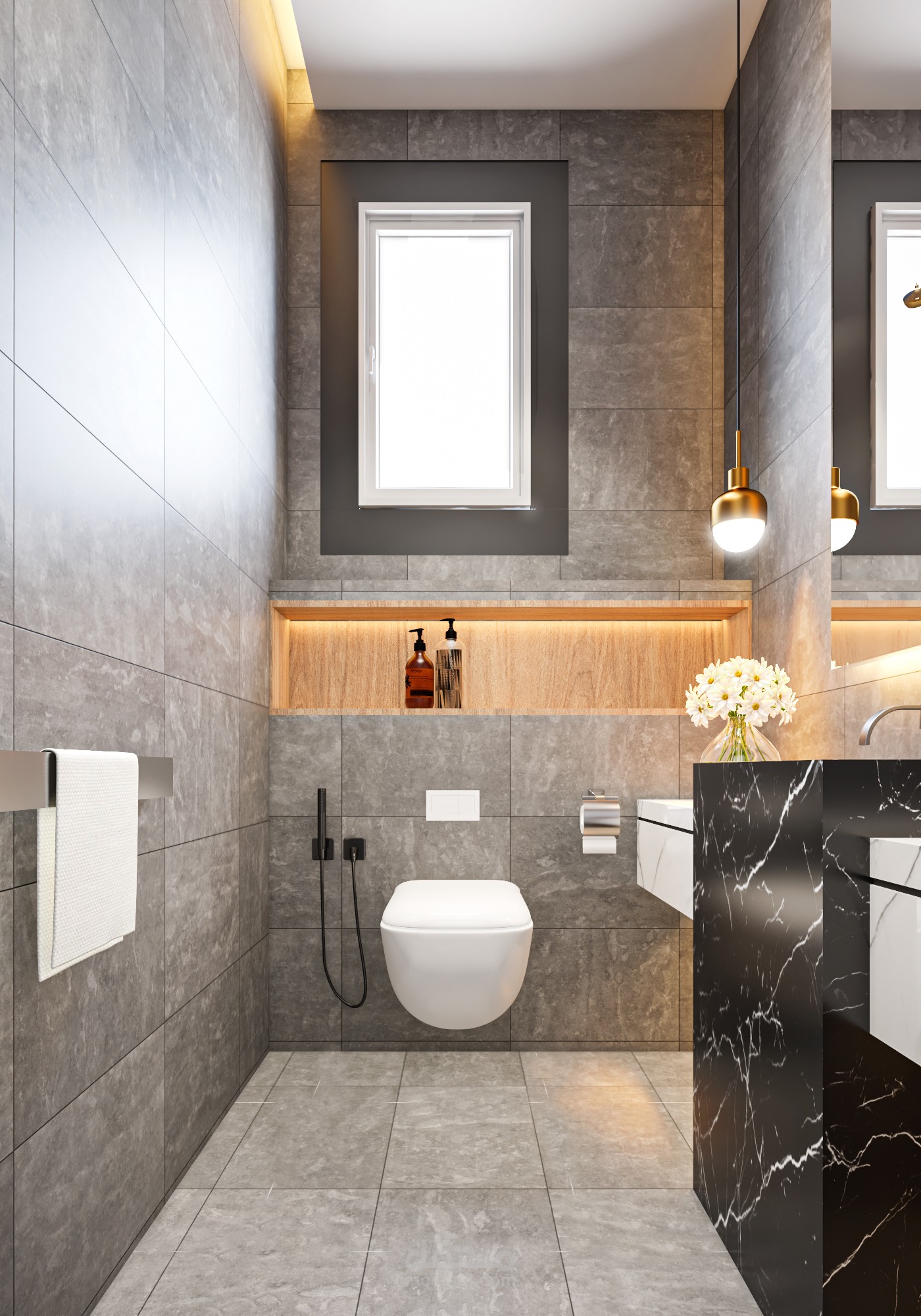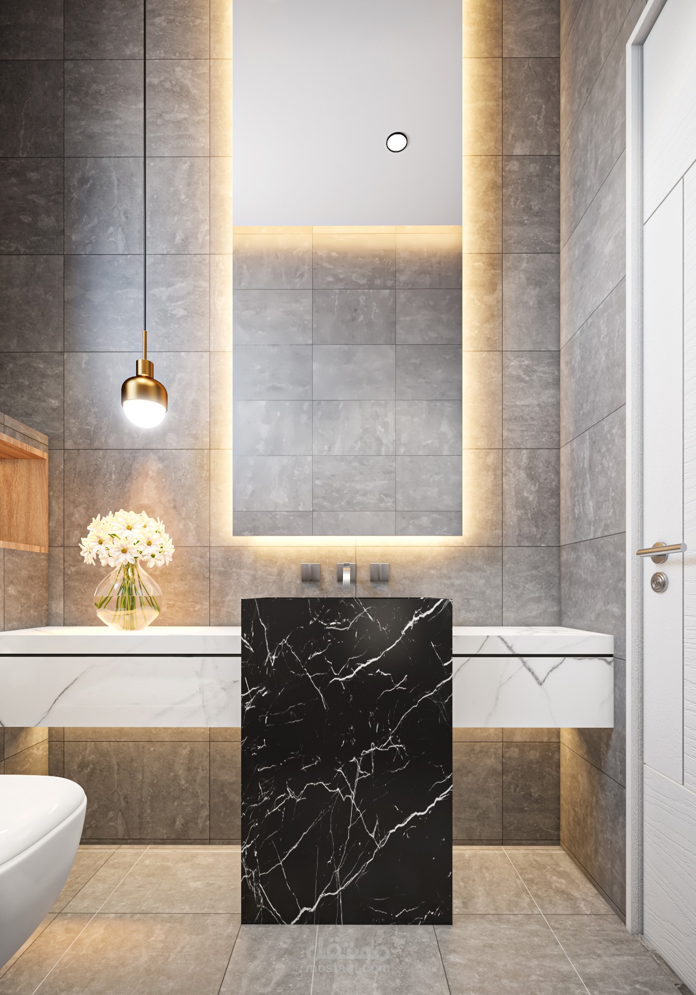 تصميمي لمجلس رجال مع حمام ضمن فيلا في المملكة العربية السعودية بناء على متطلبات واحتياجات العميل