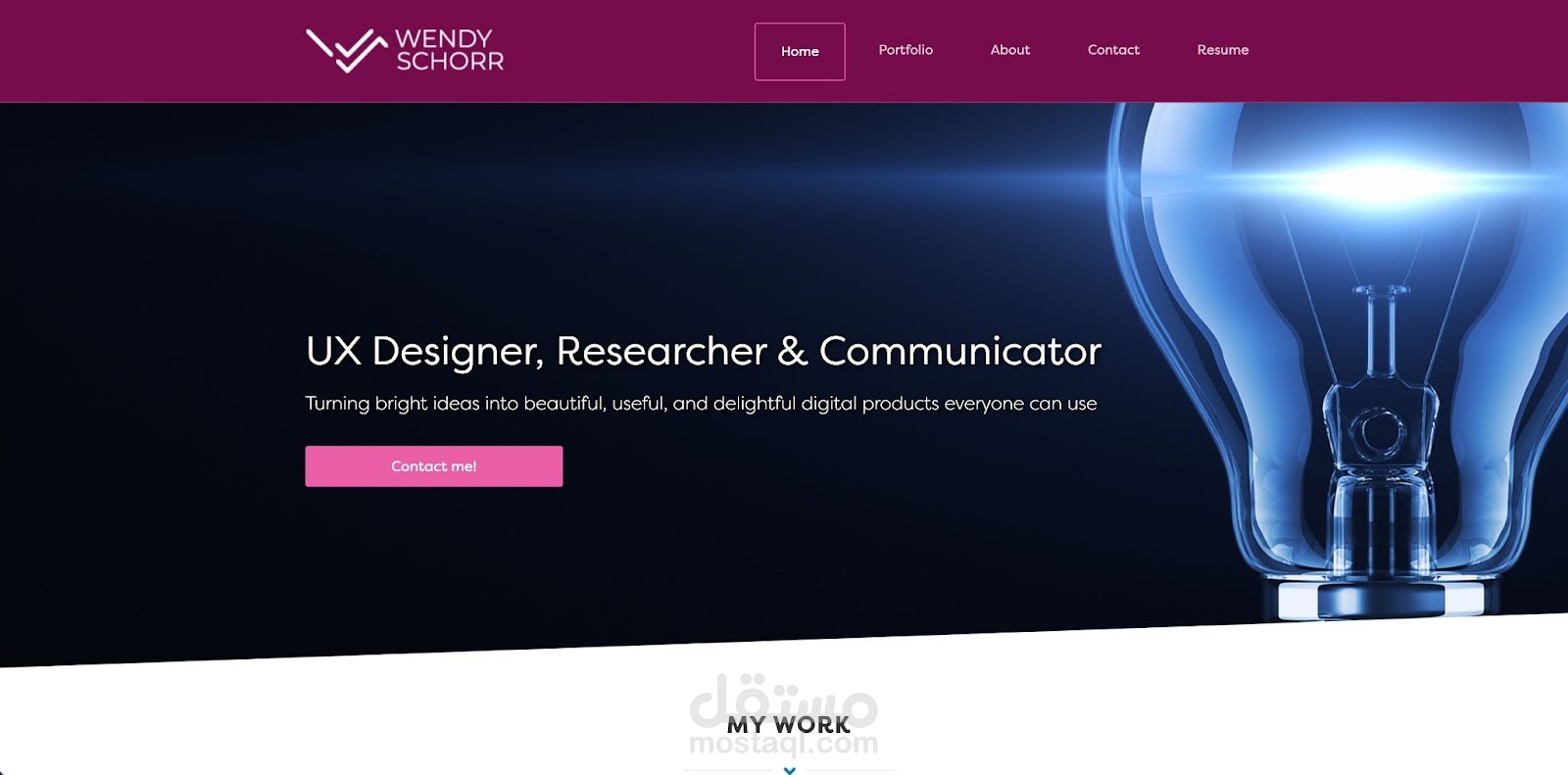 تفتح صفحة Wendy Schorr بمصباح به خيوط متوهجة. إنها مباراة مثالية لبيان رسالتها ، "تحويل الأفكار الساطعة إلى منتجات رقمية جميلة ومفيدة ومبهجة يمكن للجميع استخدامها".
