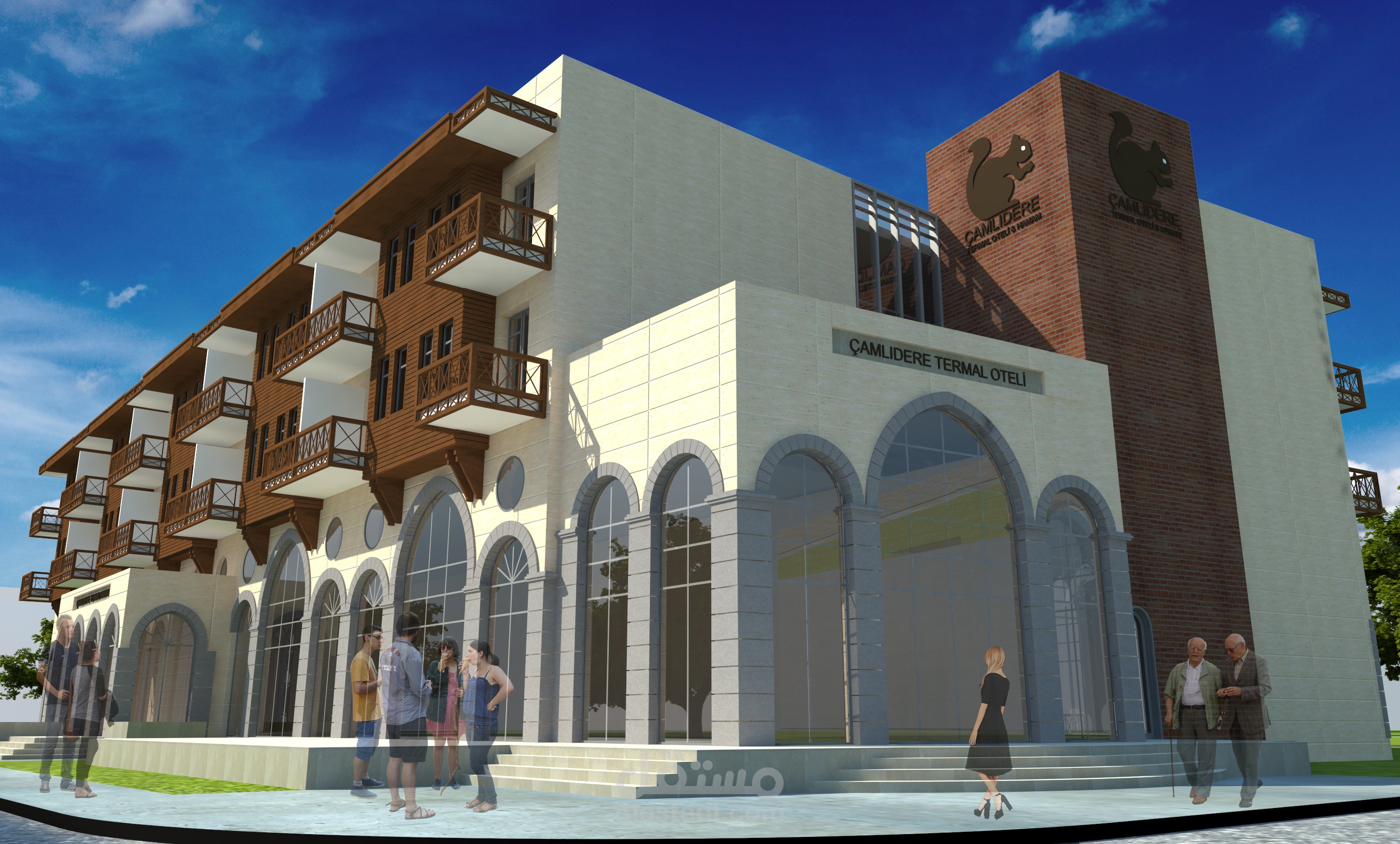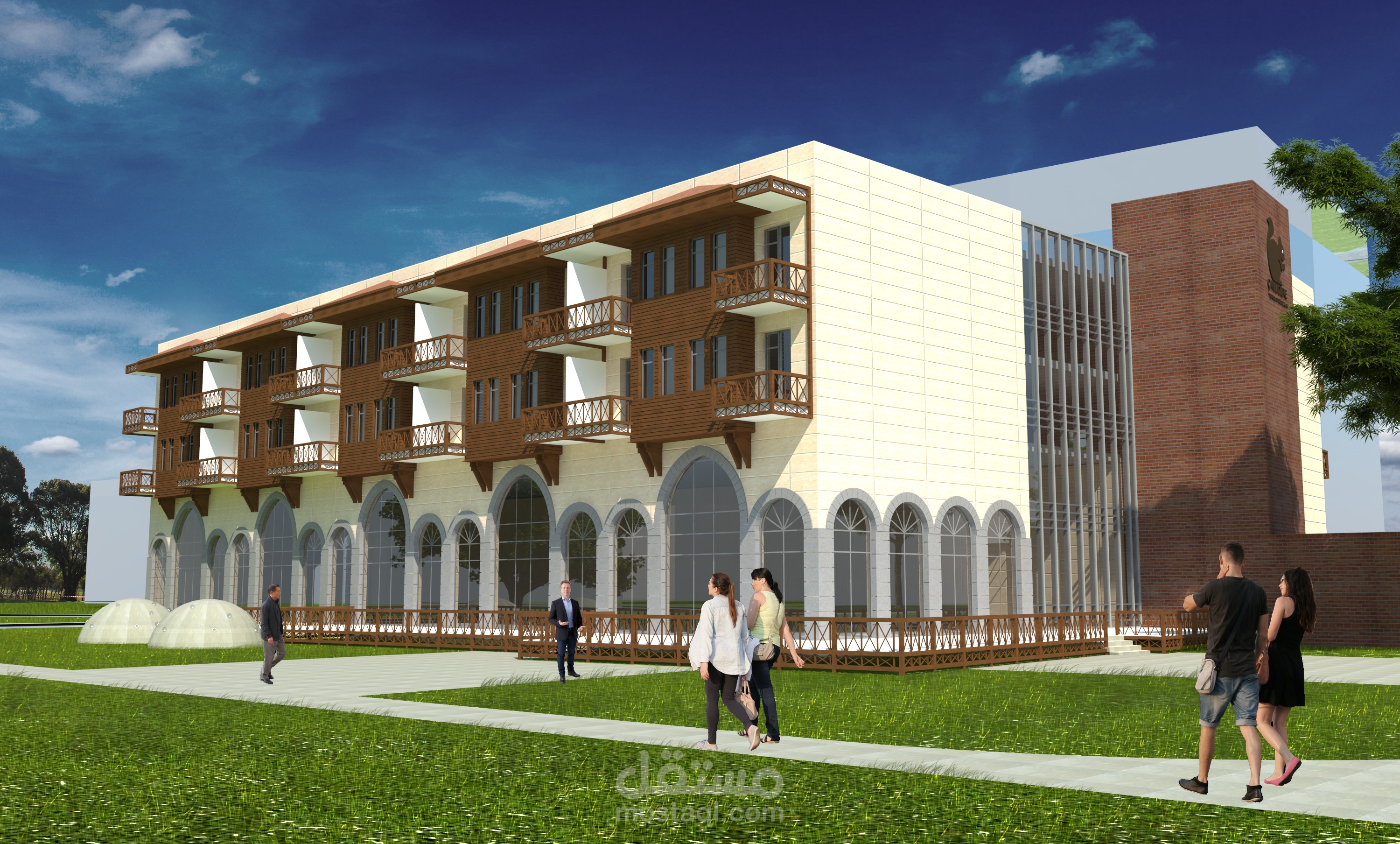 العمل على تصميم فندق وتقديم المرحلة الاولية منه و فكرت التصميم تعتمد على طراز العمارة التركية باستعمال الحجر للطوابق الاولى و الاخشاب في الطوابق الاخرى