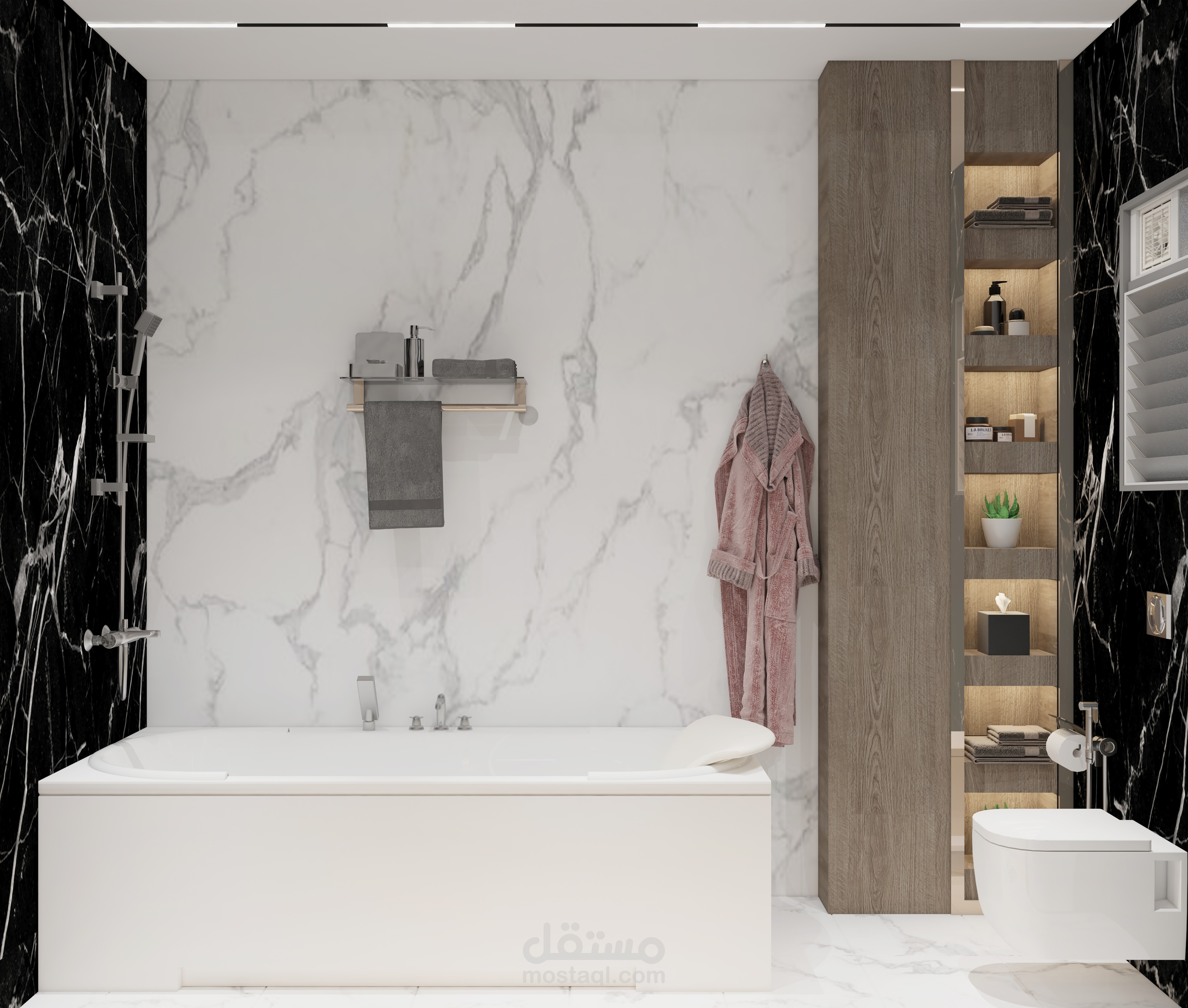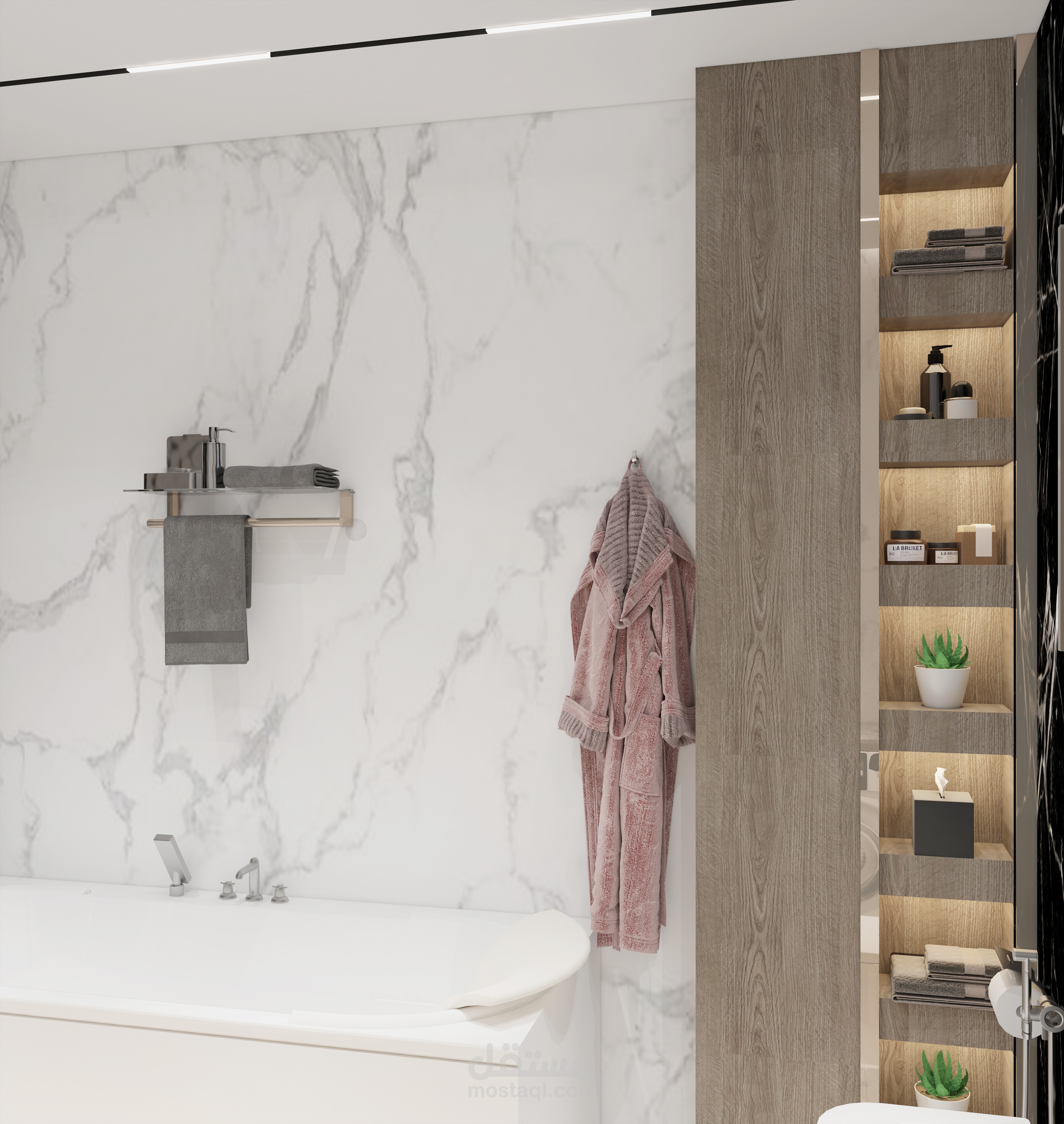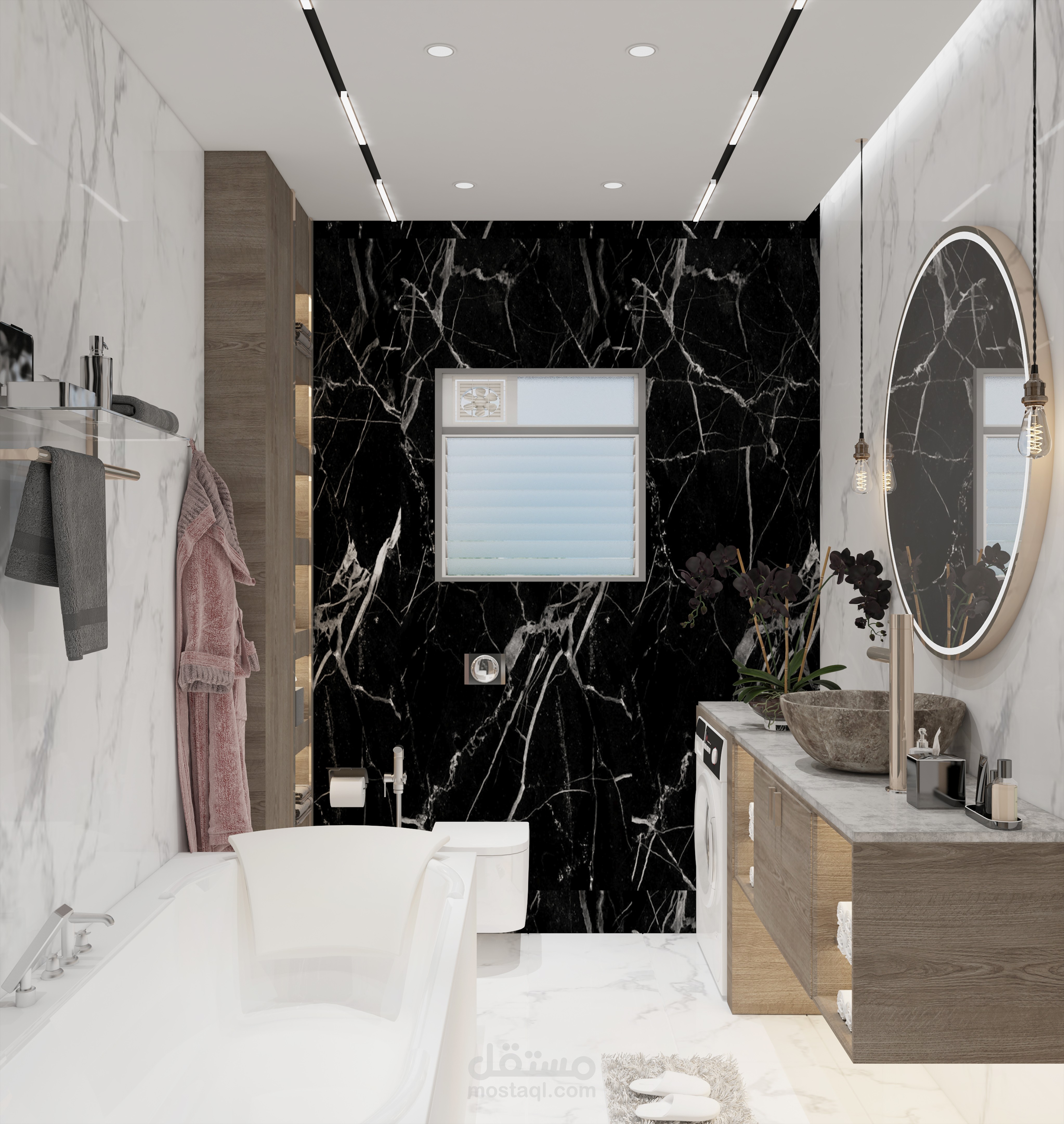 التصميم يوازن بين الجمال والوظيفة، حيث تم توزيع التجهيزات والإضاءة بطريقة مدروسة تضمن أقصى درجات الراحة وتحوّل الحمام إلى مساحة مثالية للاسترخاء والعناية الشخصية.