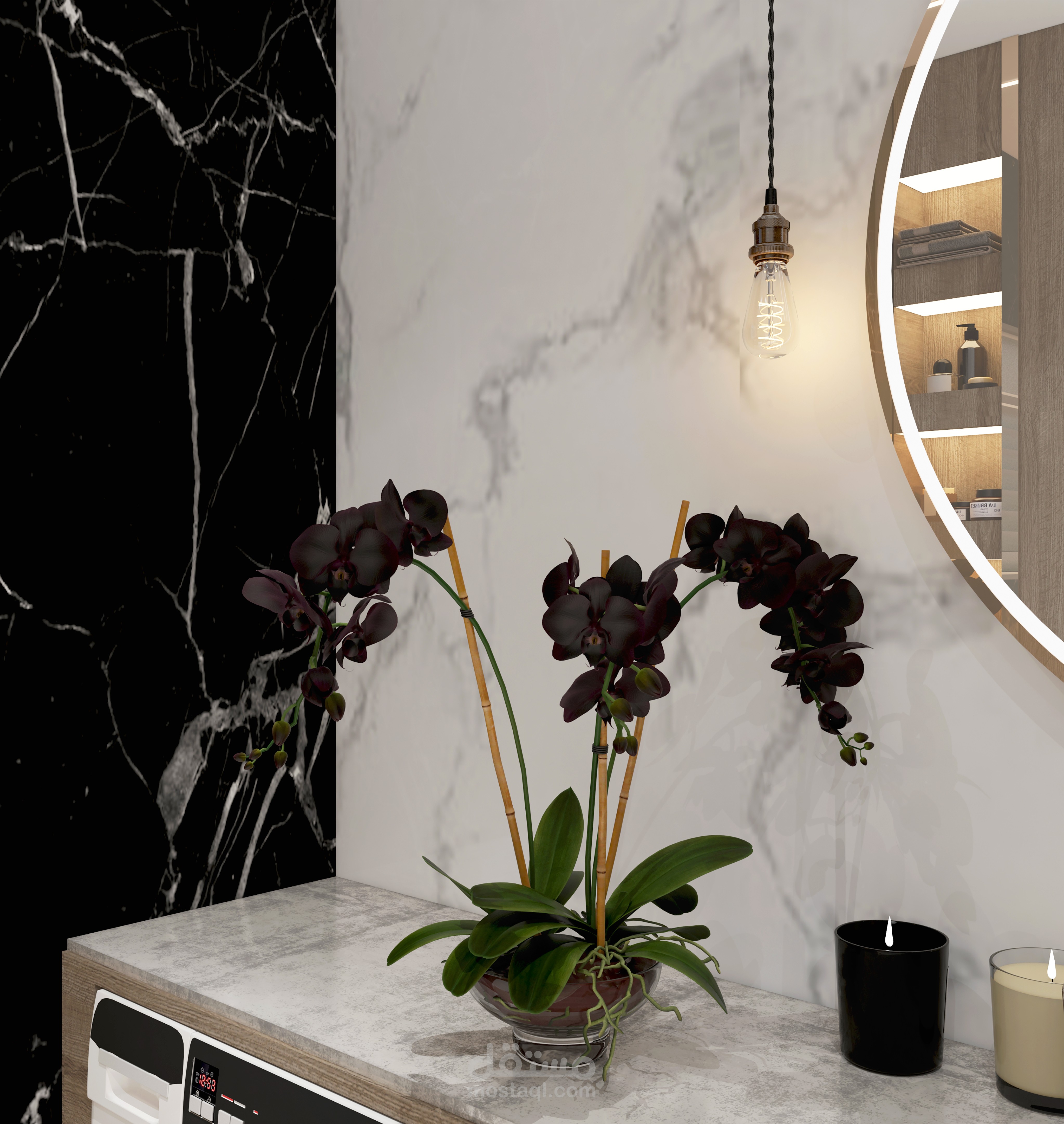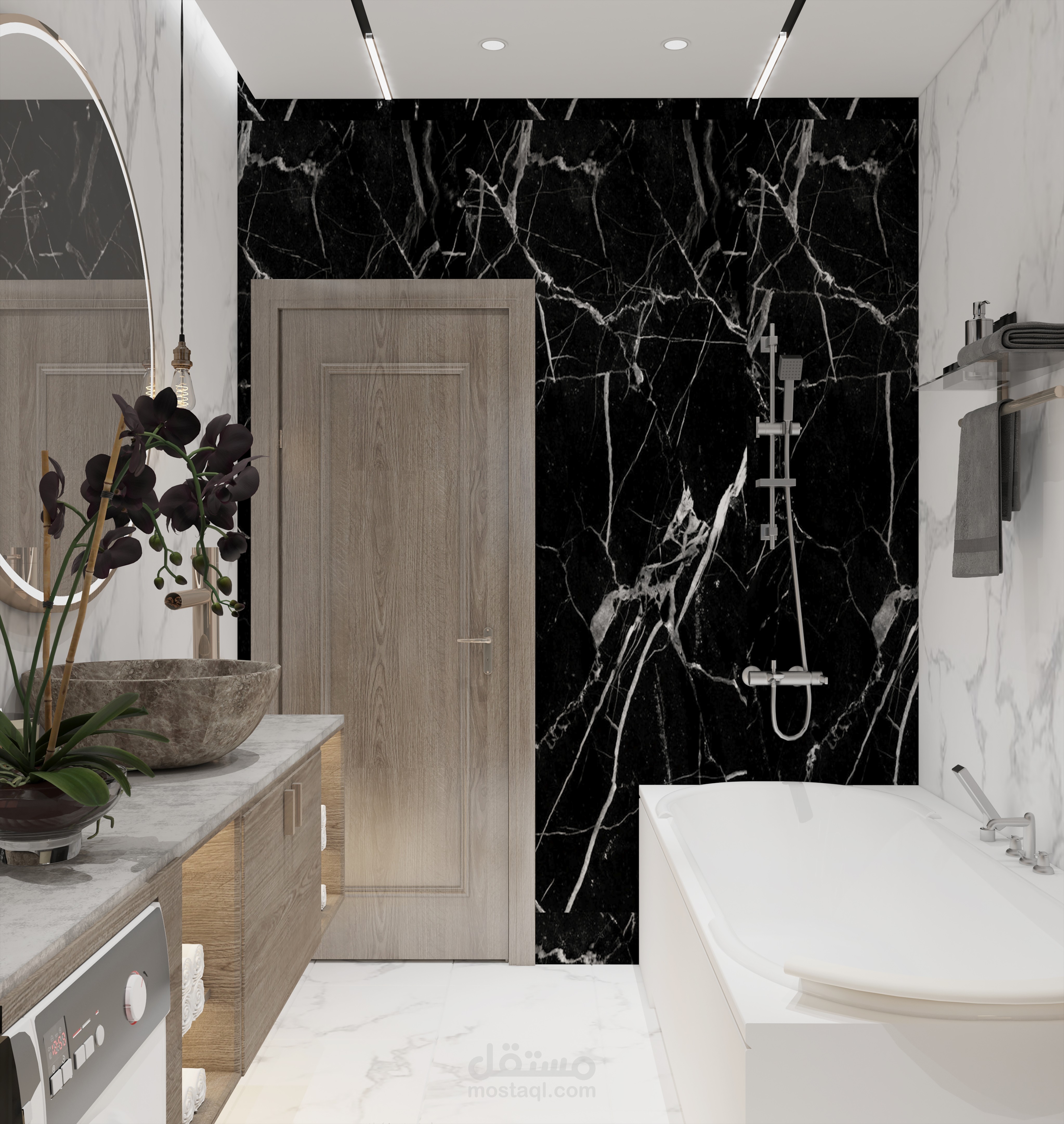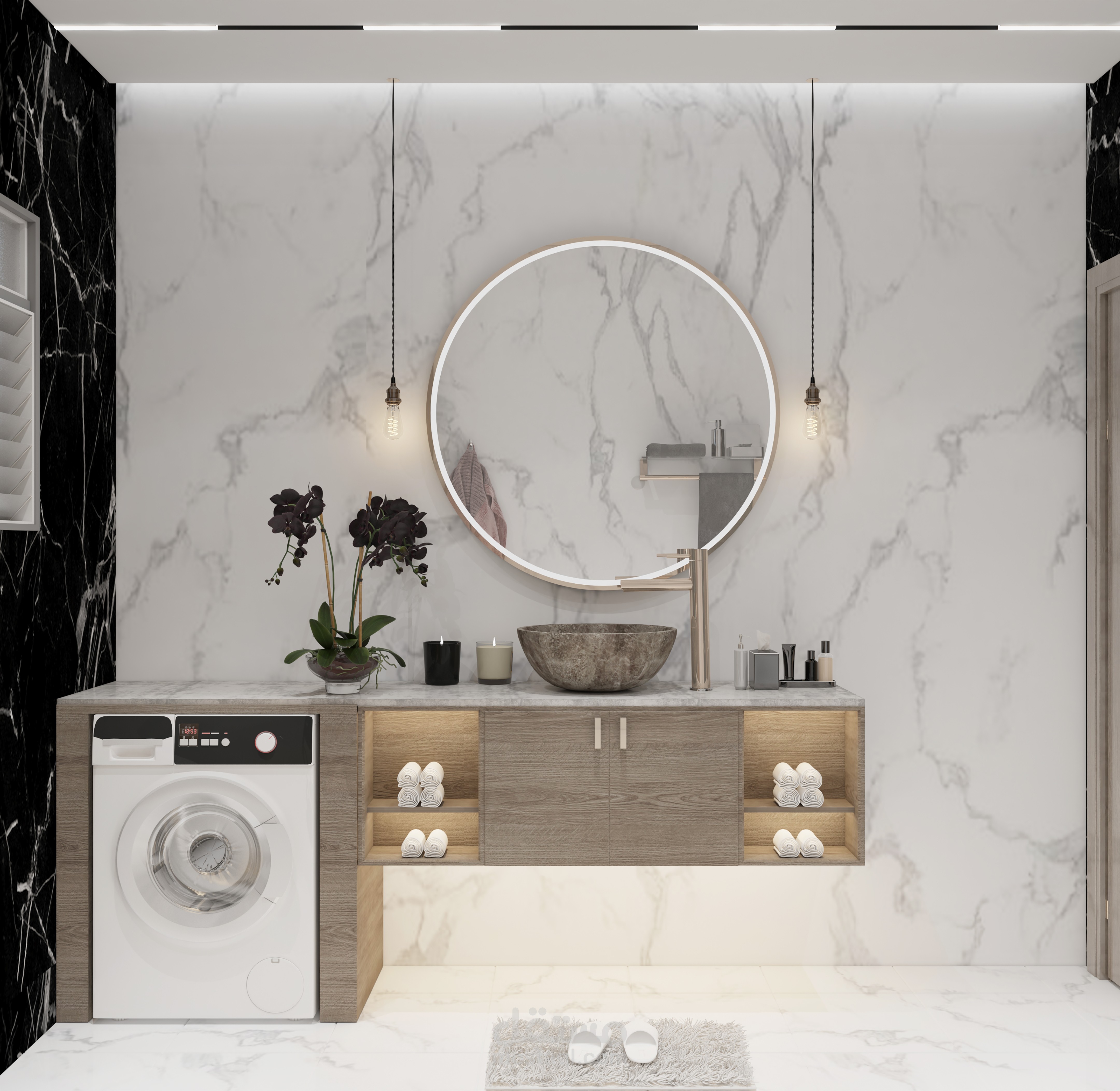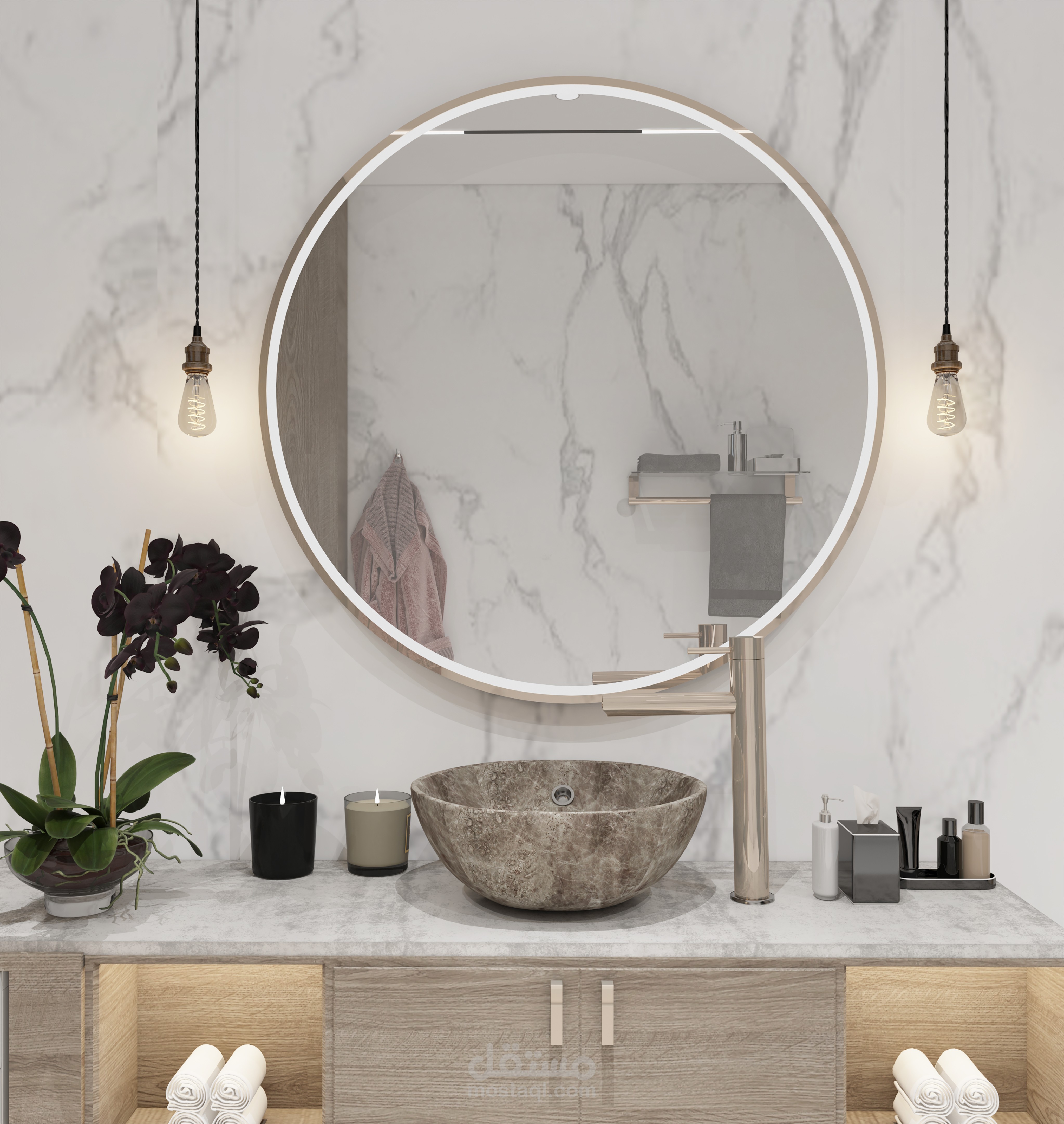 تم اختيار لوحة ألوان هادئة تعكس النقاء والانتعاش، مع استخدام خامات طبيعية مقاومة للرطوبة تعزز الإحساس بالفخامة العصرية.