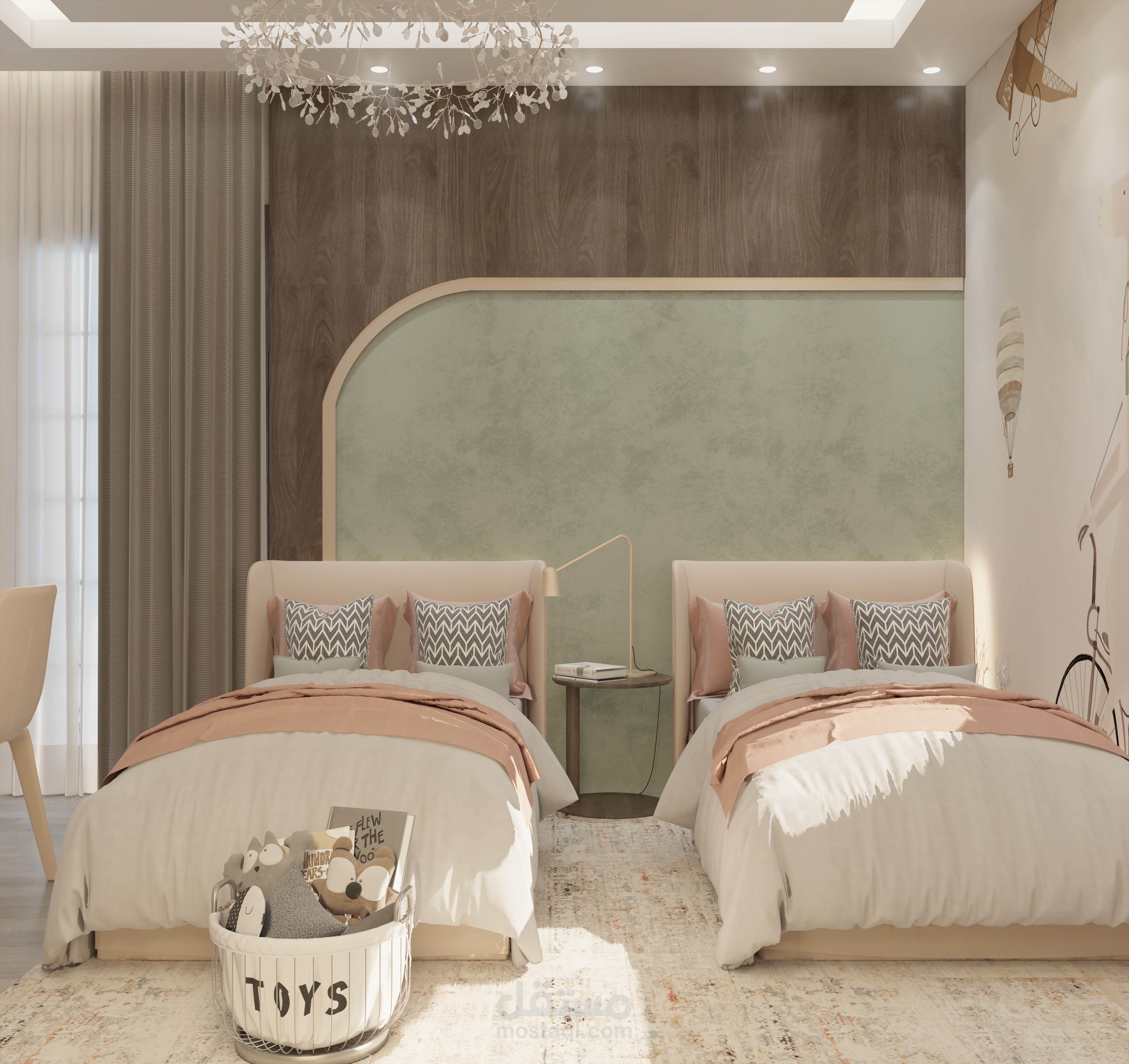 التصميم يوازن بين الجمال والوظيفة، حيث تم توزيع الأثاث والإضاءة بطريقة مدروسة تضمن أقصى درجات الراحة وتجعل الغرفة مساحة مثالية للاسترخاء والخصوصية.