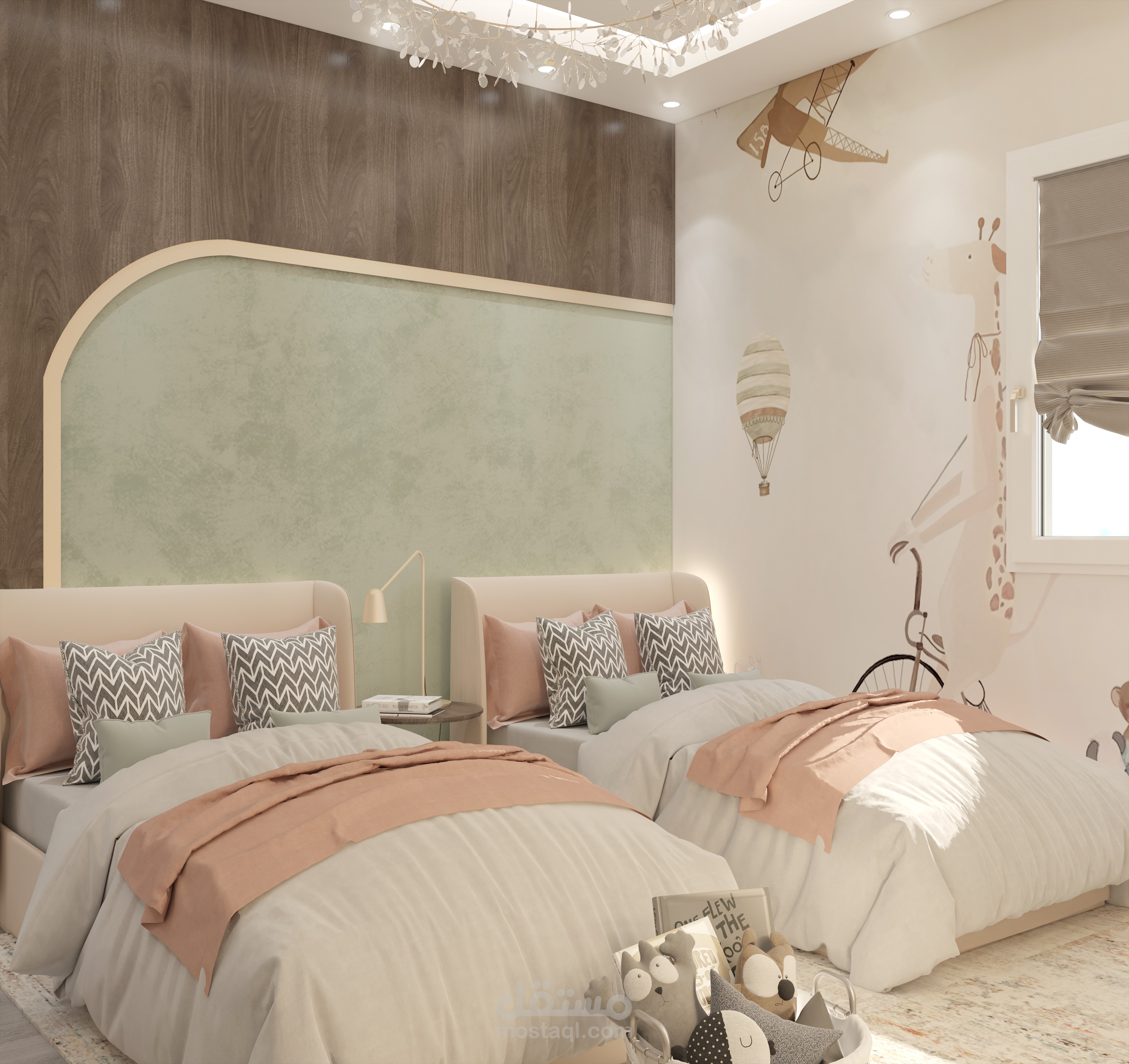 تم اختيار لوحة ألوان هادئة تعكس الهدوء والسكينة، مع استخدام خامات طبيعية تعزز الإحساس بالفخامة العصرية.