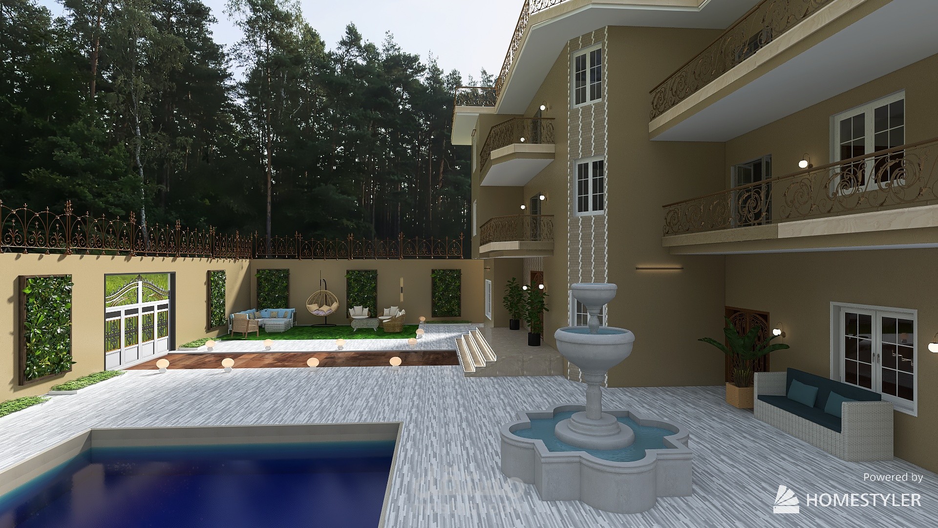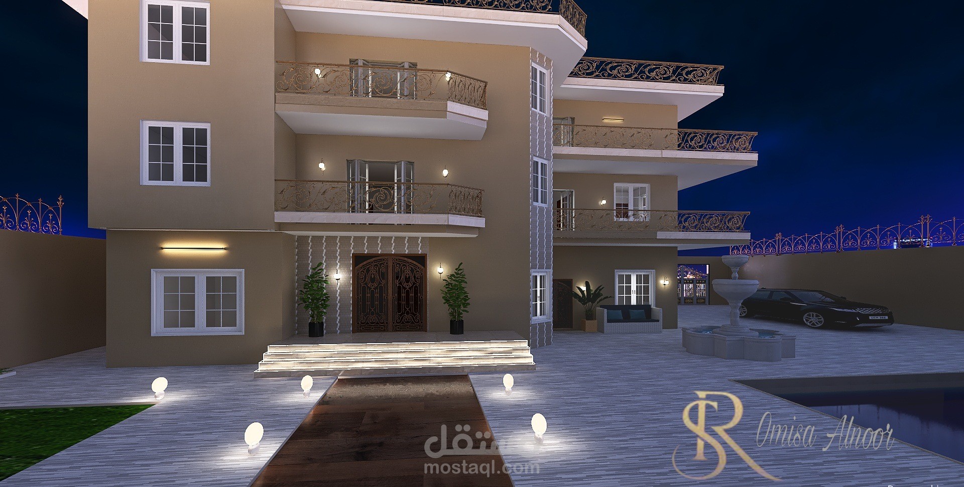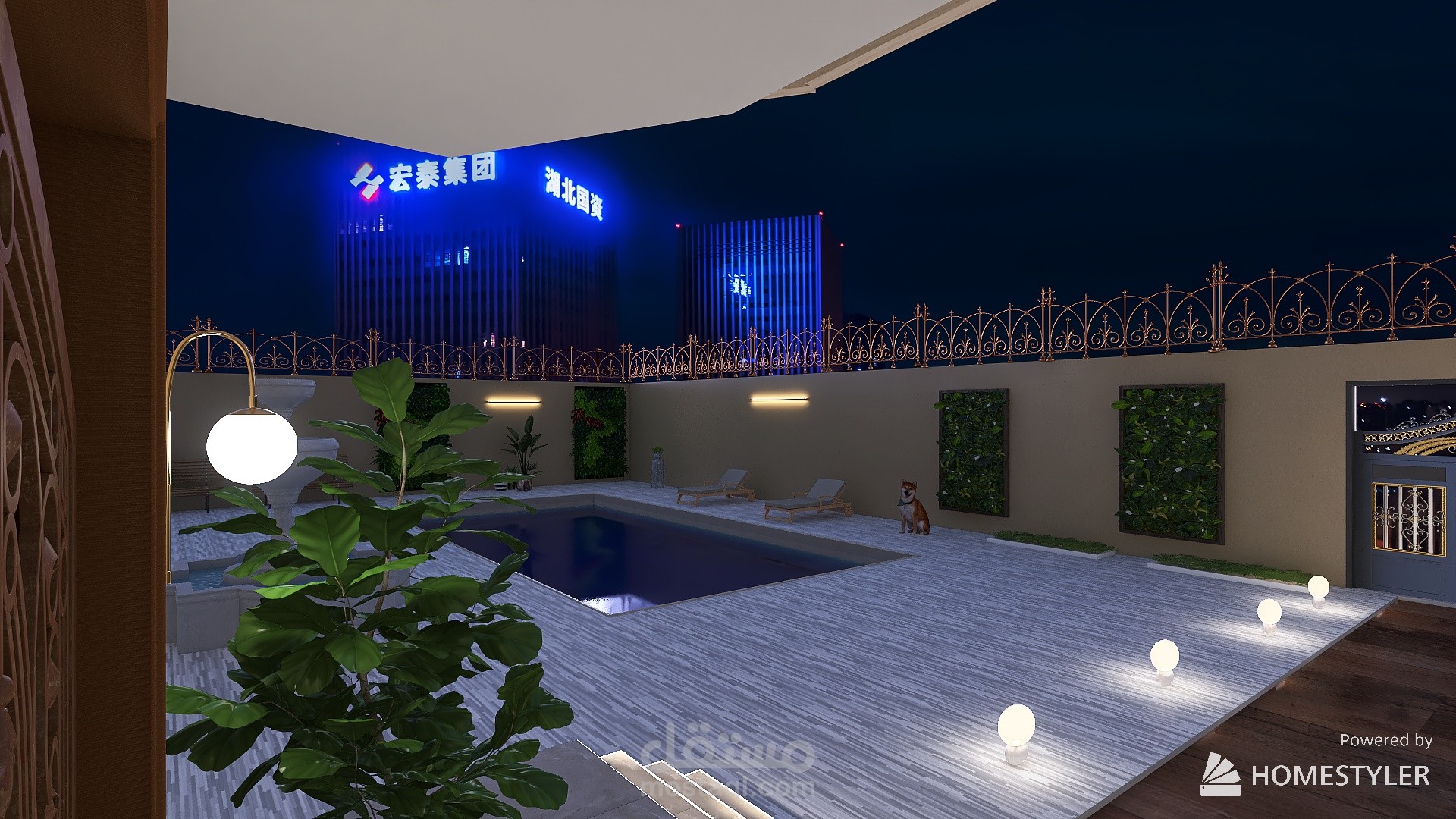 تصميم داخلي و خارجي لفيلا مع جلسة خارجية بحديقة و مسبح